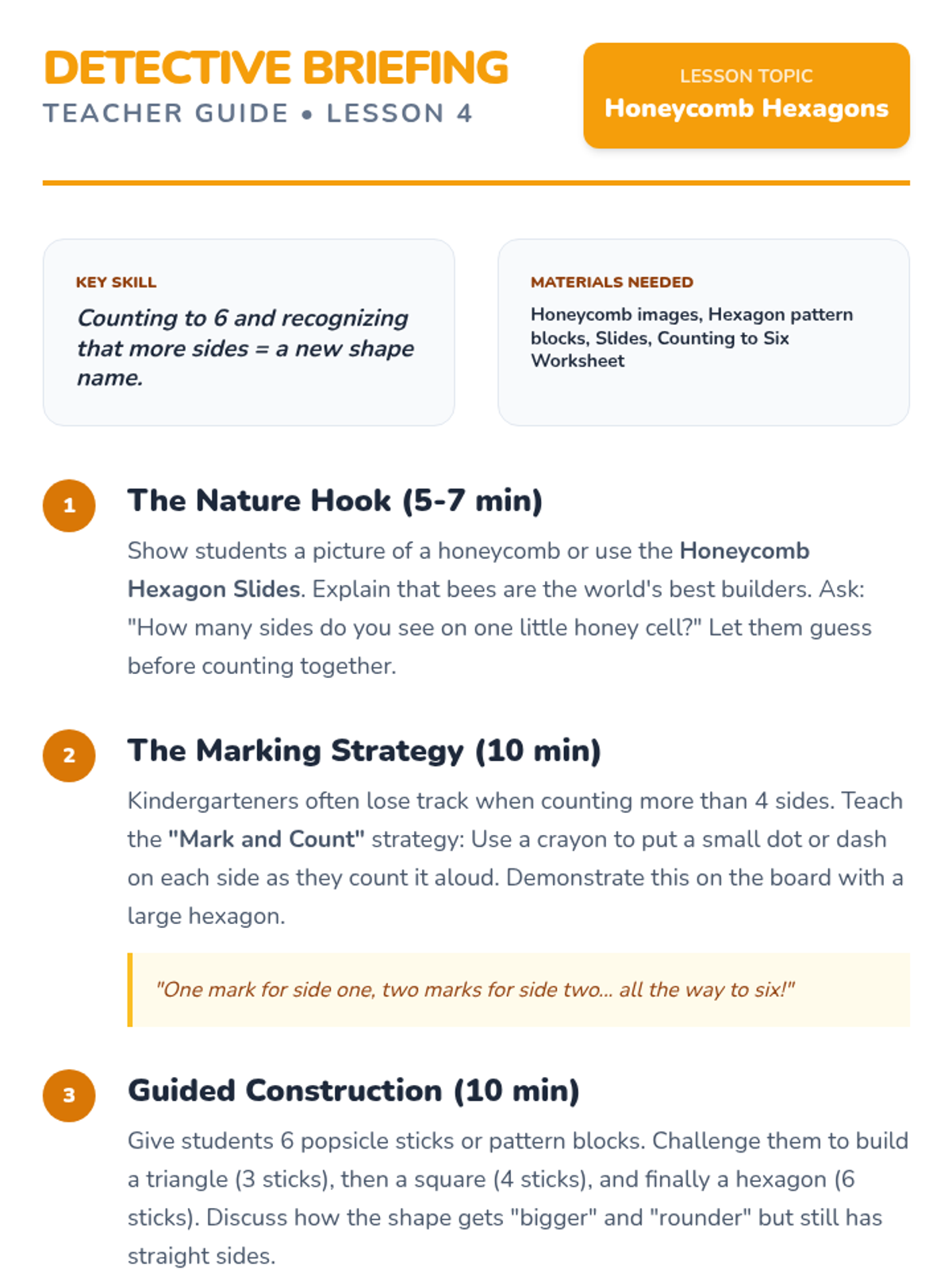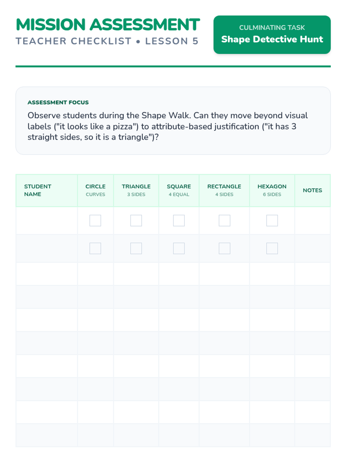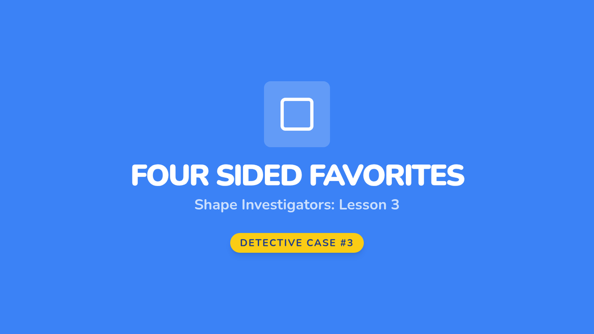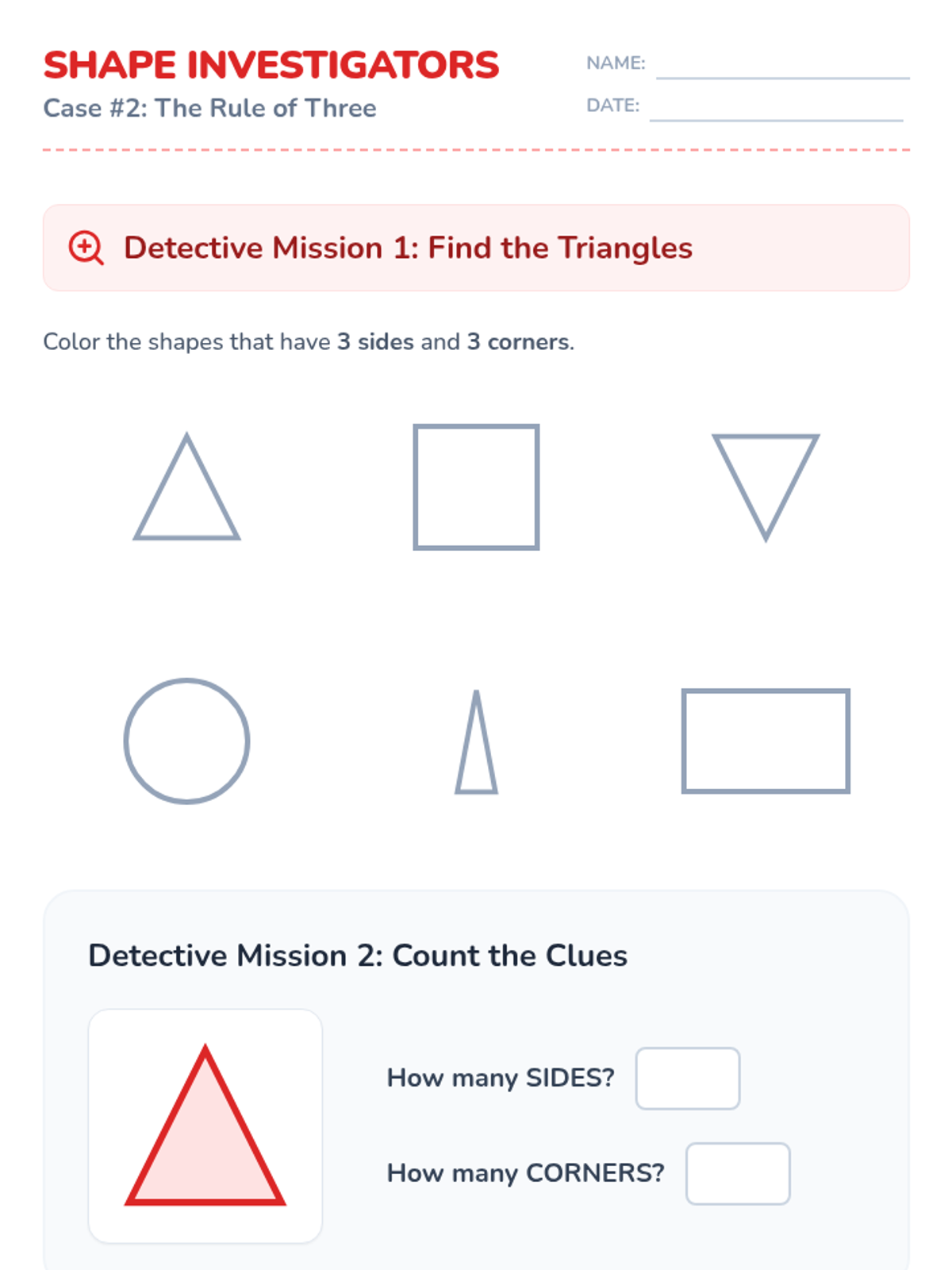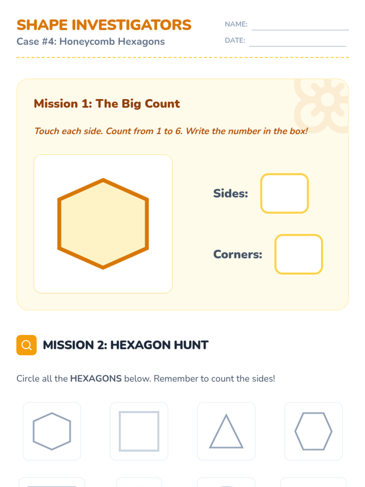 A Kindergarten math sequence that guides students from basic visual recognition of shapes to identifying 2D geometric figures by their specific attributes, such as number of sides and corners. Students progress from distinguishing curved and straight lines to classifying triangles, rectangles, squares, and hexagons.