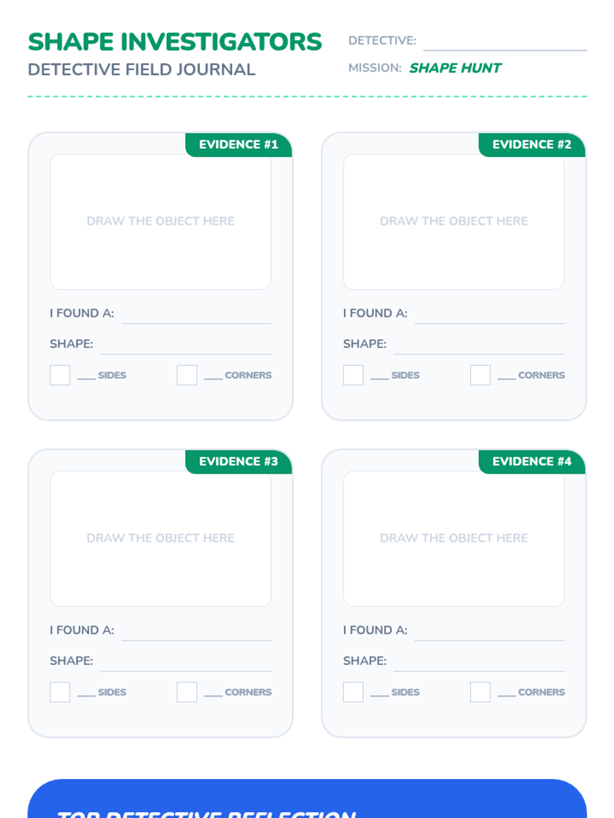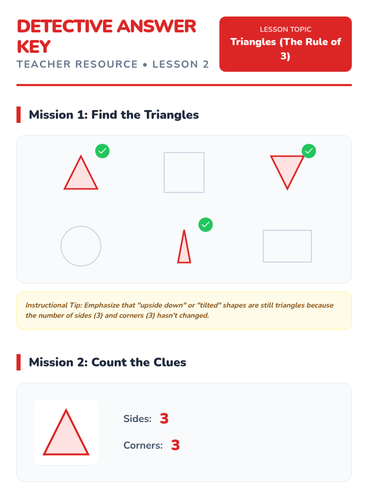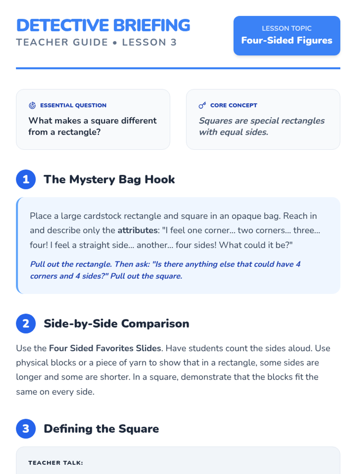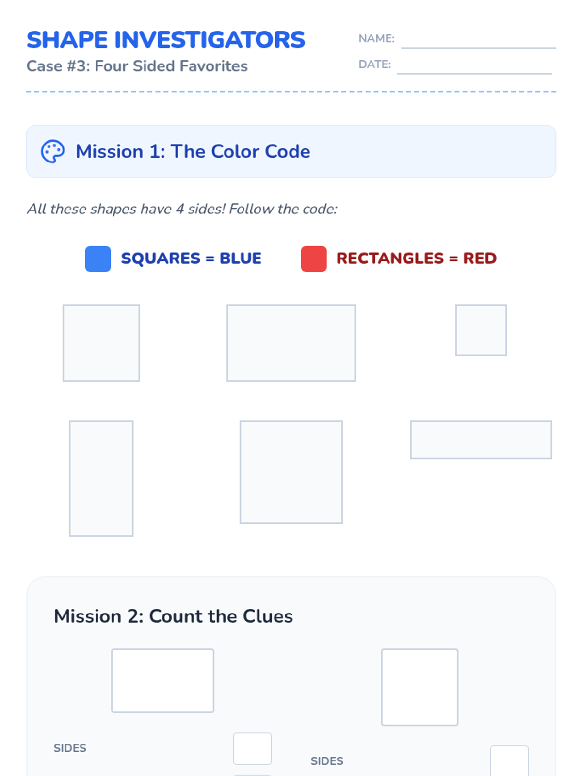 A Kindergarten math sequence that guides students from basic visual recognition of shapes to identifying 2D geometric figures by their specific attributes, such as number of sides and corners. Students progress from distinguishing curved and straight lines to classifying triangles, rectangles, squares, and hexagons.
