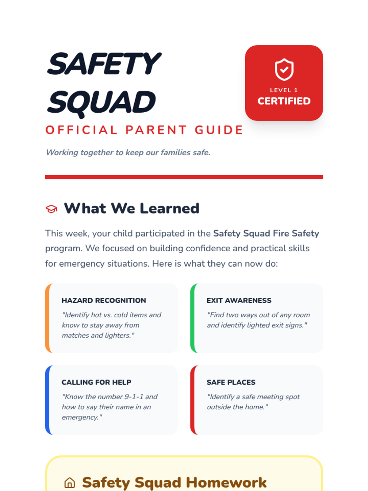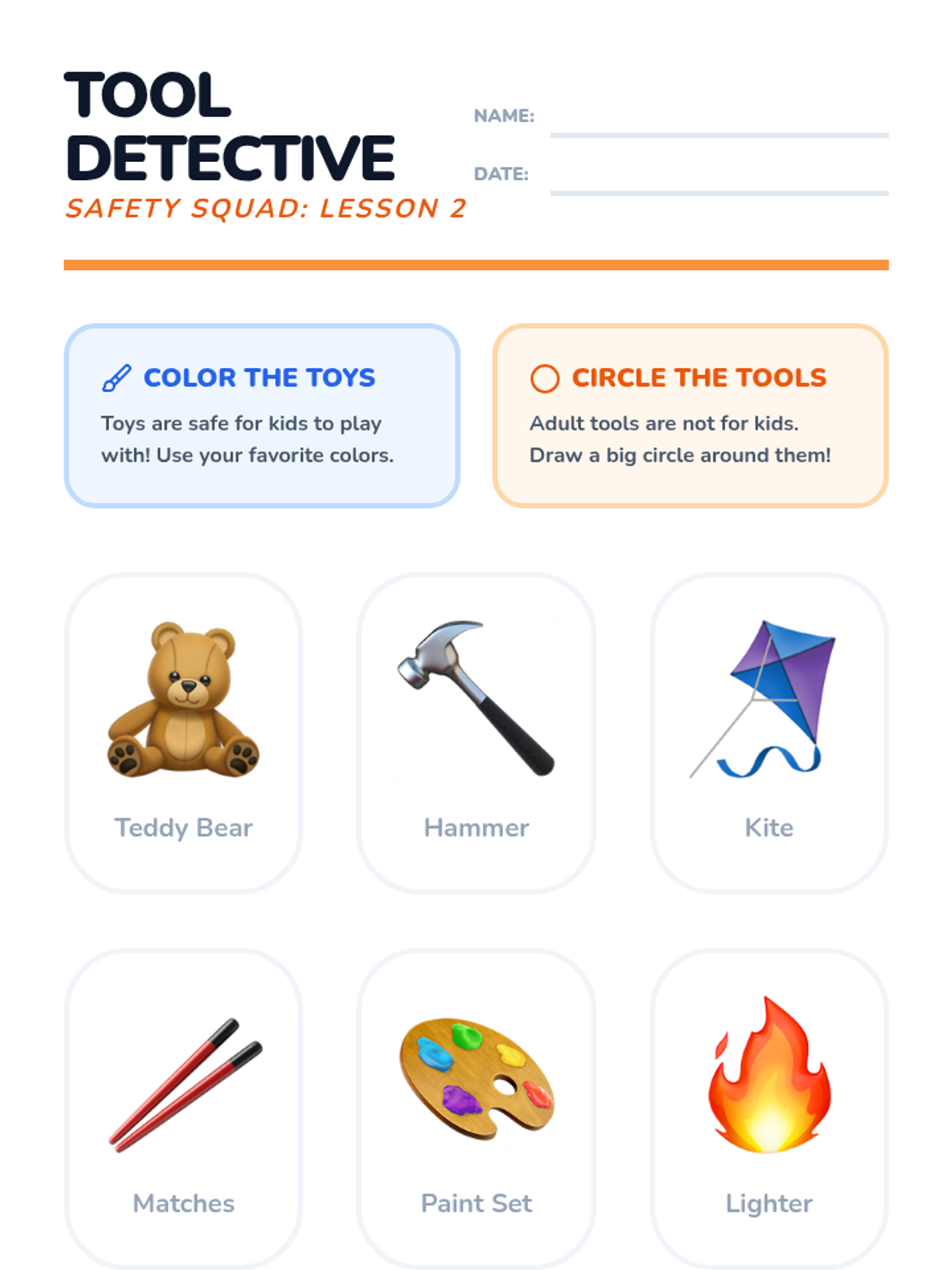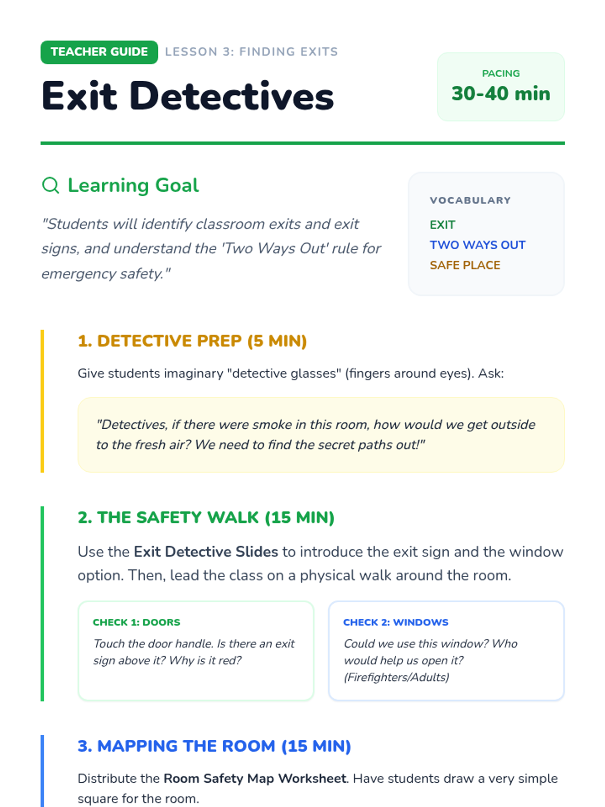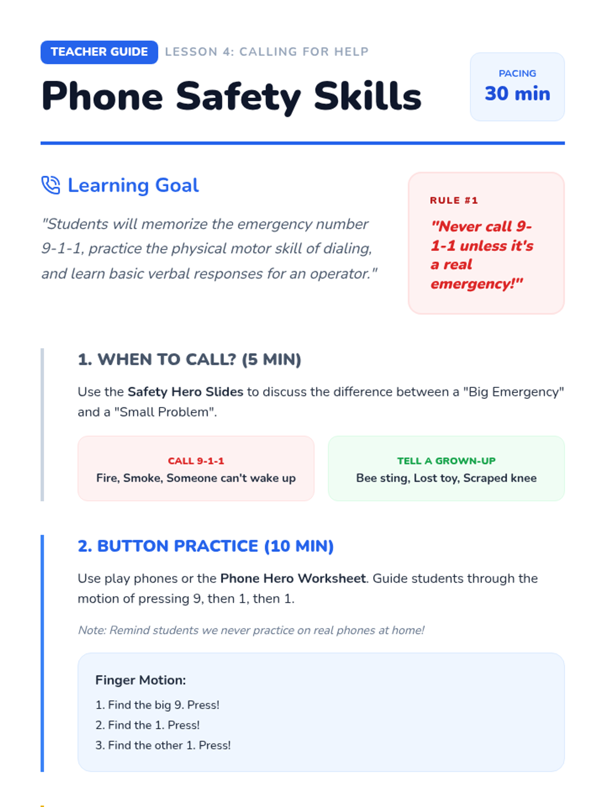 A comprehensive fire safety sequence for Pre-K students focused on hazard recognition, distinguishing tools from toys, and identifying emergency exits. Students learn through visual discrimination, role-play, and mapping to build confidence in emergency situations.