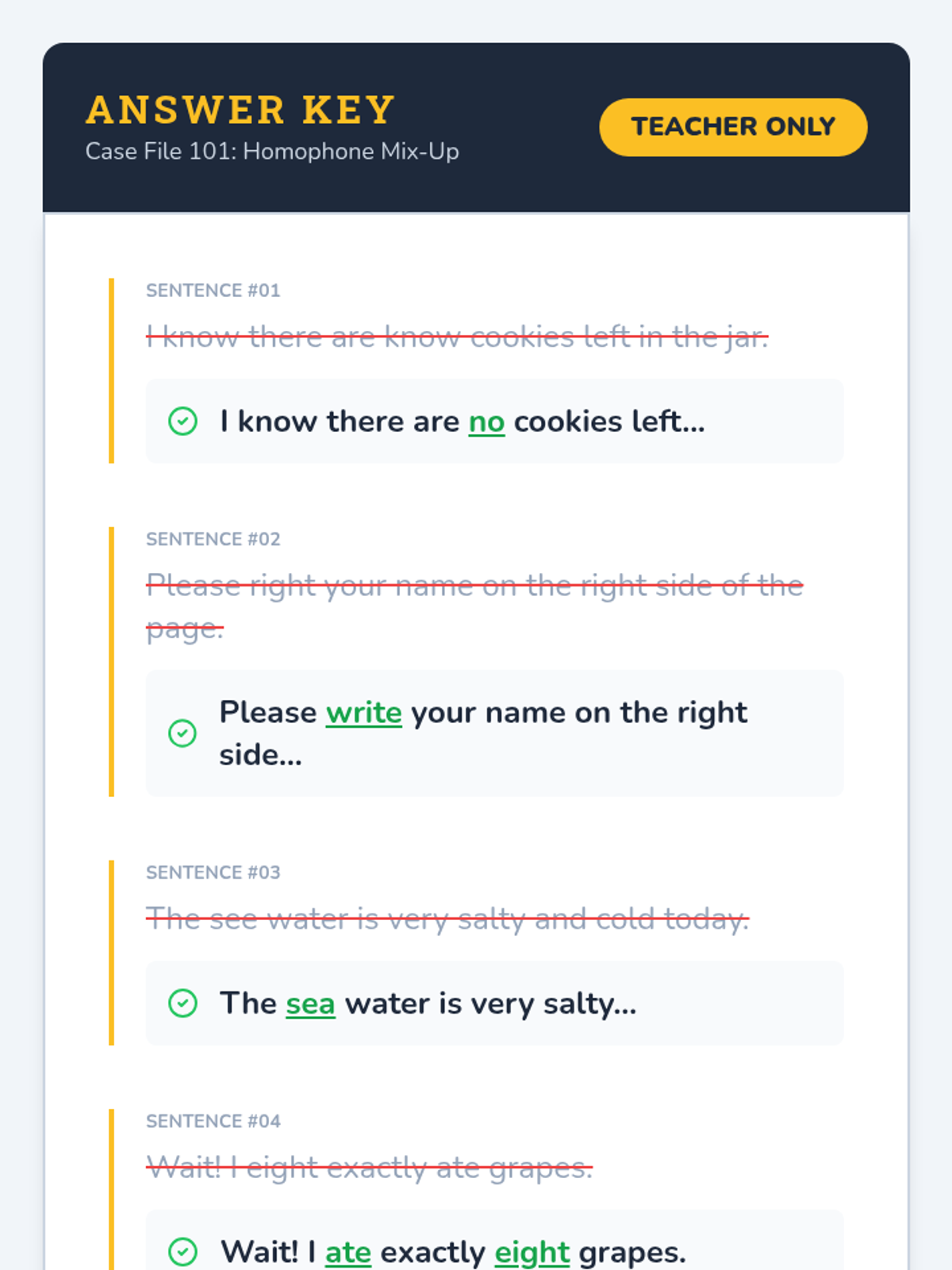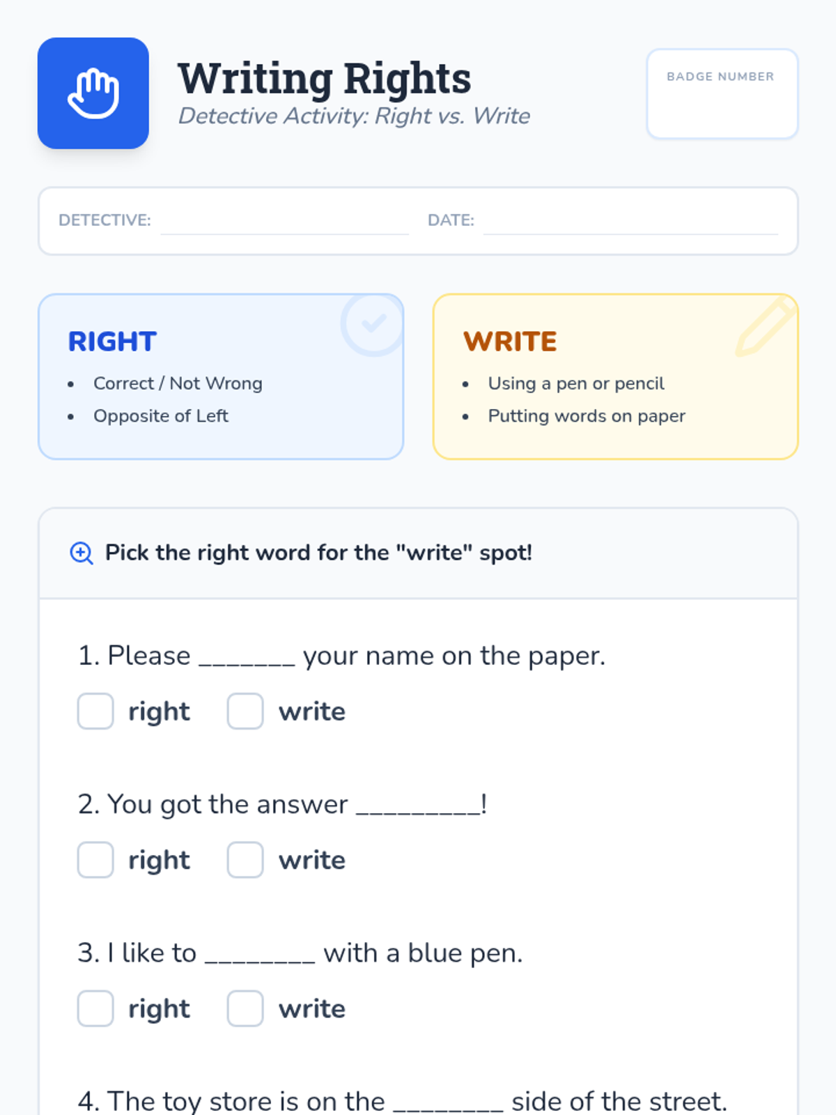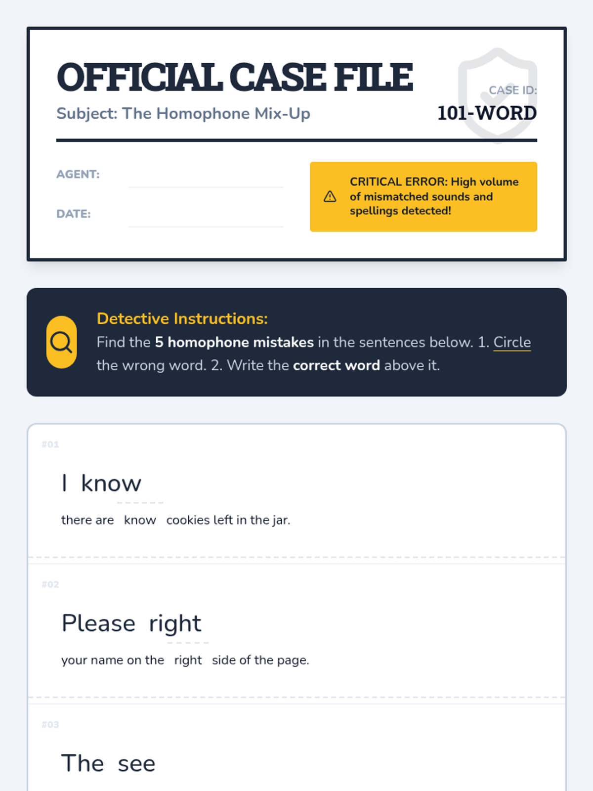 A 1st-grade ELA sequence where students become 'Word Detectives' to identify and correct homophones like no/know and right/write in context. Through inquiry and hands-on investigation, students learn why spelling matters for meaning.