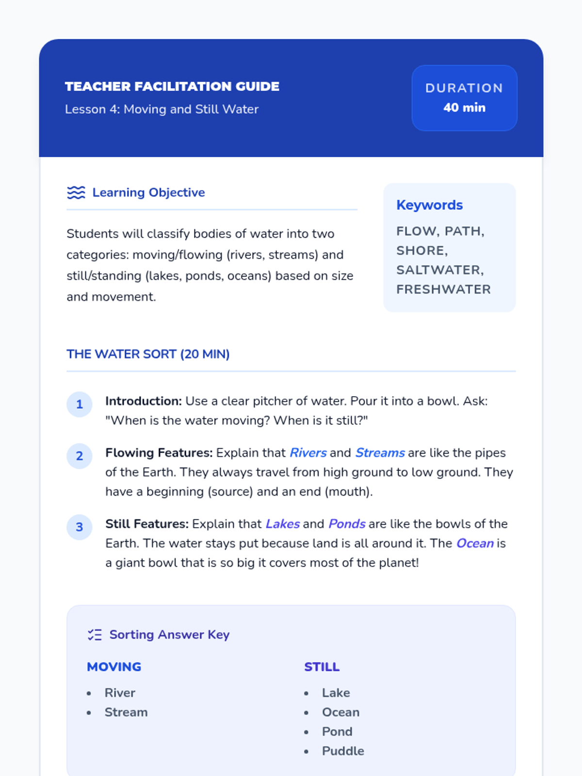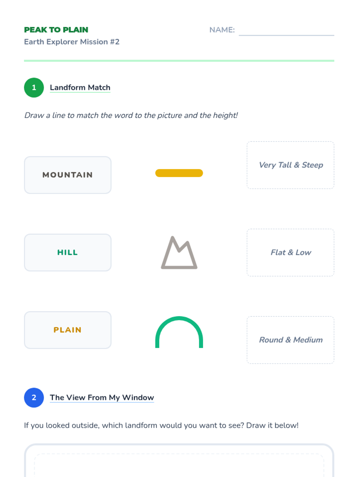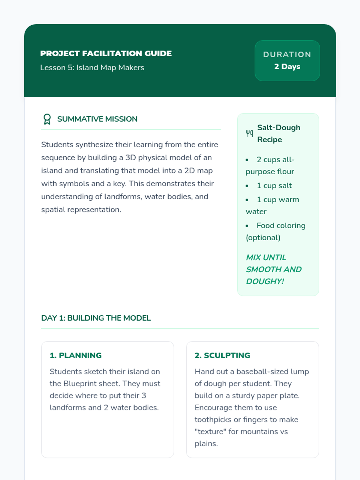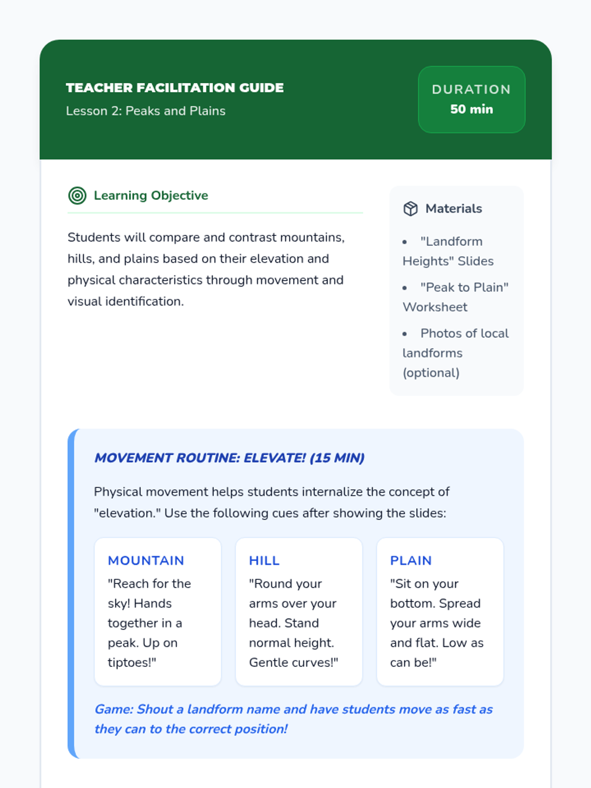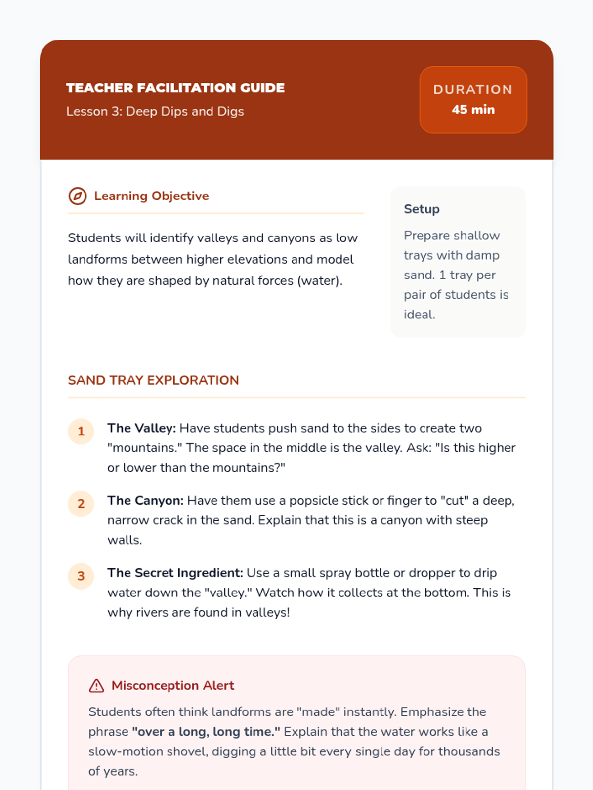 A foundational Earth science sequence for 1st-grade students to identify landforms and water bodies, culminating in 3D modeling and 2D mapping. Students act as geographers to explore the physical features of the Earth's surface through games, movement, and hands-on creation.