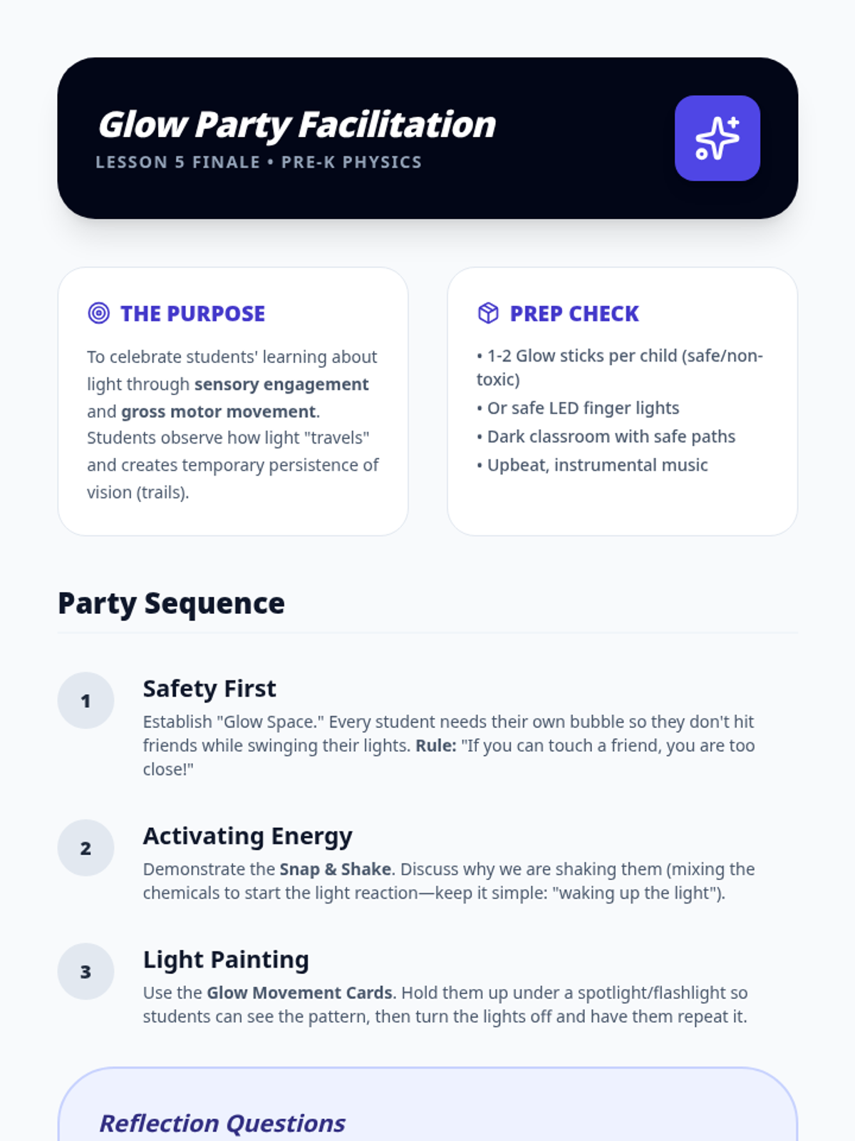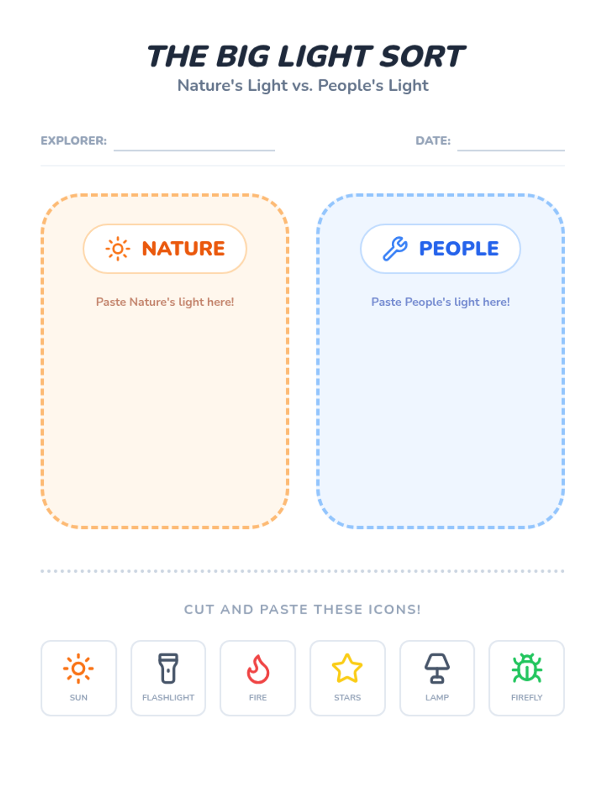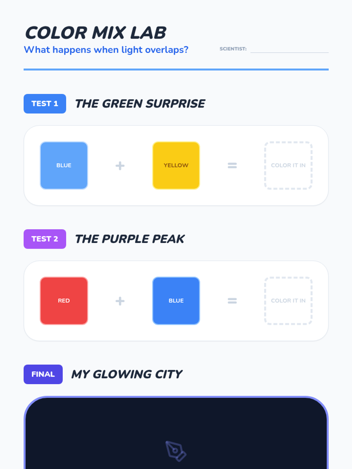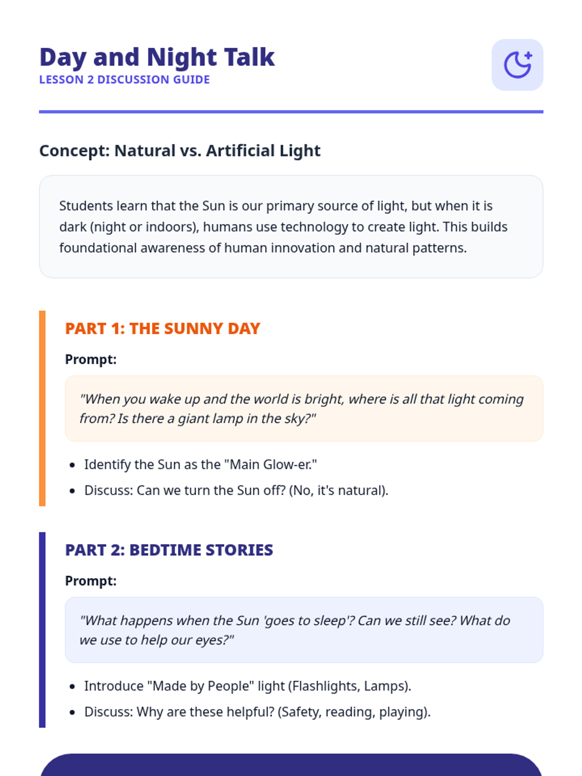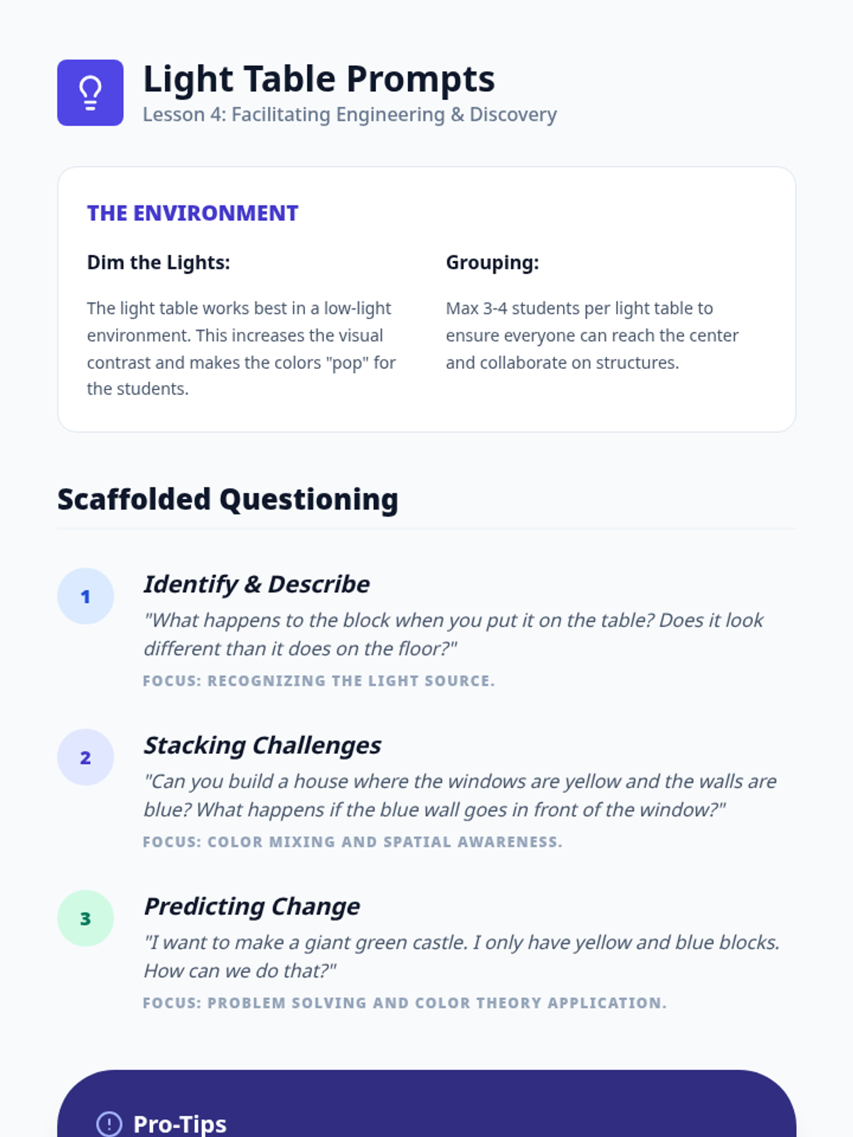 A Pre-K science sequence exploring light sources, natural vs. artificial light, rainbows, color mixing, and sensory light play. Students engage in inquiry-based hunts, sorting activities, and engineering with light tables.