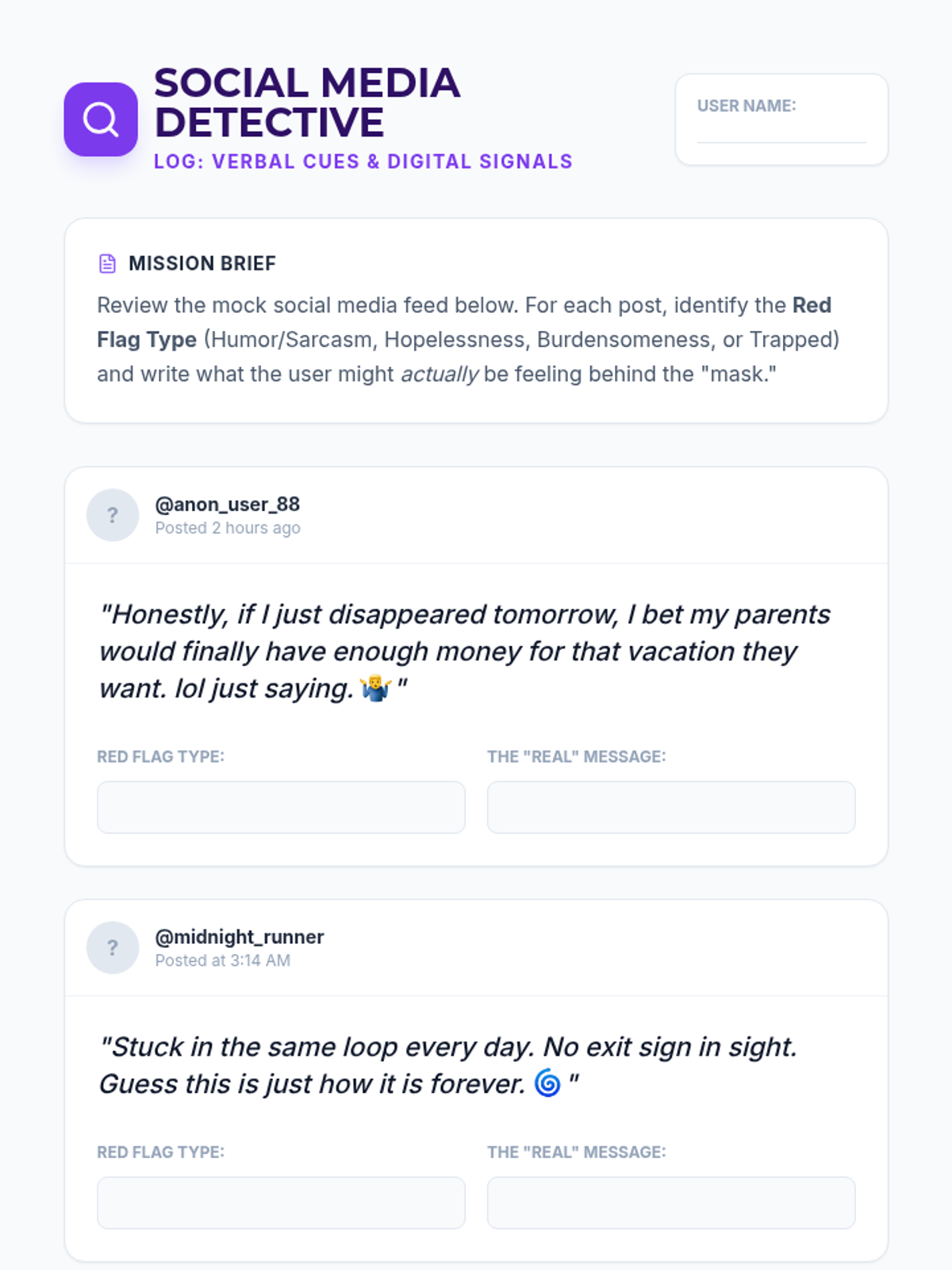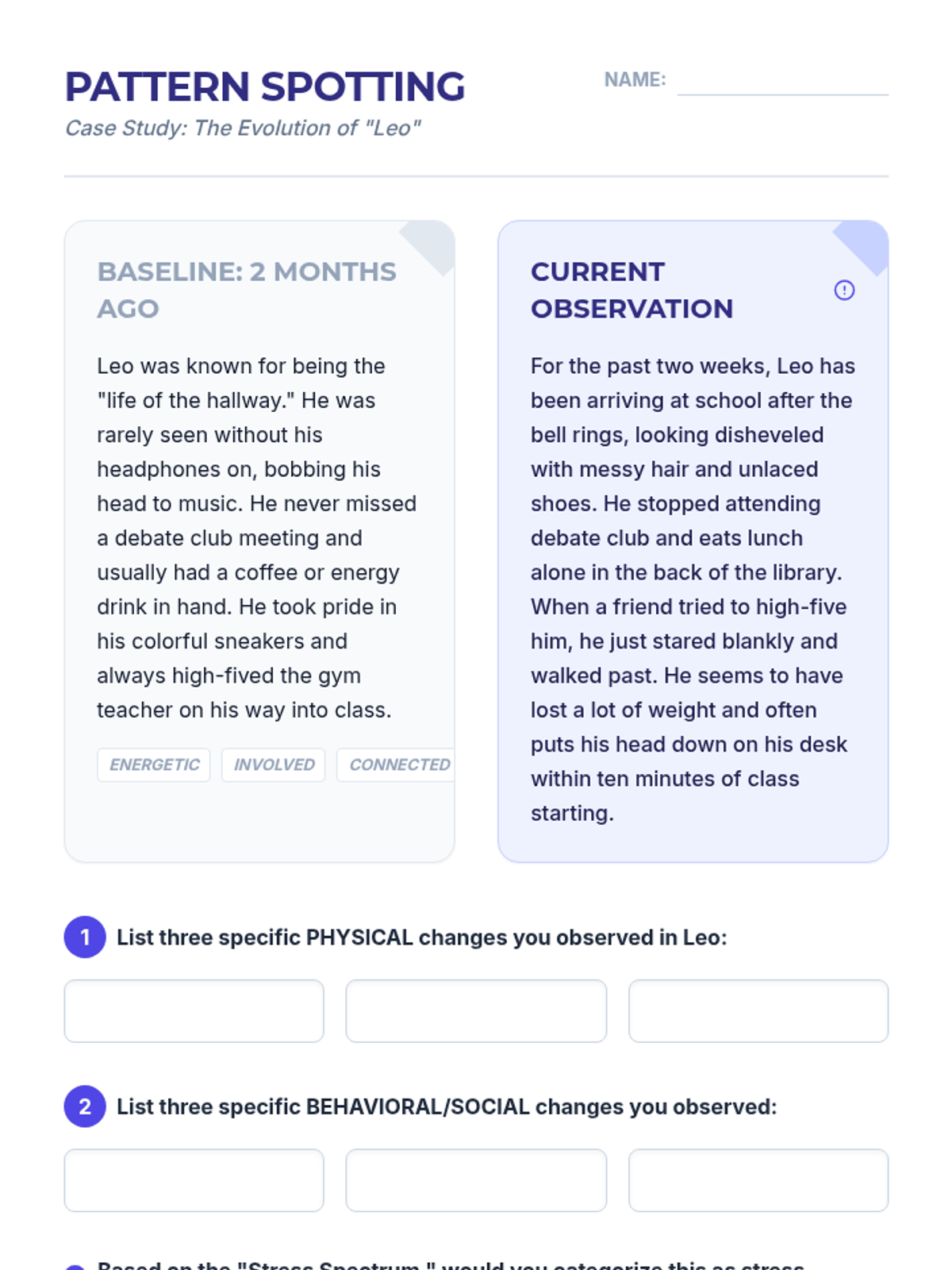 This sequence equips 8th-grade students with observational skills to distinguish between typical adolescent stress and mental health crises. Through scenario analysis, behavioral red flags, and empathy building, students learn when and how to seek adult intervention.