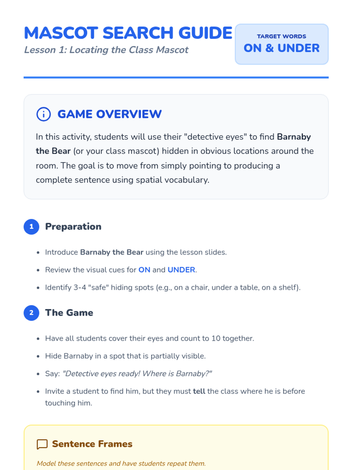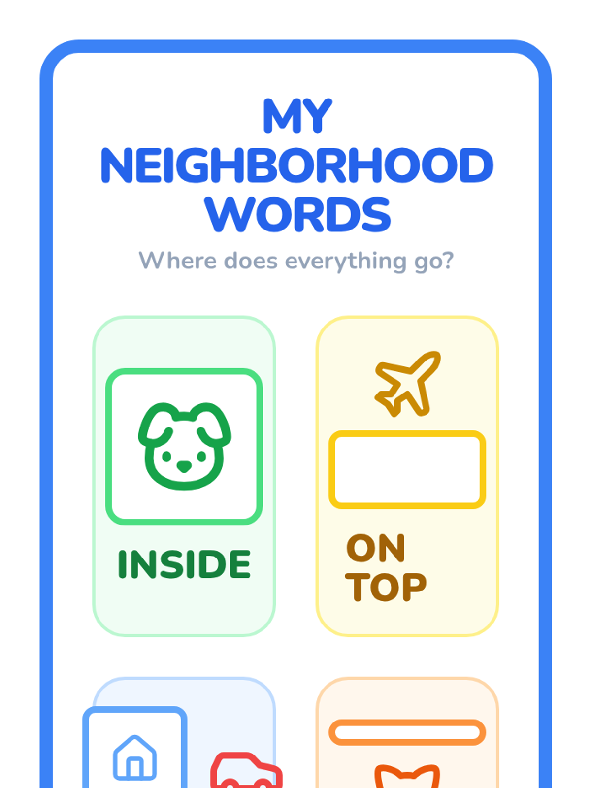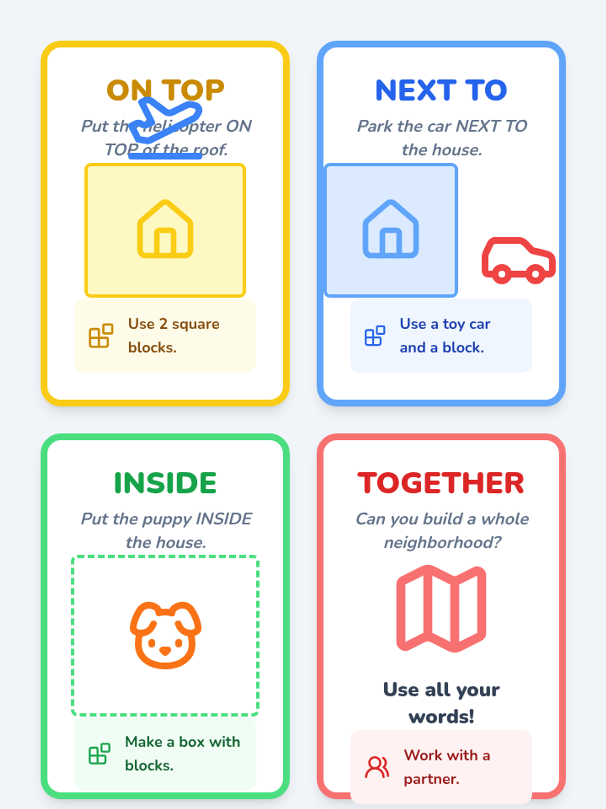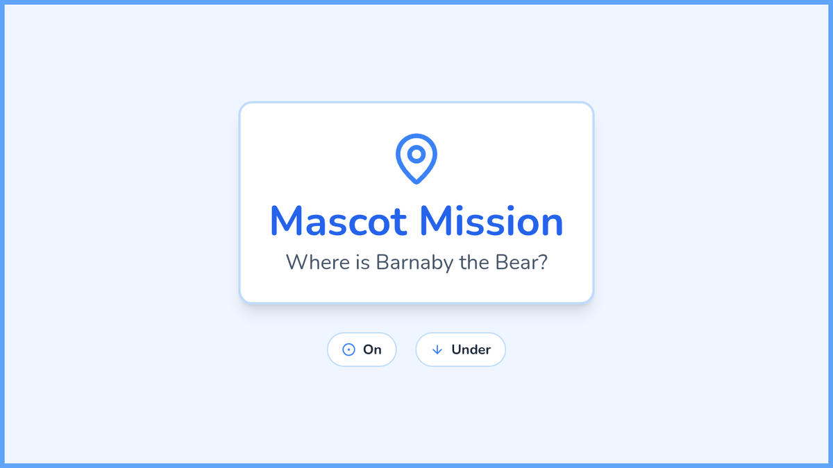 A Pre-K sequence focused on spatial vocabulary and location words. Students move from finding a class mascot to creating complex neighborhoods and giving directions, mastering terms like 'on,' 'under,' 'above,' and 'below.'