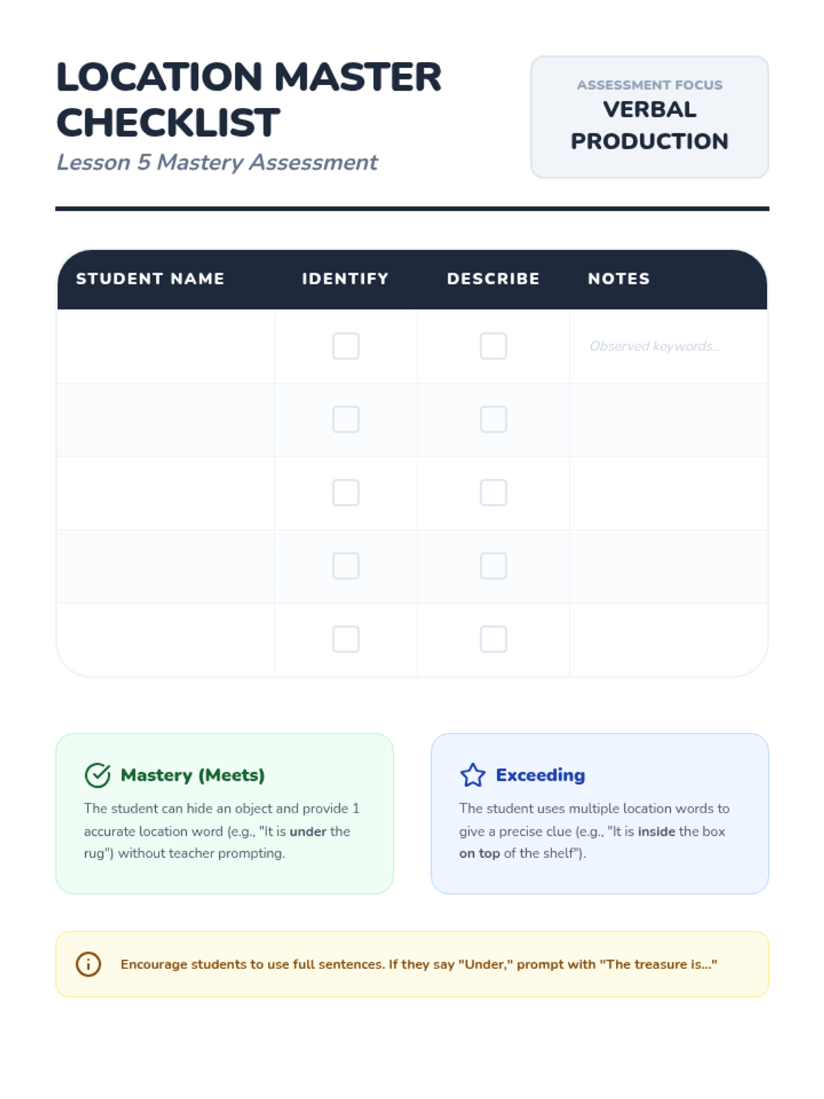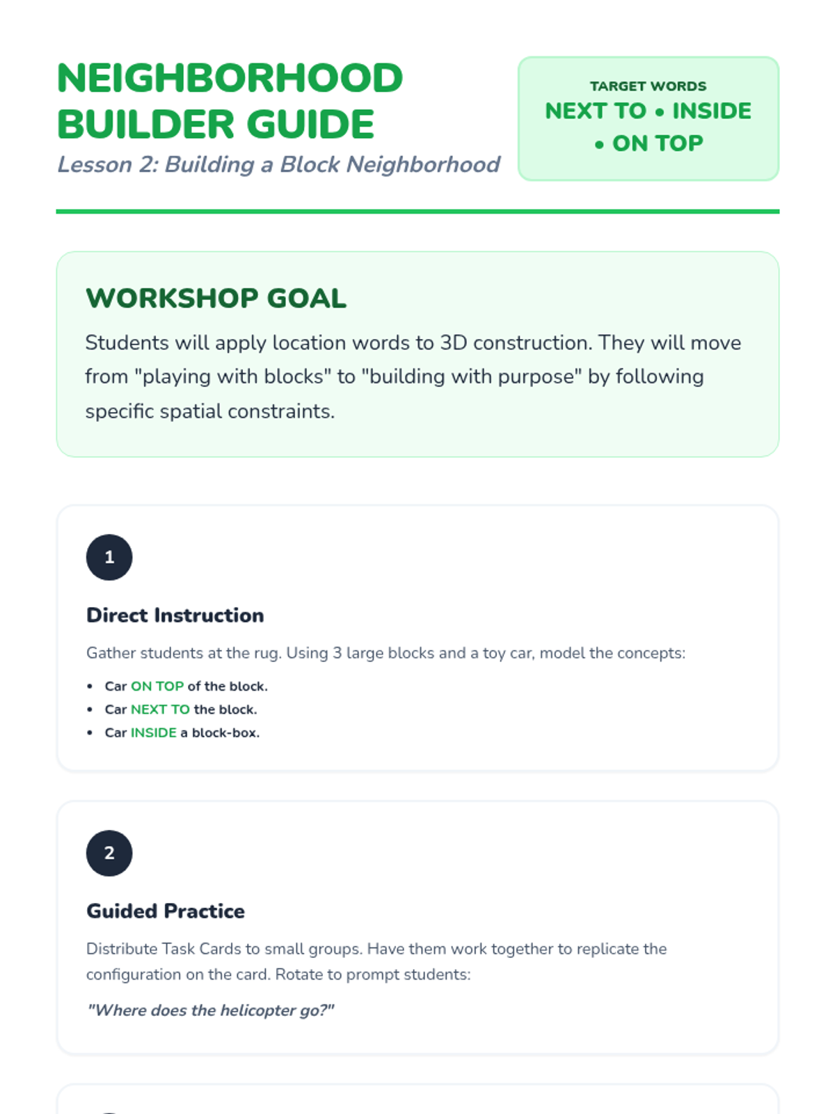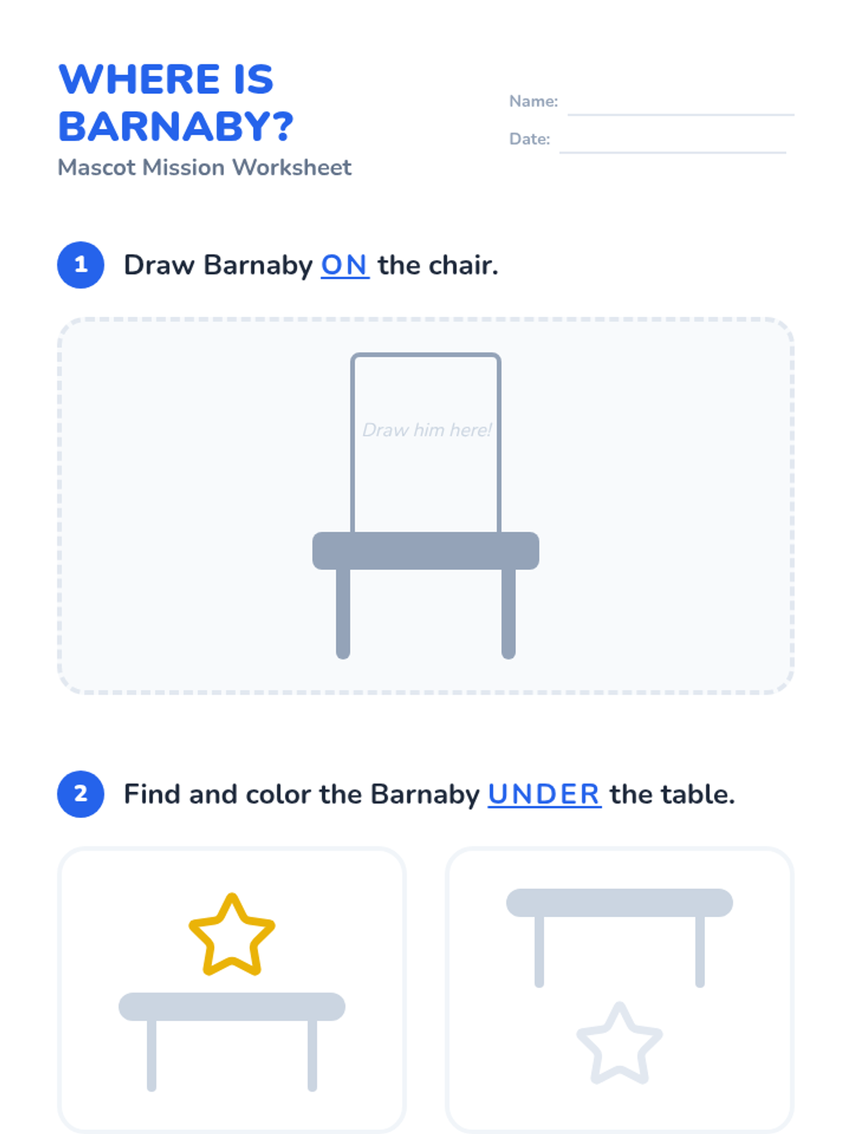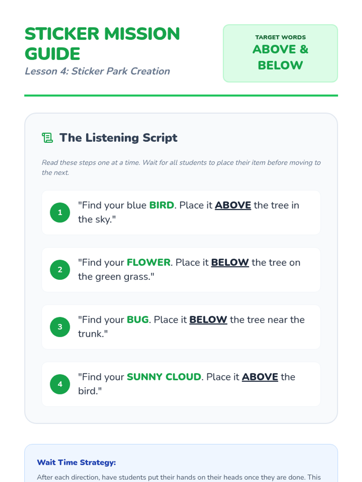A Pre-K sequence focused on spatial vocabulary and location words. Students move from finding a class mascot to creating complex neighborhoods and giving directions, mastering terms like 'on,' 'under,' 'above,' and 'below.'