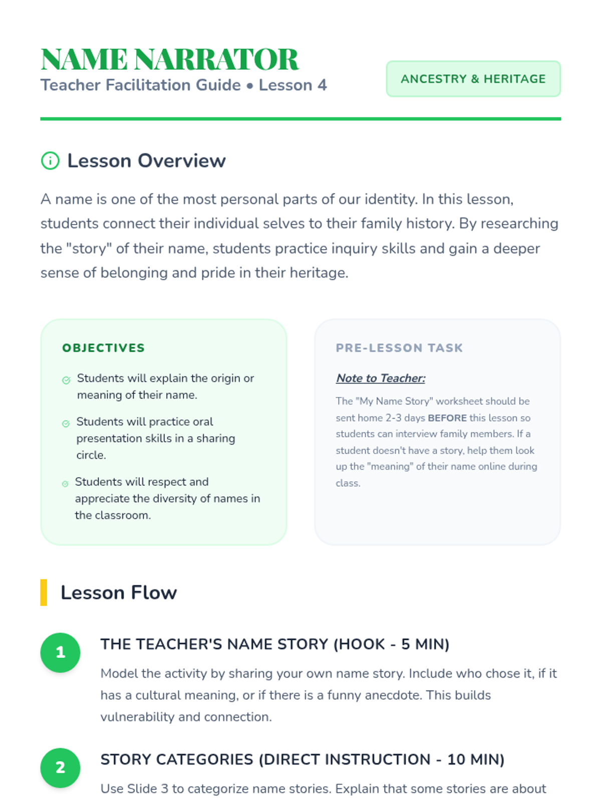 Students explore the vital role of oral tradition in Native American cultures, focusing on how stories teach lessons, explain nature, and preserve history. The sequence moves from passive listening to active retelling, helping students appreciate history recorded through memory.