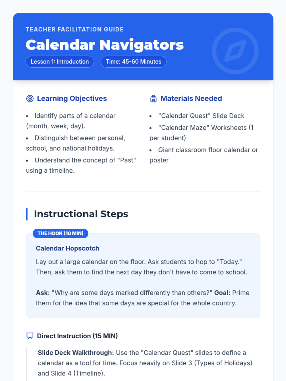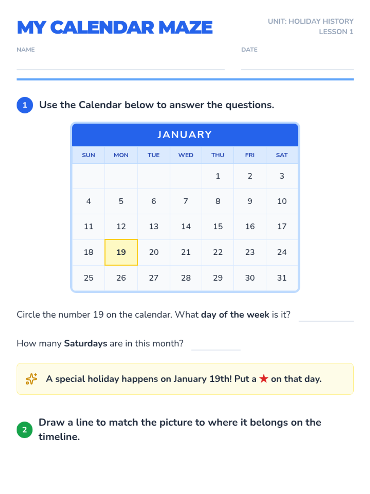 A 1st-grade history sequence exploring why we celebrate national holidays. Students learn about calendar literacy, historical figures, the concept of freedom, and the importance of gratitude, culminating in the creation of their own holiday.