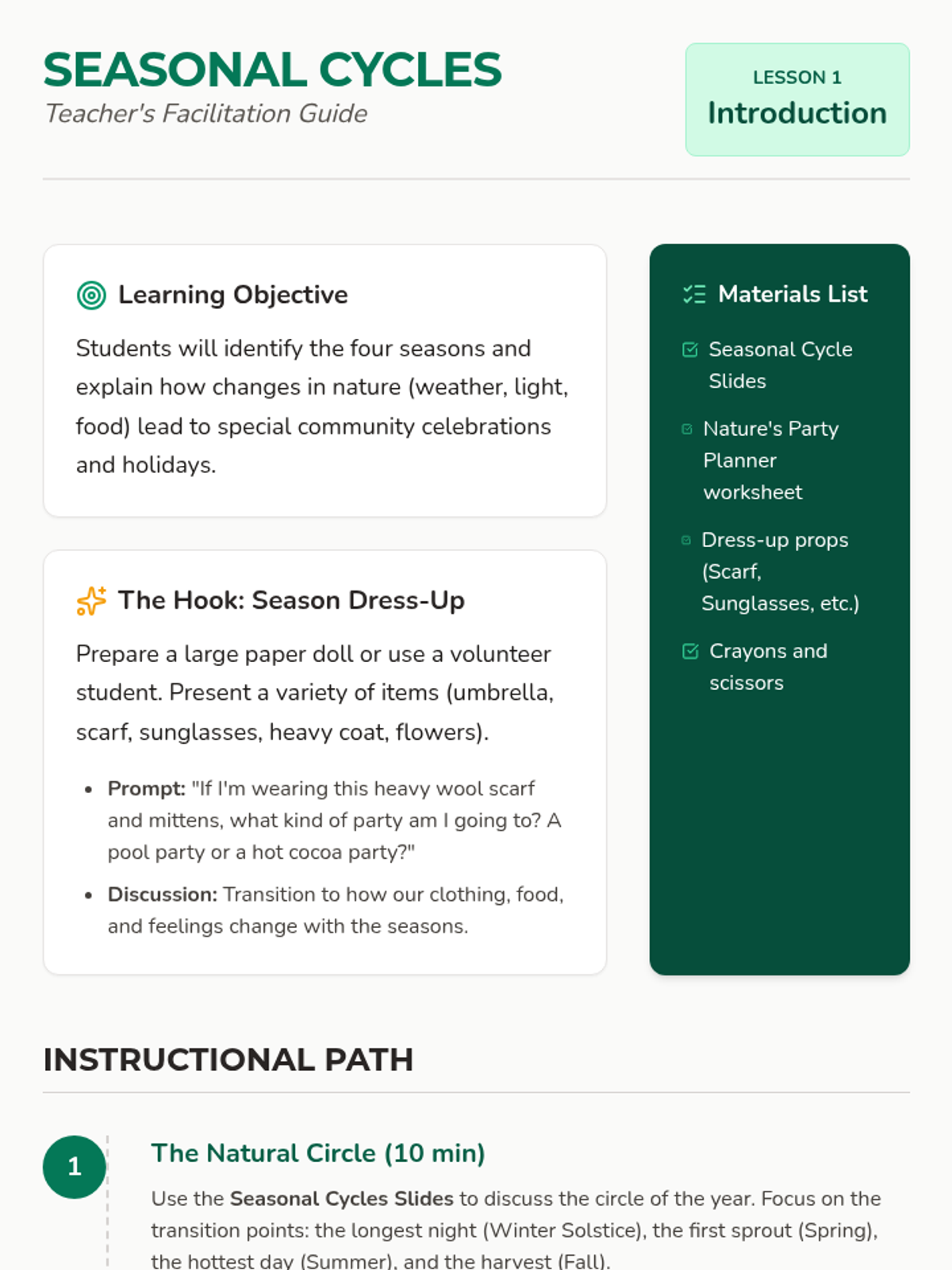 A 1st-grade sequence exploring how seasonal changes influence global festivals, focusing on light, harvest, and new beginnings across diverse cultures.