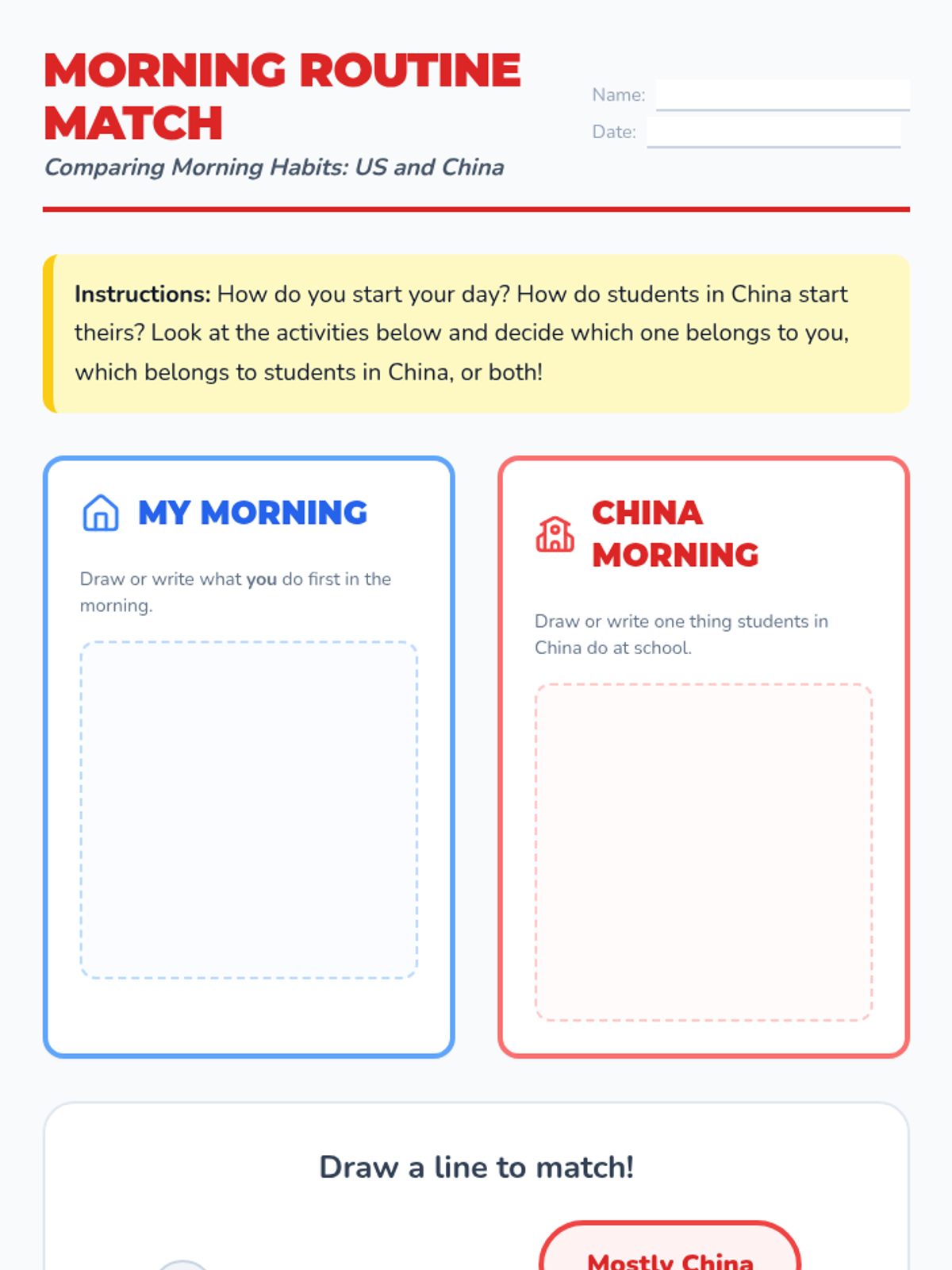This sequence explores modern daily life in China for 1st-grade students, focusing on routines, transportation, food, and urban environments to build a contemporary understanding of Chinese culture.