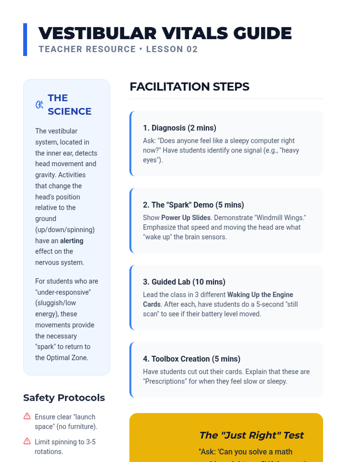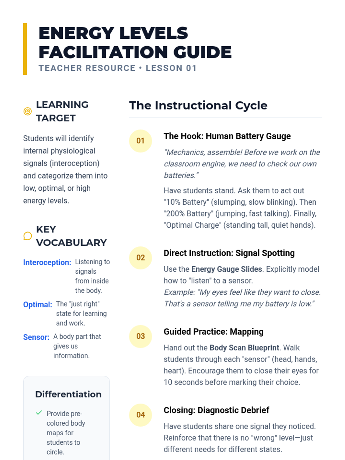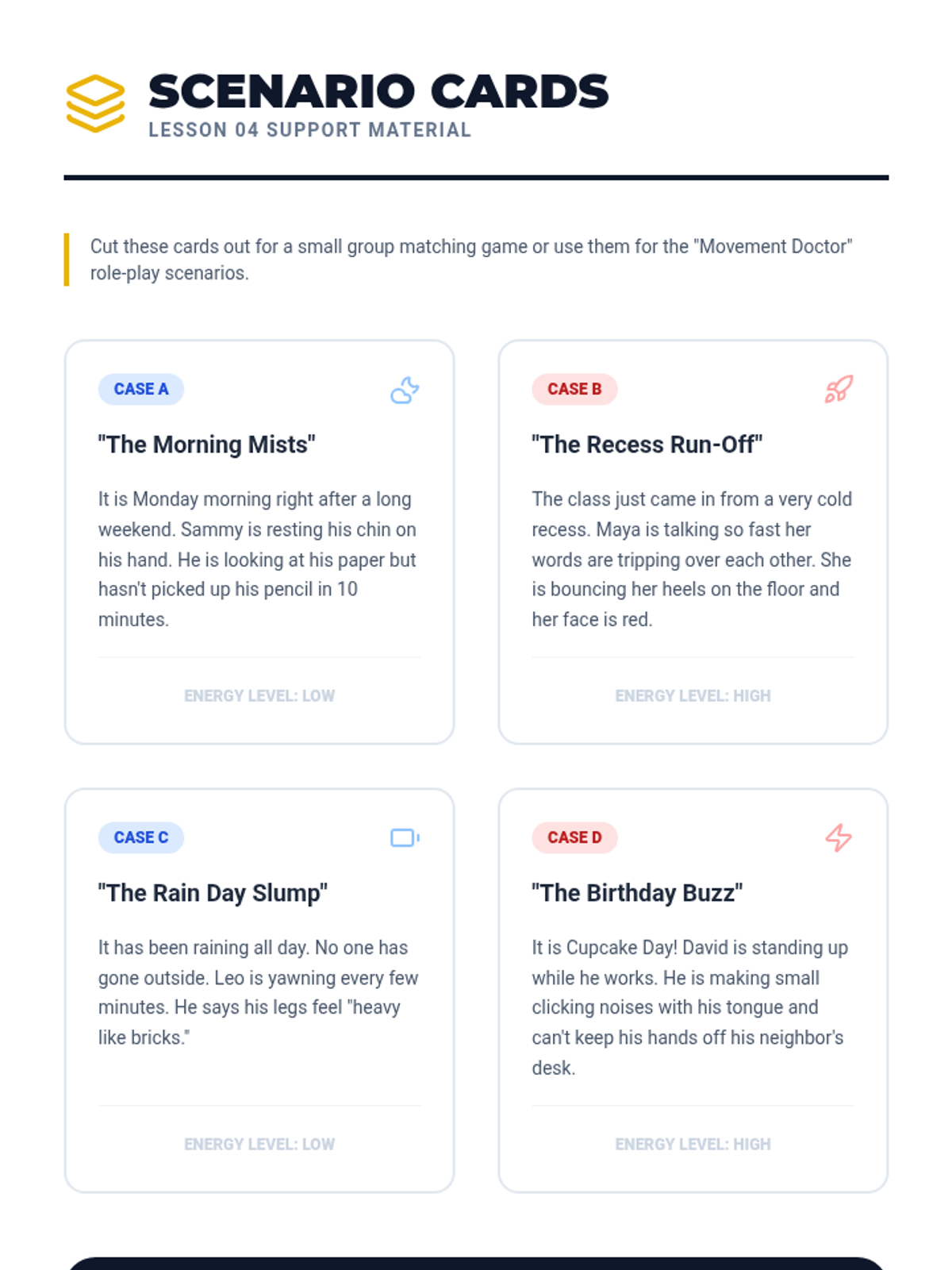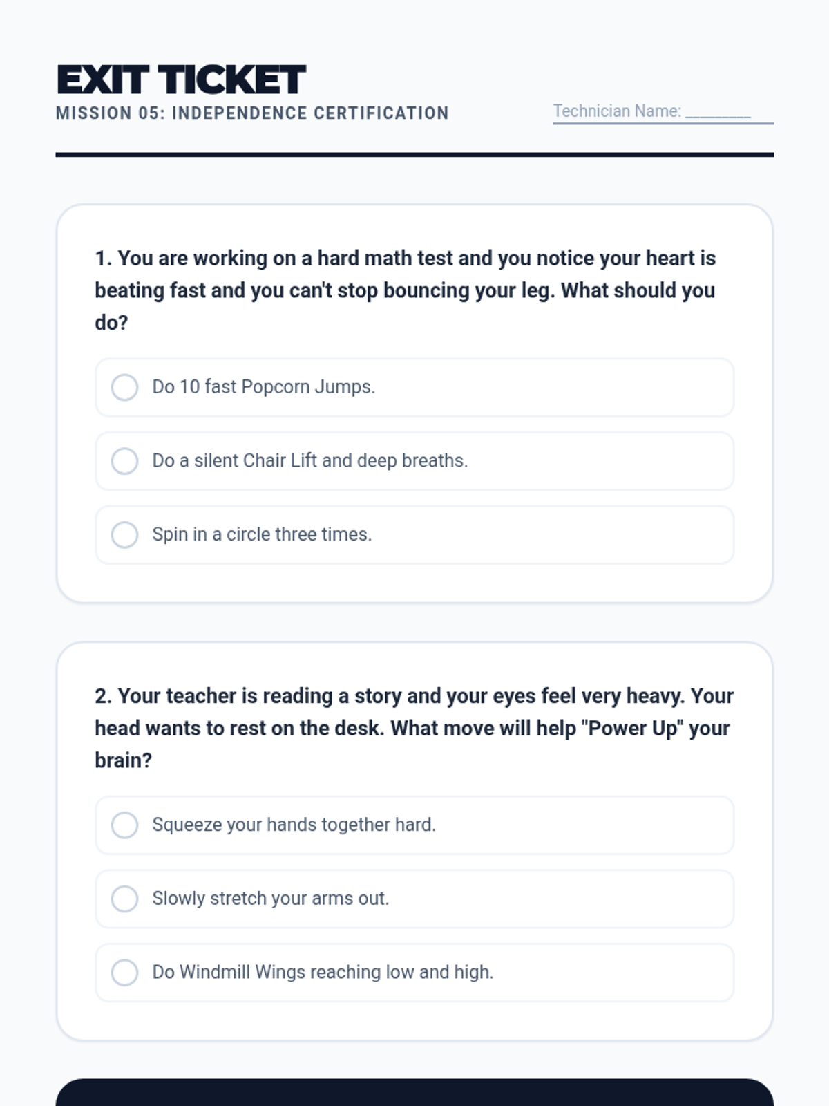 A sequence for 3rd-grade students to learn how to identify their internal energy levels and select appropriate movement breaks to regulate their bodies for learning. Students use interoception to scan their bodies and apply vestibular or proprioceptive strategies based on their needs.