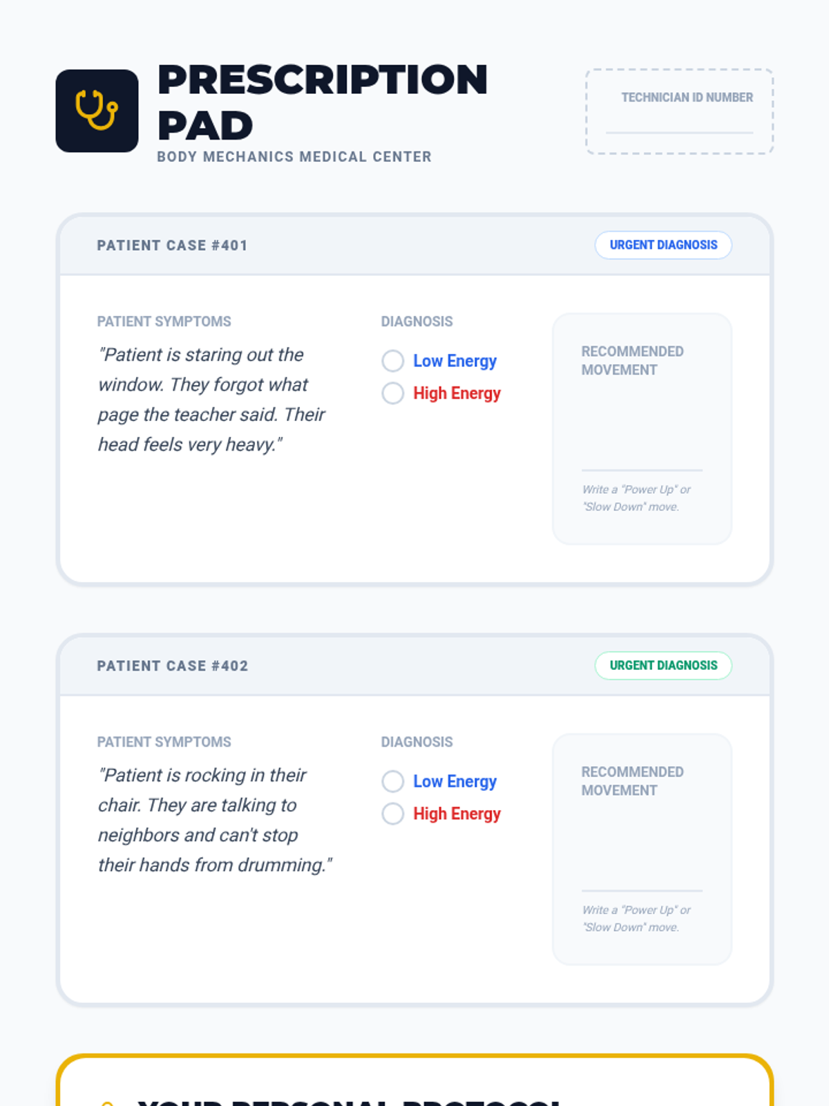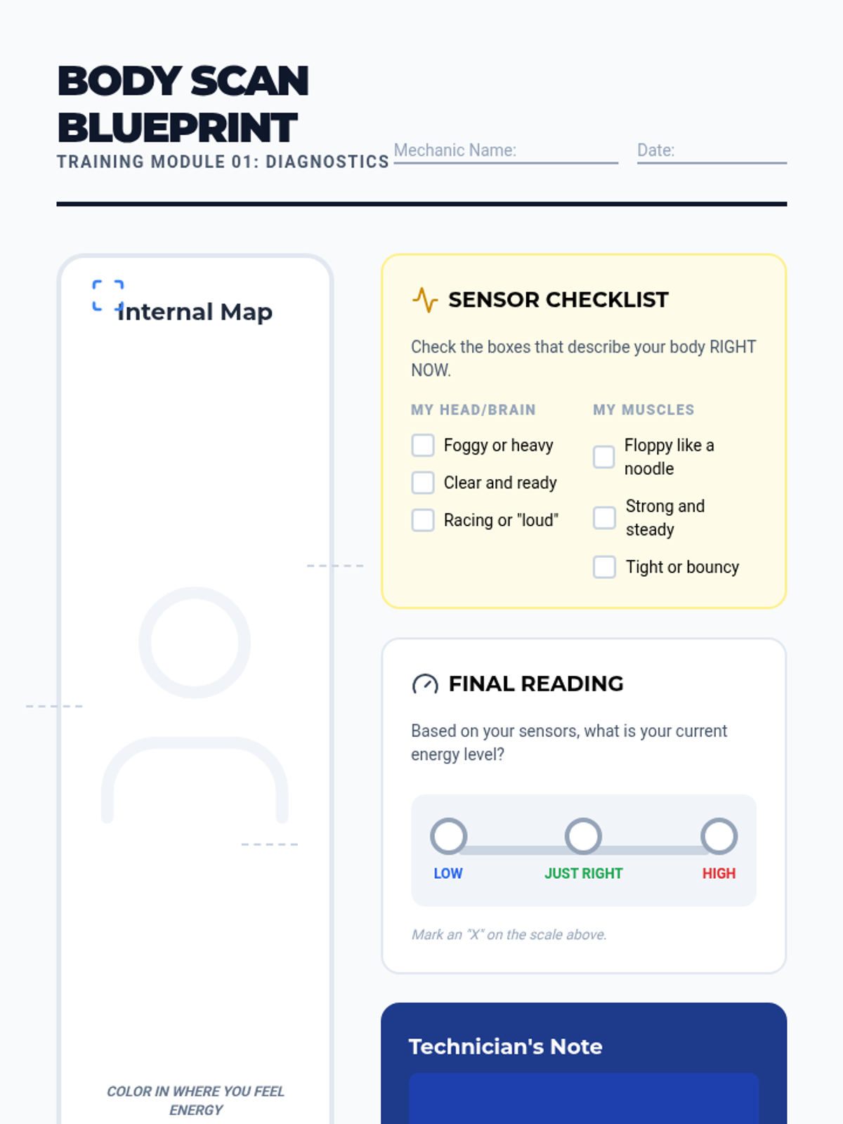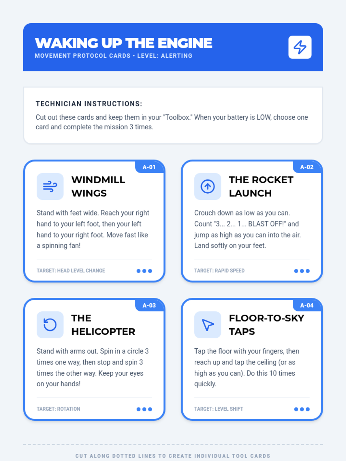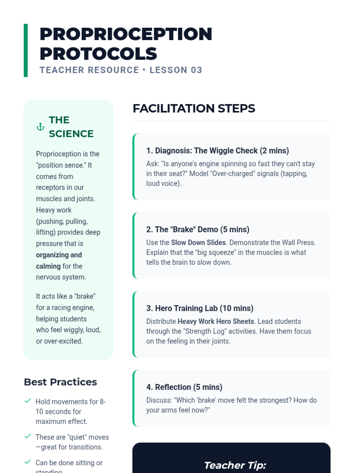 A sequence for 3rd-grade students to learn how to identify their internal energy levels and select appropriate movement breaks to regulate their bodies for learning. Students use interoception to scan their bodies and apply vestibular or proprioceptive strategies based on their needs.