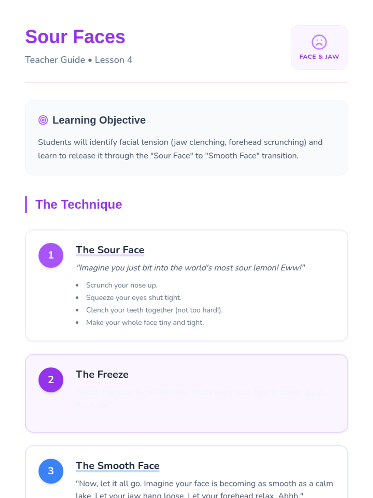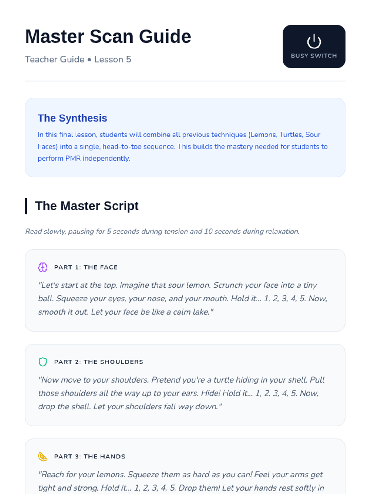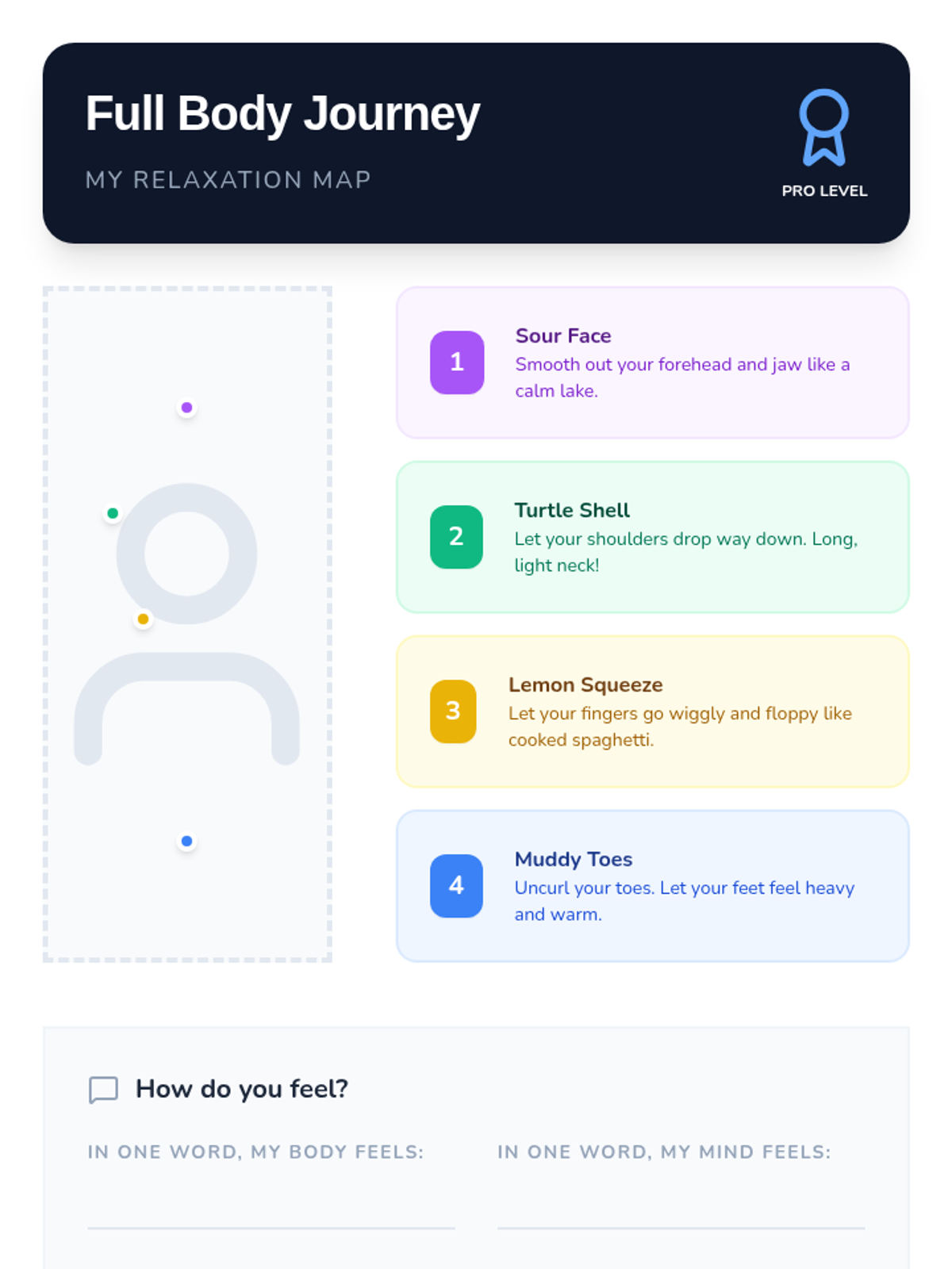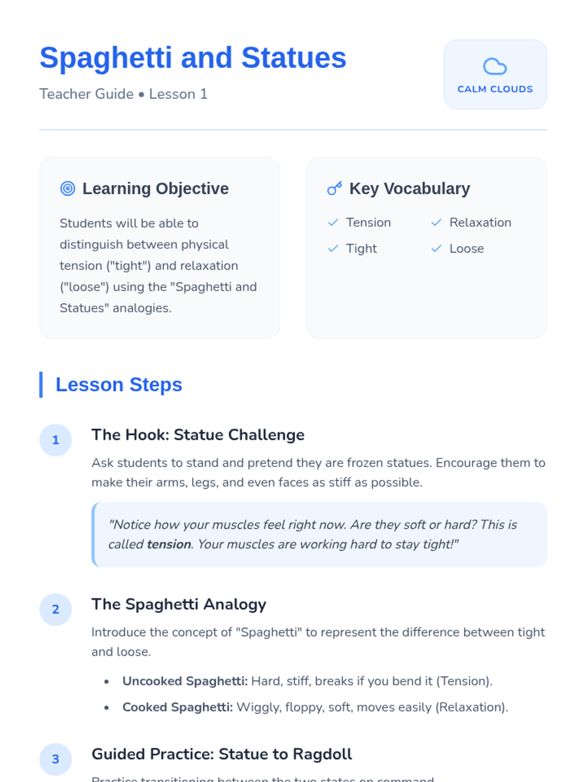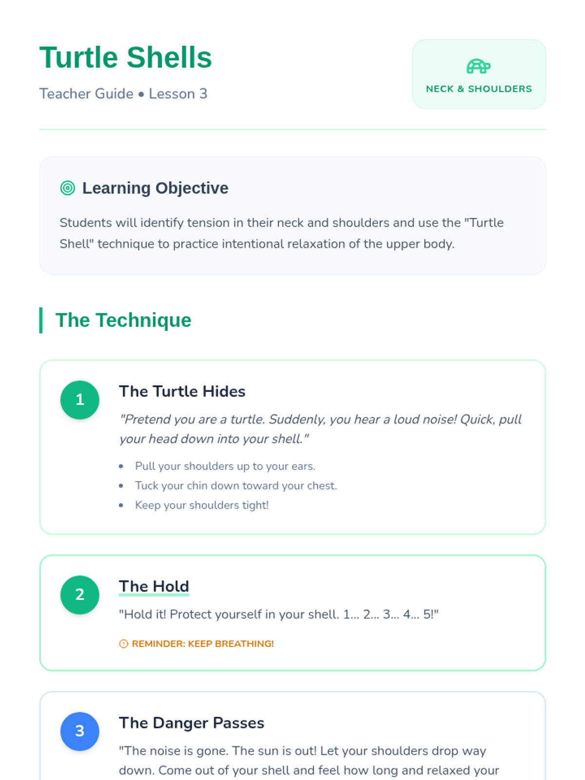 This 2nd-grade sequence introduces Progressive Muscle Relaxation (PMR) through playful analogies and systematic practice. Students learn to identify physical tension and use specific techniques to release it, building foundational somatic awareness and self-regulation skills.