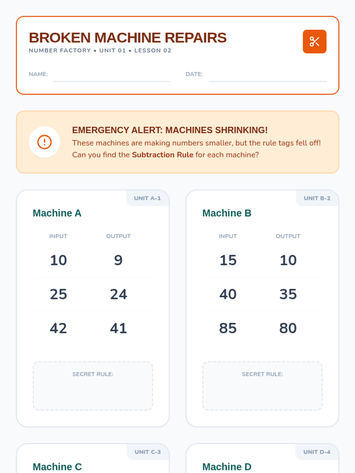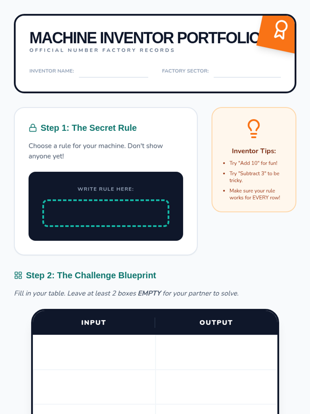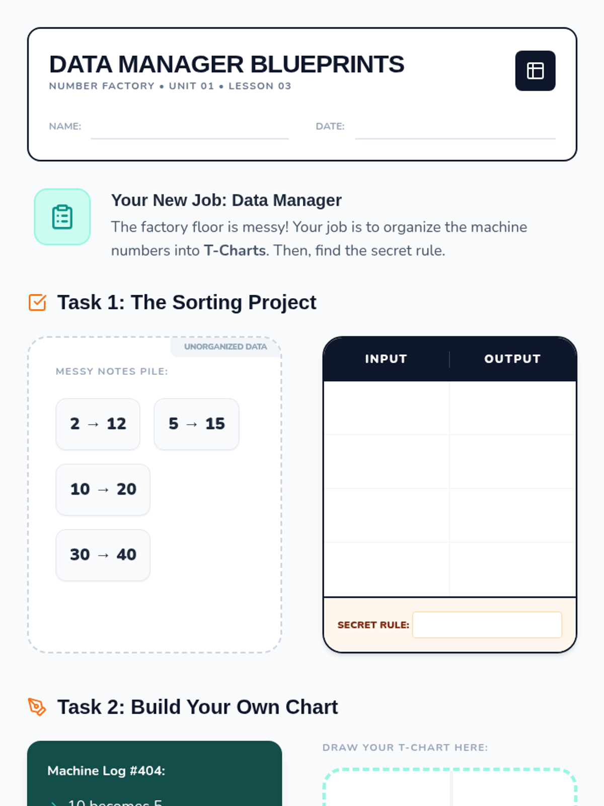 A 2nd-grade sequence introducing algebraic thinking through 'math machines' and input-output tables. Students explore addition and subtraction rules, organize data in T-charts, and predict future values using quantitative relationships.