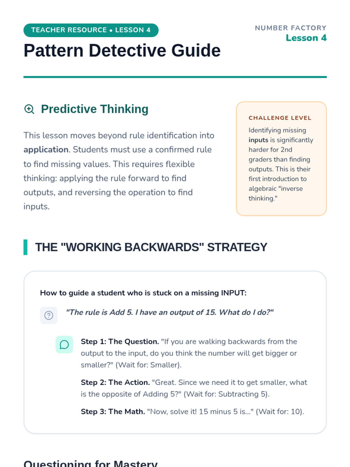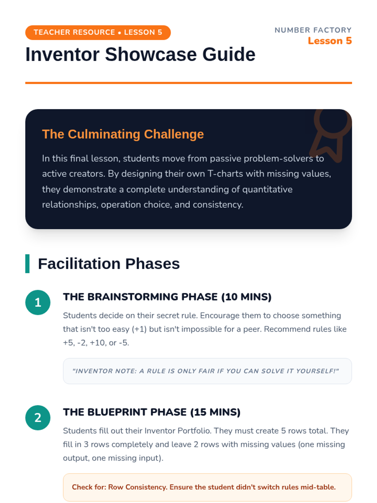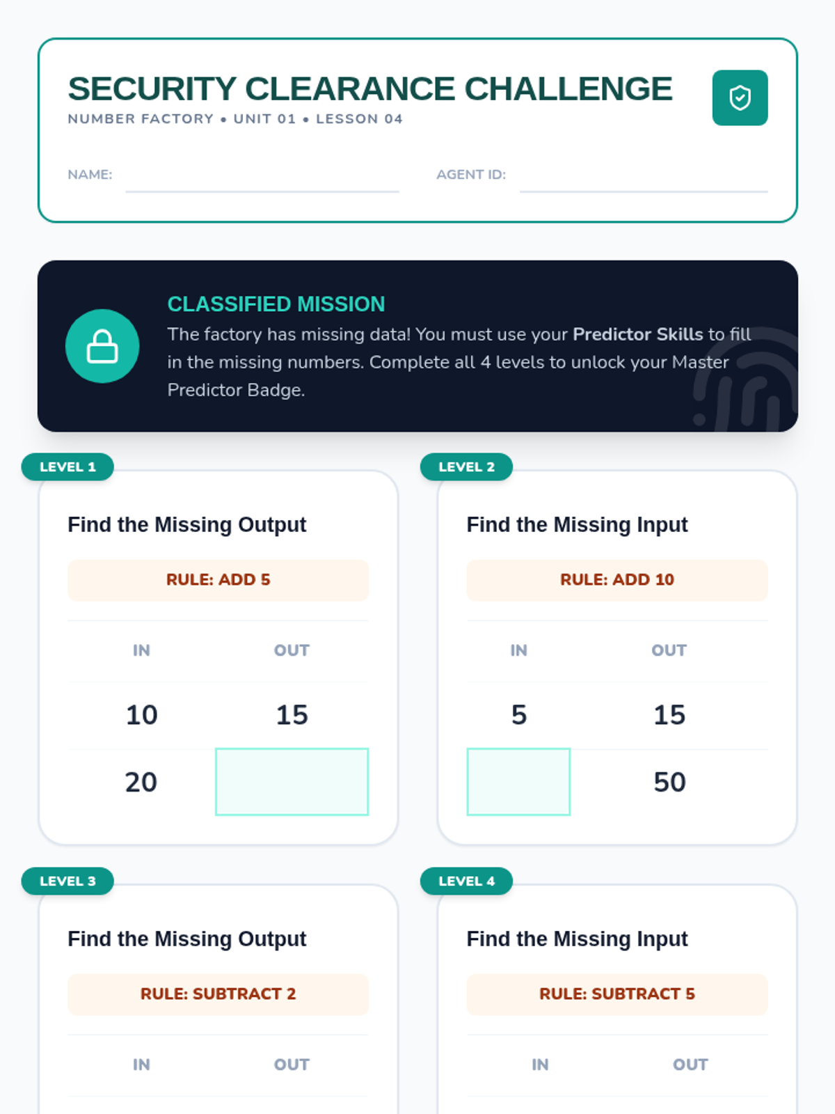 A 2nd-grade sequence introducing algebraic thinking through 'math machines' and input-output tables. Students explore addition and subtraction rules, organize data in T-charts, and predict future values using quantitative relationships.