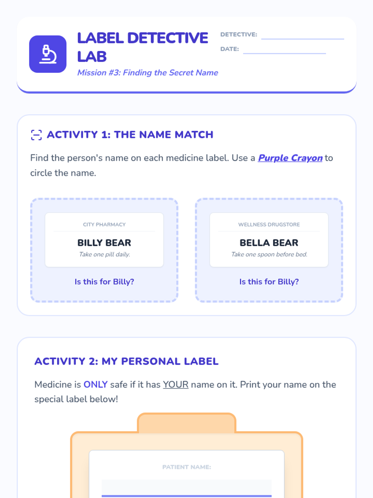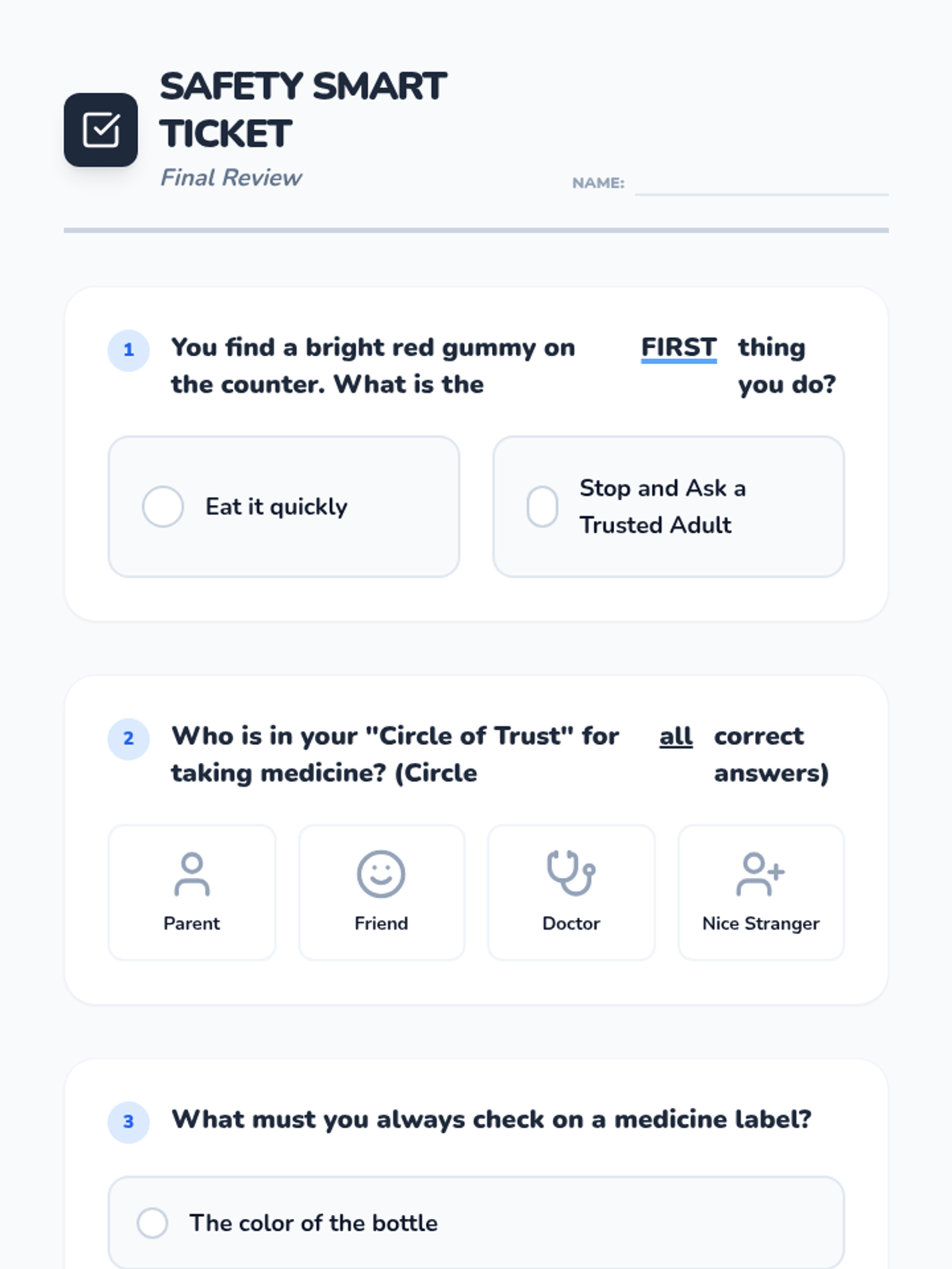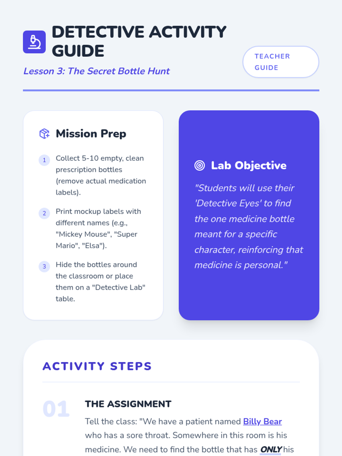 A comprehensive 5-lesson unit for first graders focused on distinguishing candy from medicine, identifying trusted adults, understanding prescription labels, and practicing safe storage. Students become 'Safety Detectives' to learn how to stay safe around medicines.