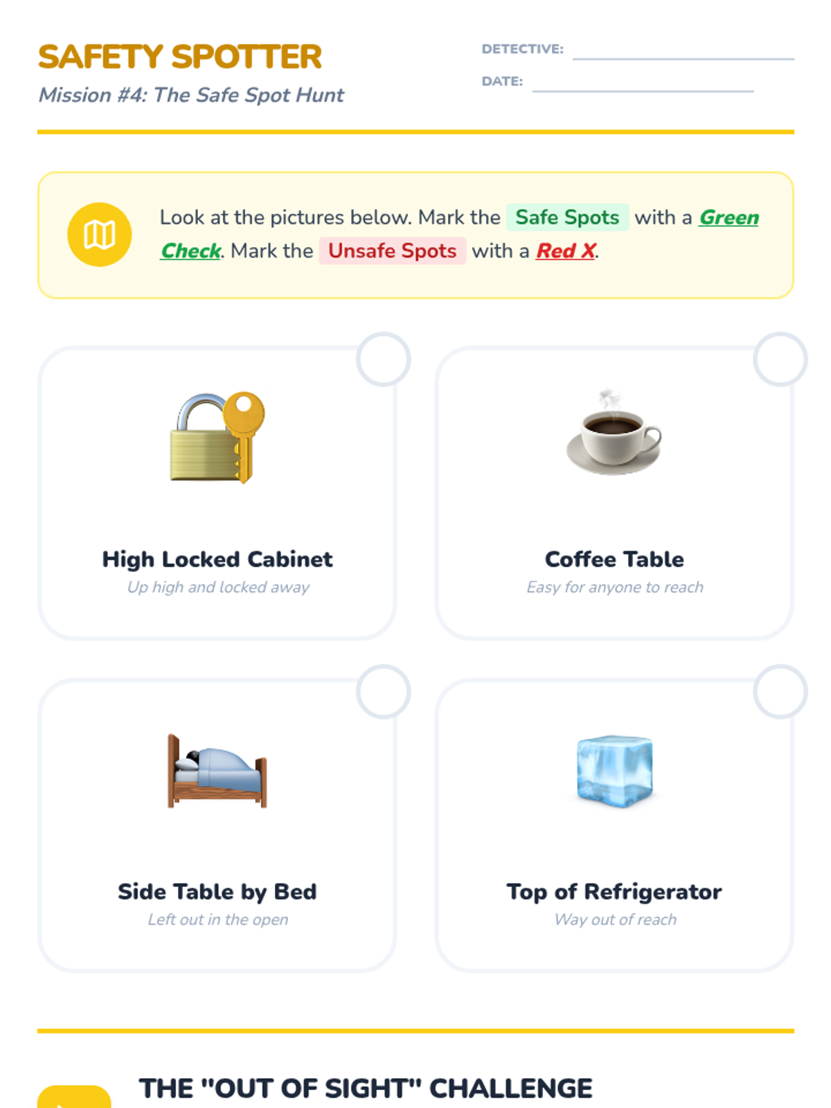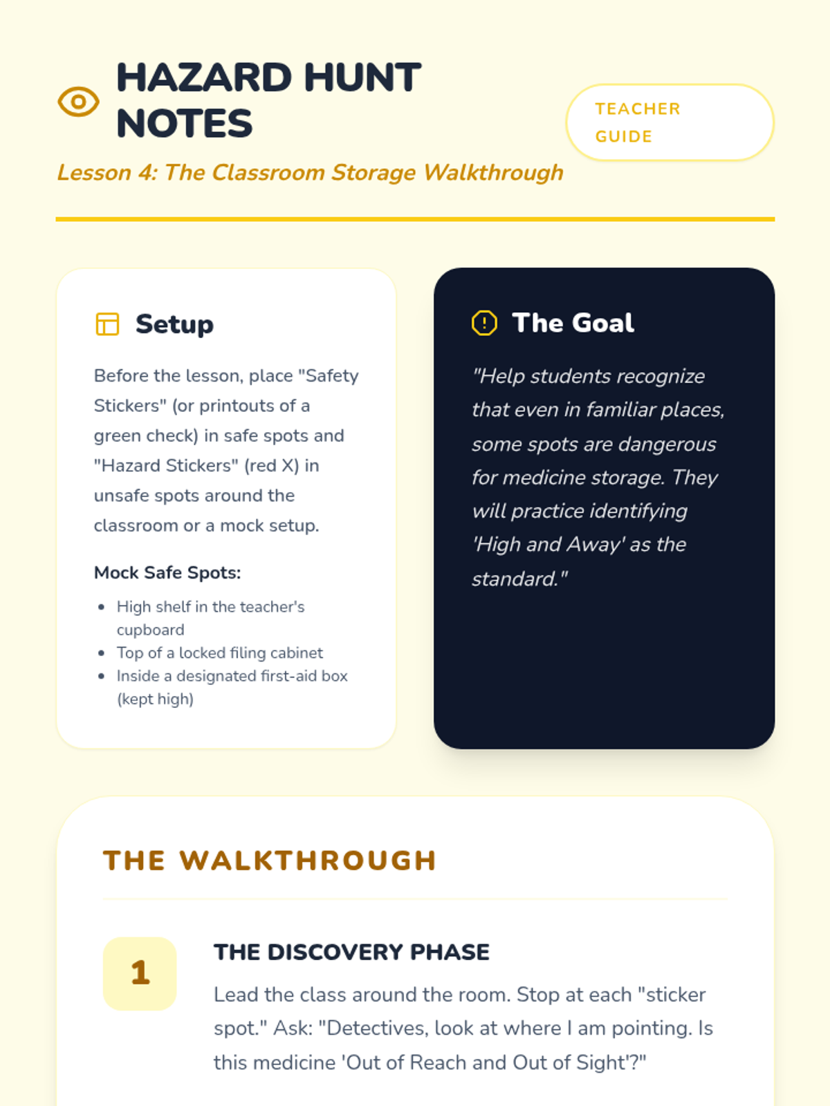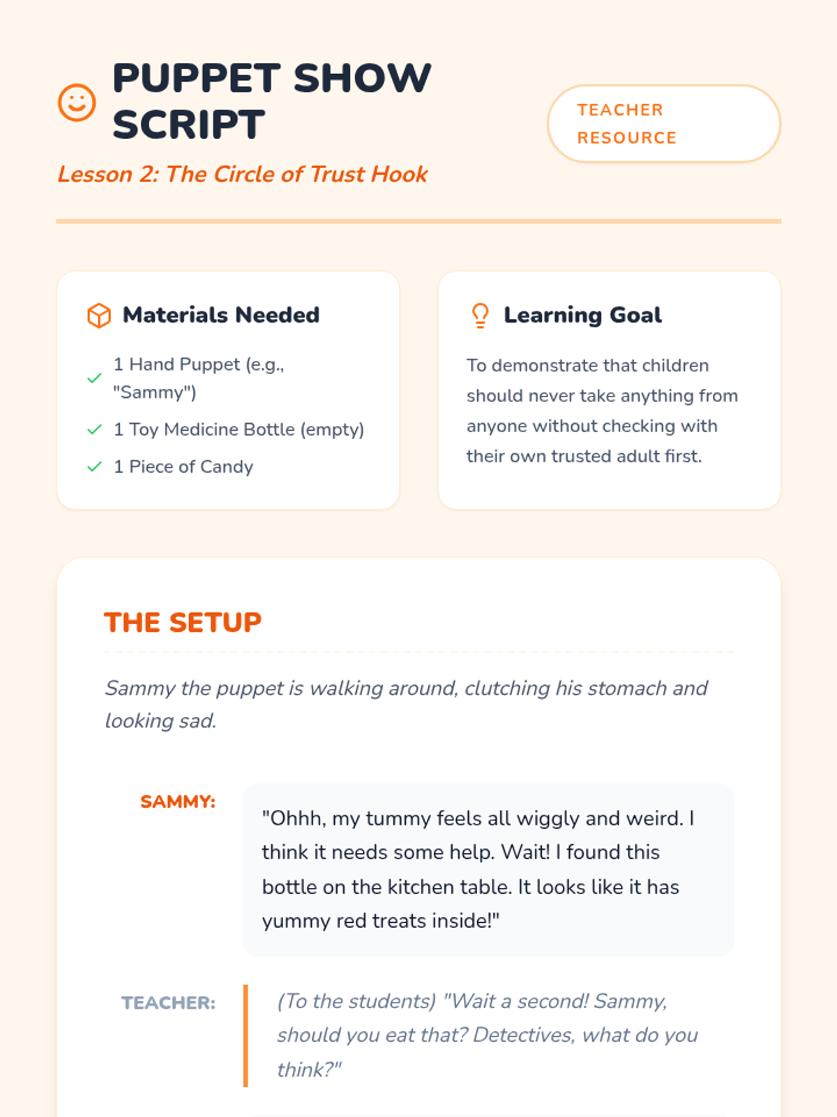 A comprehensive 5-lesson unit for first graders focused on distinguishing candy from medicine, identifying trusted adults, understanding prescription labels, and practicing safe storage. Students become 'Safety Detectives' to learn how to stay safe around medicines.