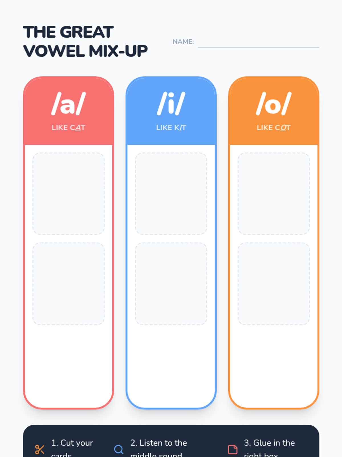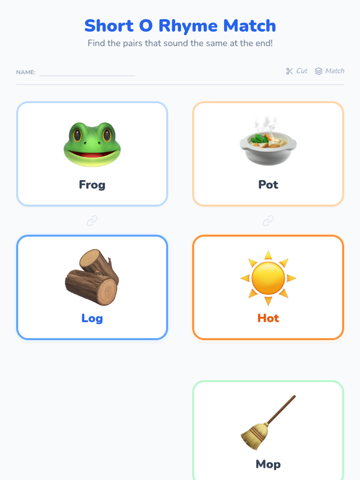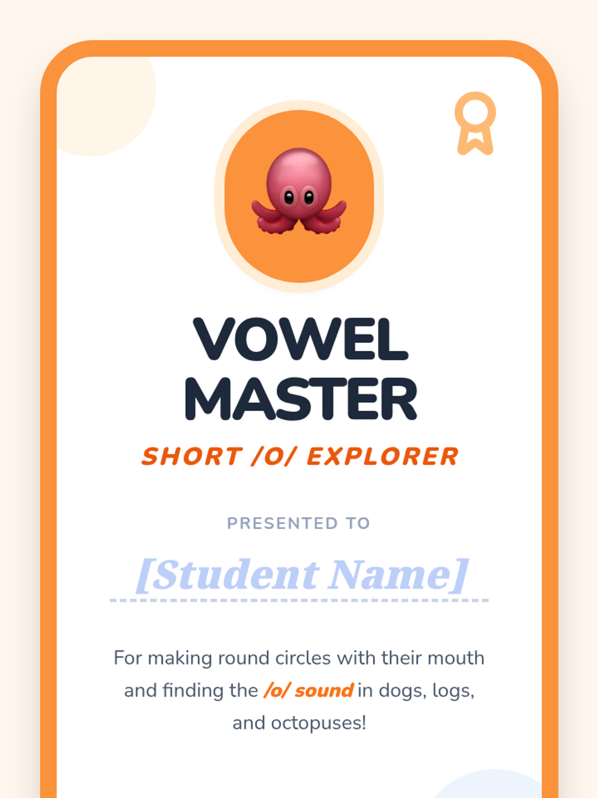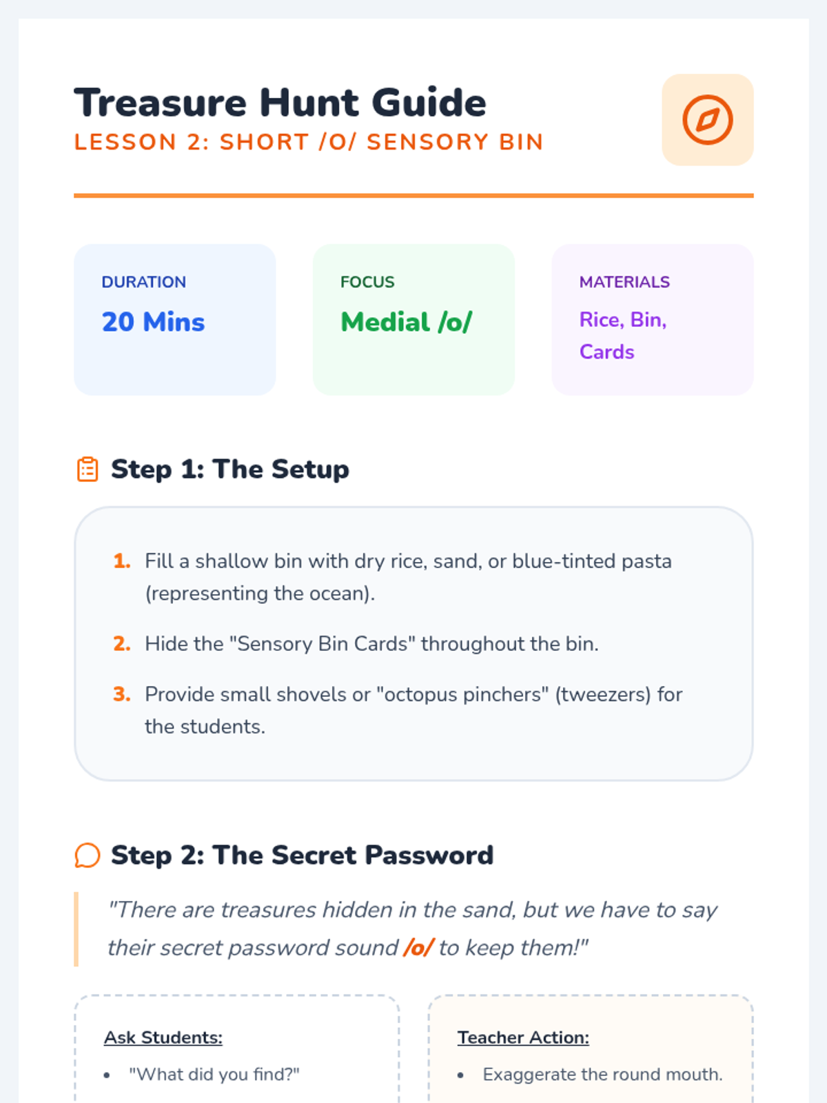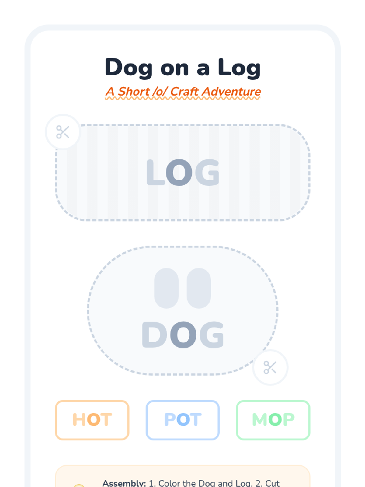 A Pre-K phonics sequence focusing on the short /o/ sound through sensory play, rhyming, and creative crafts. Students learn mouth formation, identify medial vowel sounds, and distinguish /o/ from other vowels.