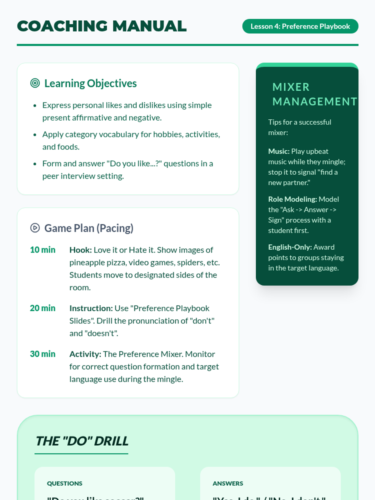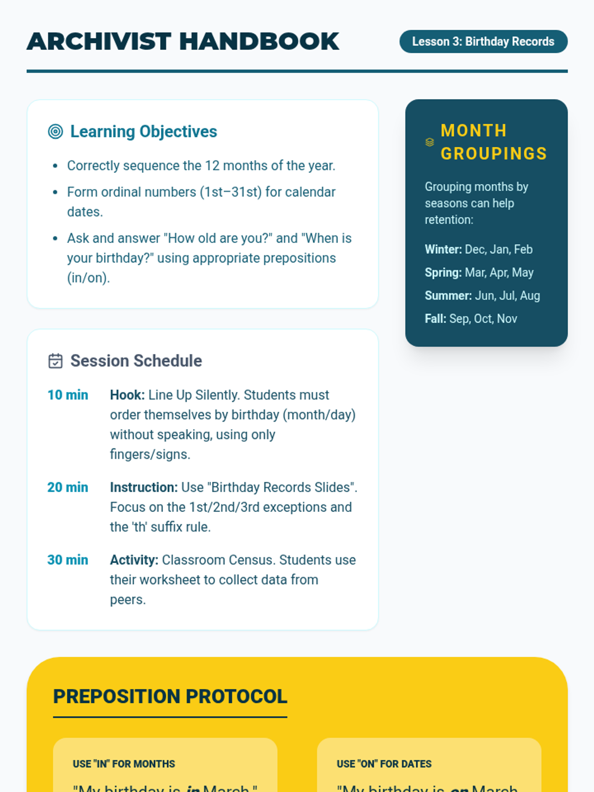 A comprehensive listening sequence for beginner ESL students to navigate their middle school environment. Students progress from basic classroom commands and object identification to mastering numbers, times, and social introductions through active listening simulations.