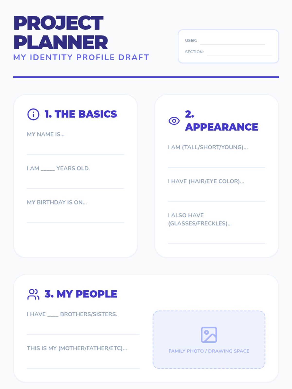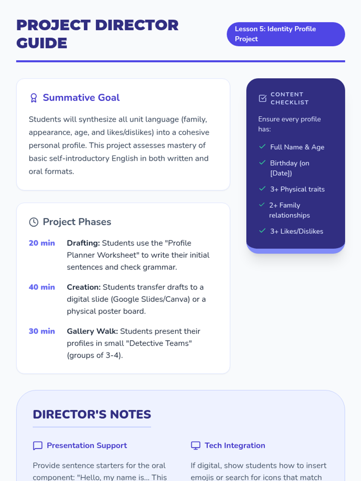 A comprehensive project-based unit for 7th grade ESL beginners focused on articulating identity, family relationships, and personal preferences through vocabulary building and creative projects.