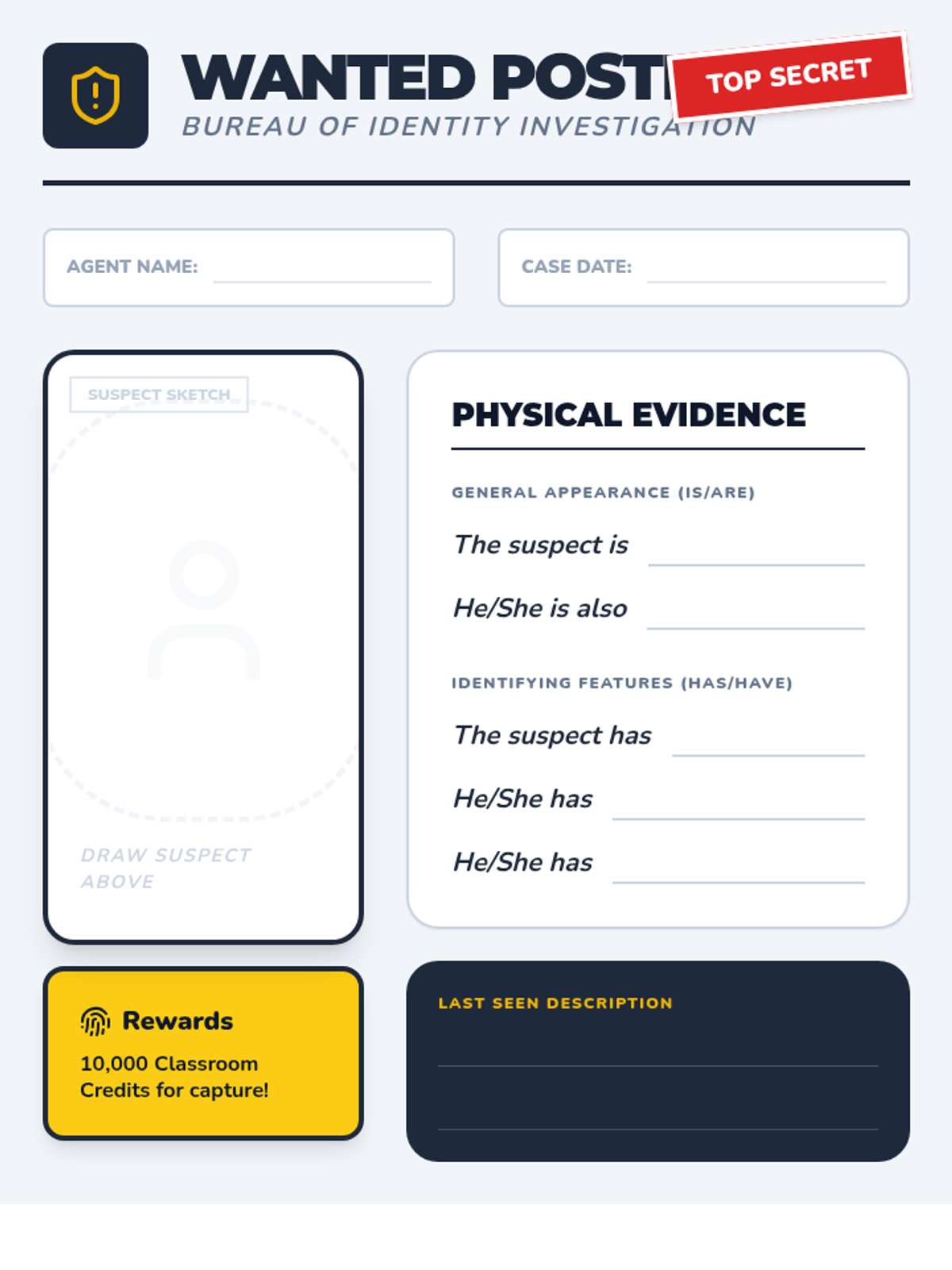 A grammar-focused ESL unit where students act as investigators to solve a classroom mystery. They master passive voice, modals of deduction, reported speech, and past perfect to write an objective case report.