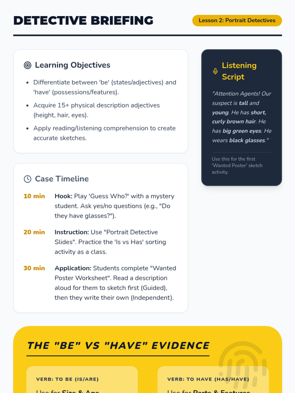 An intermediate ESL sequence where students act as 'communication detectives' to analyze tone, idioms, exaggeration, and speaker intent in spoken English. The sequence culminates in a mystery simulation requiring students to synthesize all listening skills to solve a case.
