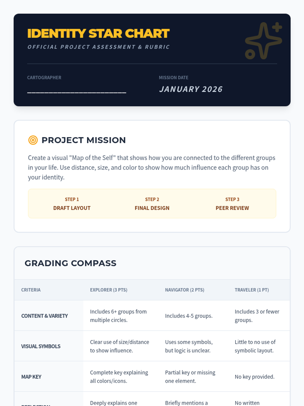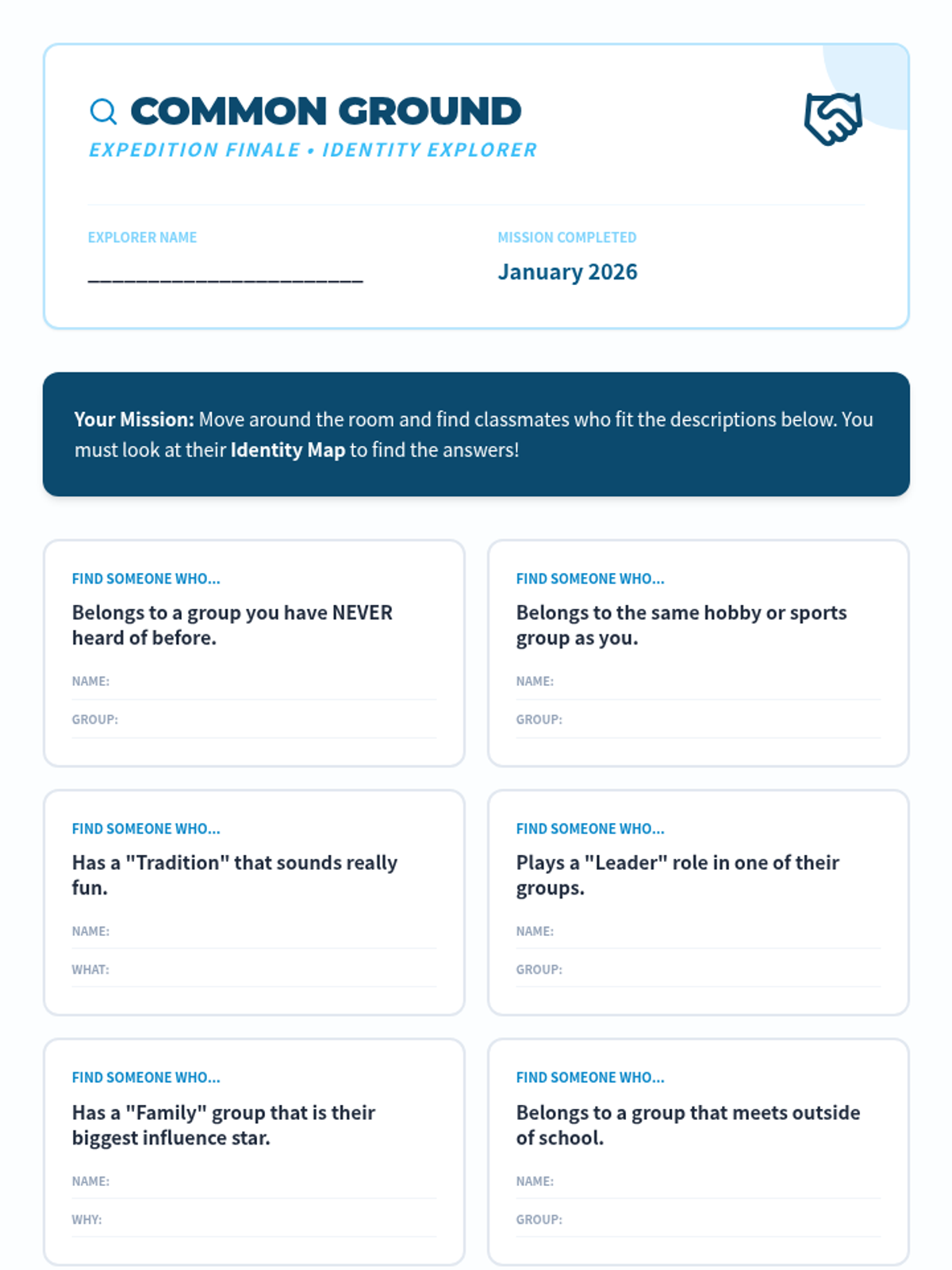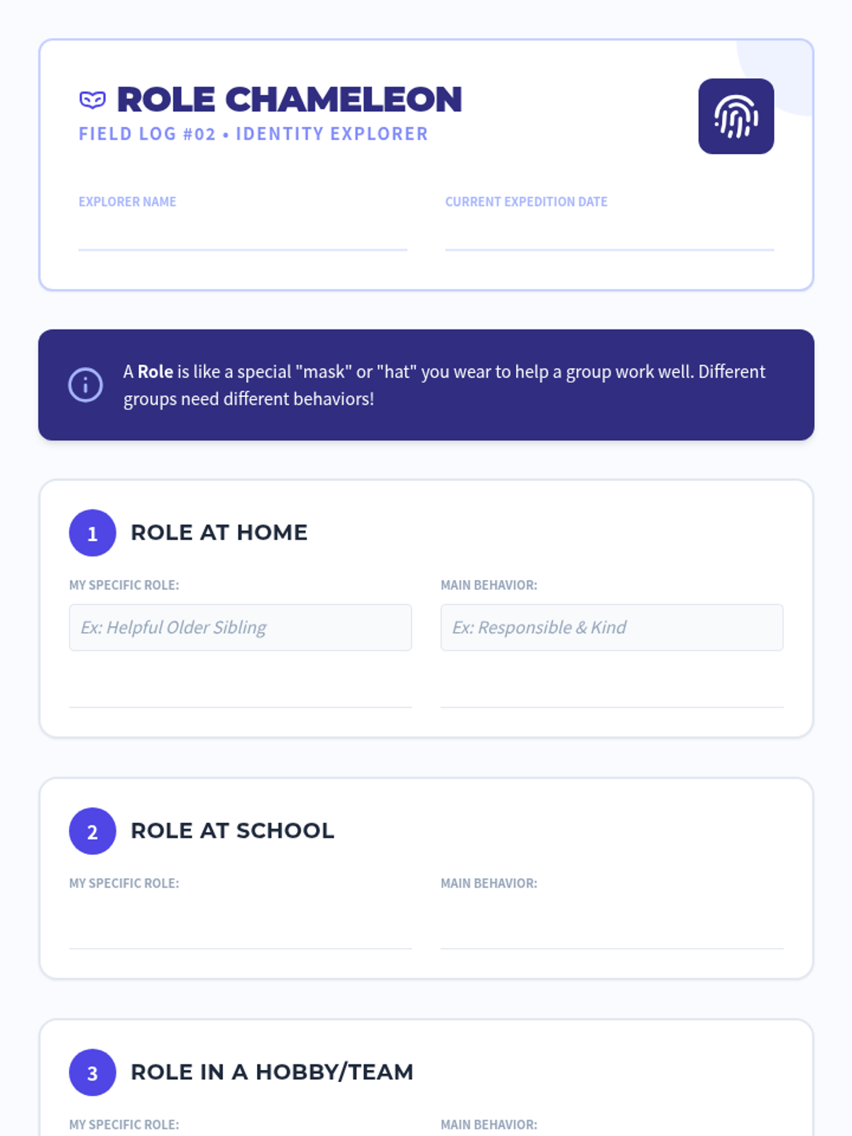 This project-based sequence explores how social groups and communities influence individual identity. Students investigate the various 'circles' they belong to—family, school, clubs, and cultural groups—and analyze how these memberships shape their values and behaviors. The learning journey culminates in the creation of a 'Social Identity Map' that visualizes their connections.