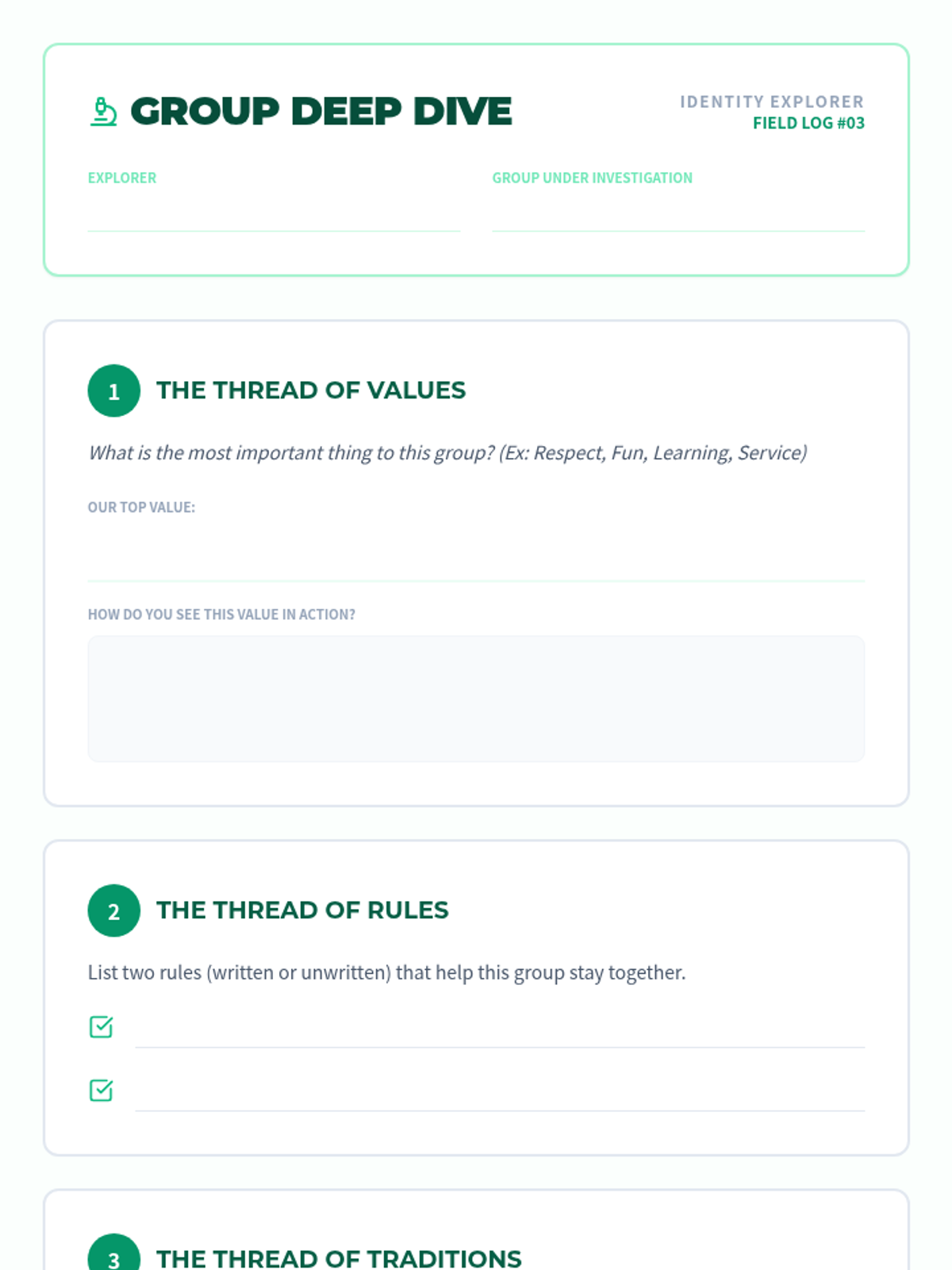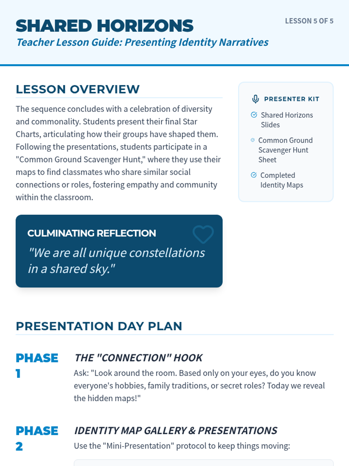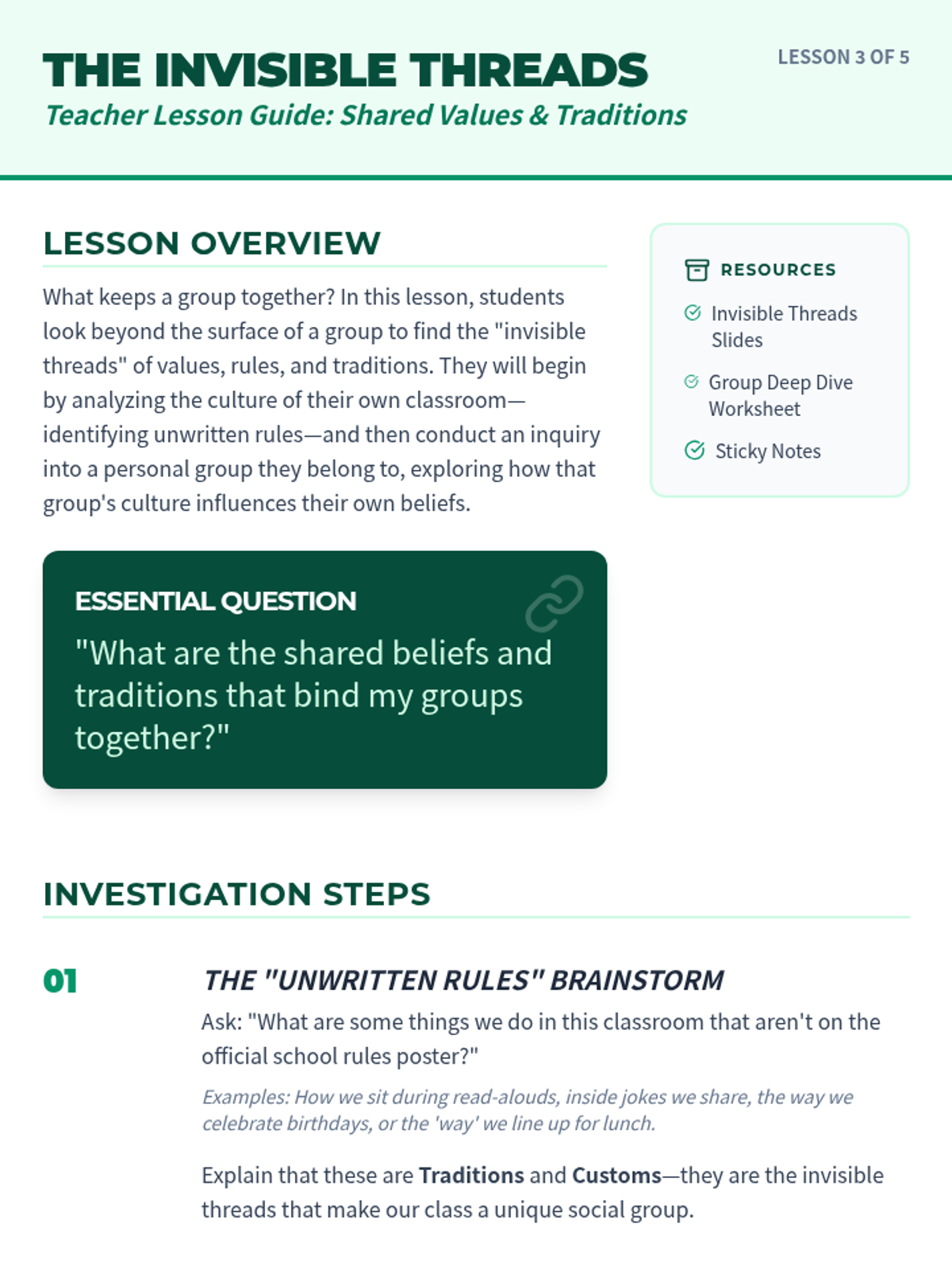 This project-based sequence explores how social groups and communities influence individual identity. Students investigate the various 'circles' they belong to—family, school, clubs, and cultural groups—and analyze how these memberships shape their values and behaviors. The learning journey culminates in the creation of a 'Social Identity Map' that visualizes their connections.