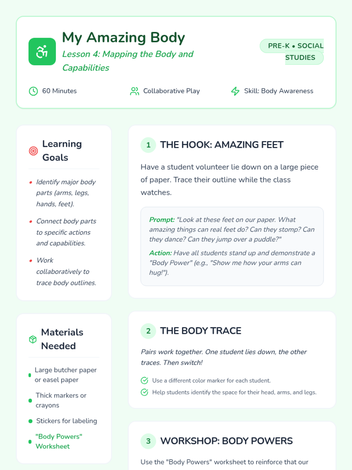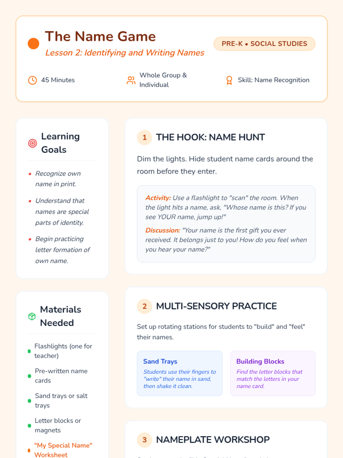 This Pre-K sequence introduces foundational civics through the lens of classroom rules, safety, sharing, and collective responsibility. Students move from experiencing the chaos of lawlessness to collaboratively drafting a 'Classroom Promise.'