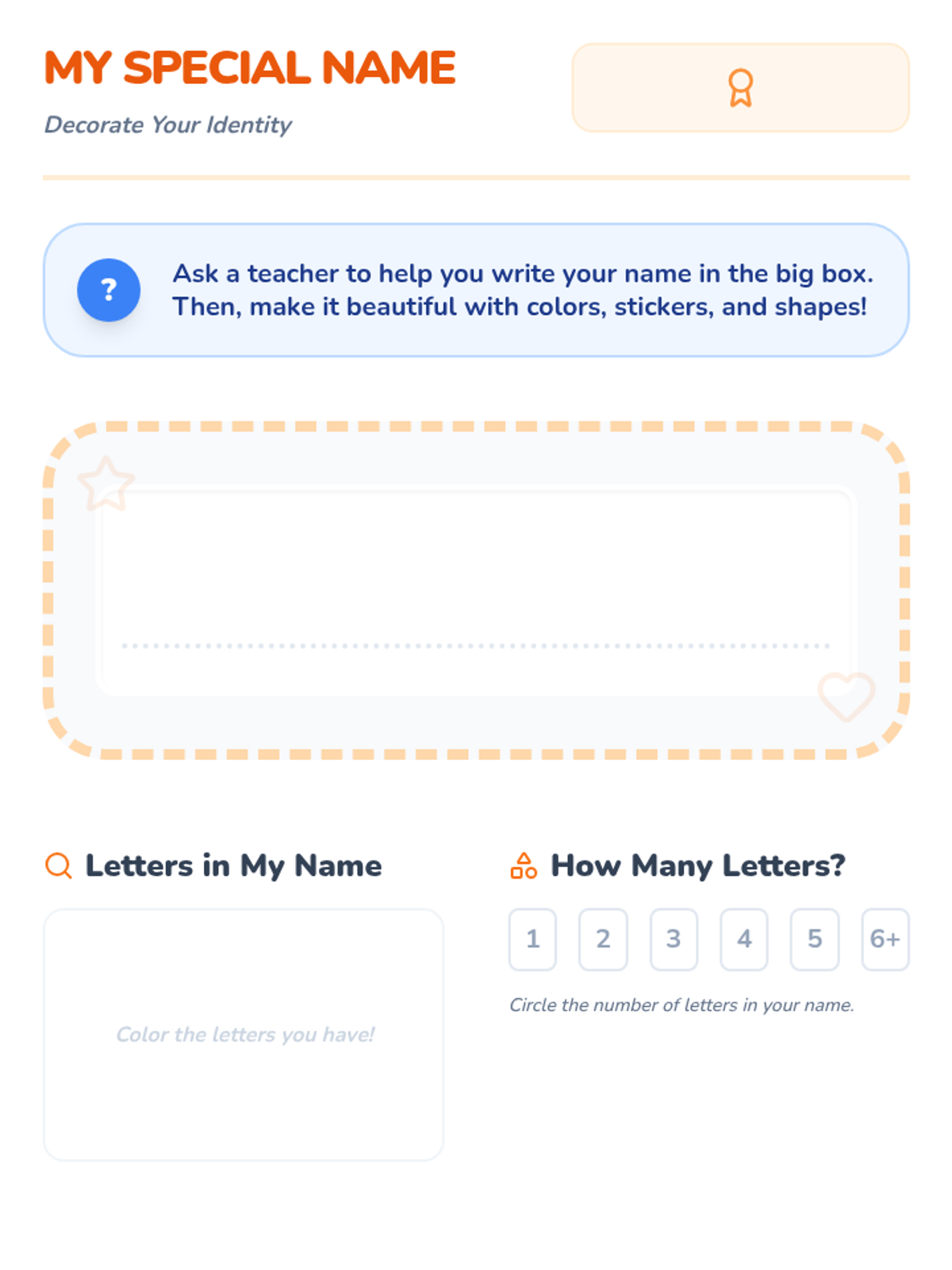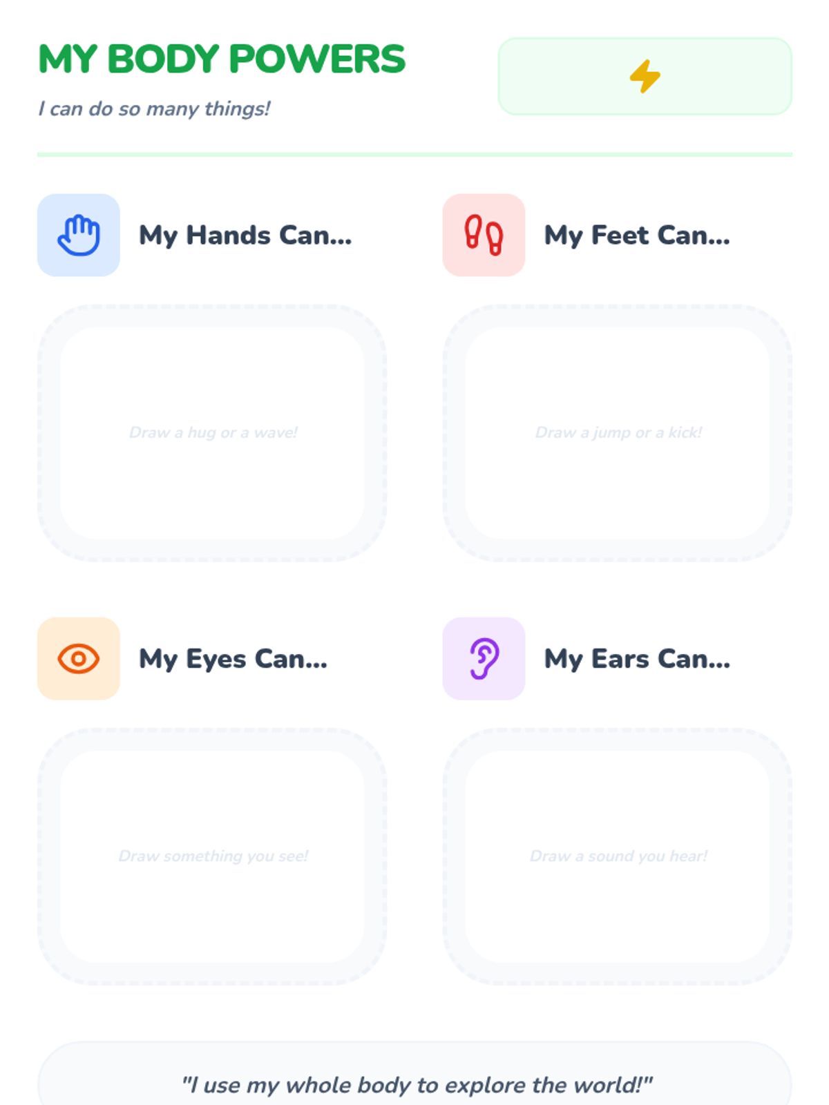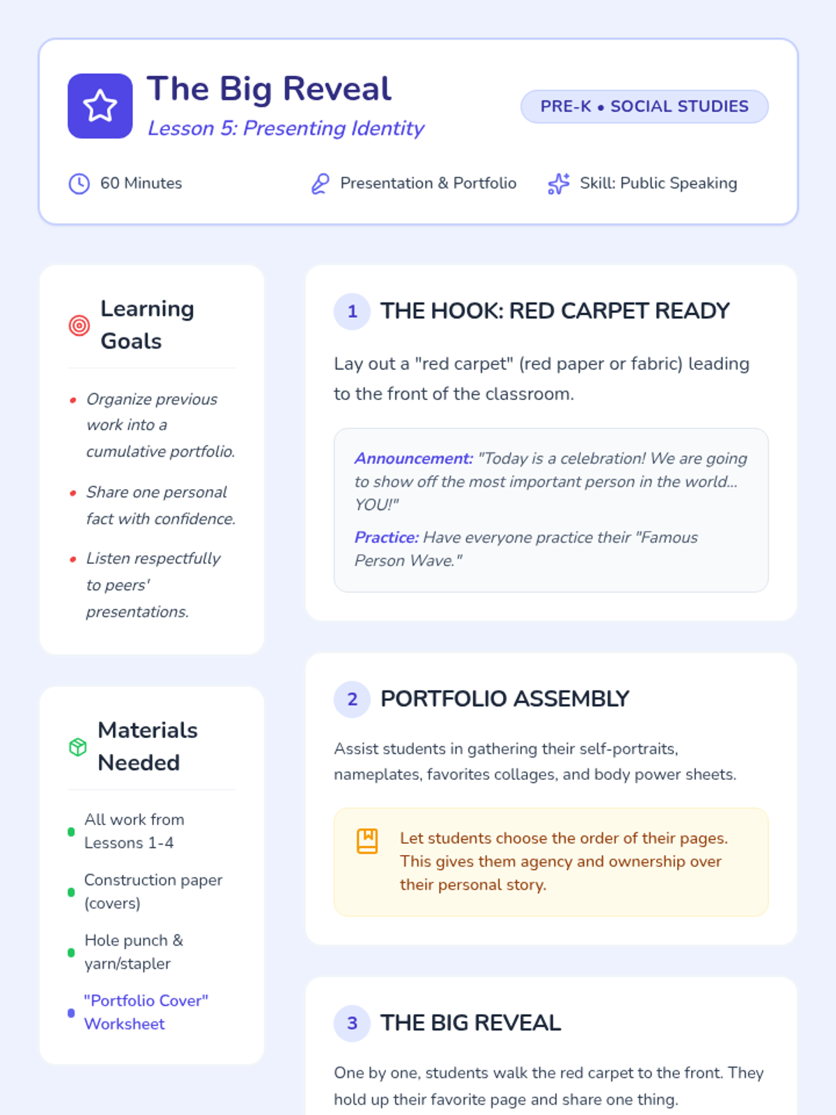 A Pre-K sequence focused on self-recognition, personal preferences, and identity. Students explore their physical traits, names, and favorites to create a comprehensive 'All About Me' portfolio.