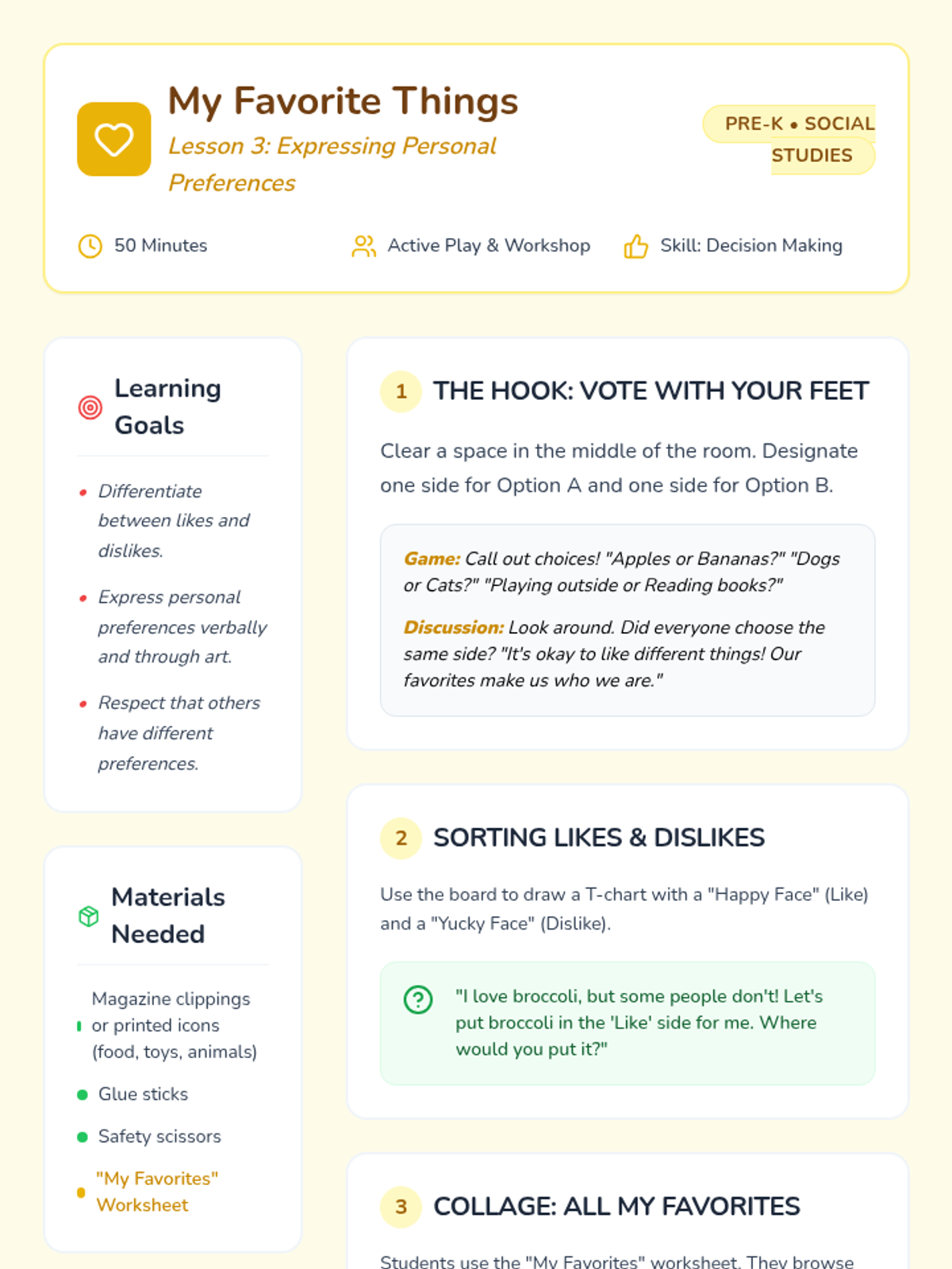 This sequence introduces Pre-K learners to citizenship through classroom community, rules, jobs, fairness, and voting. Students move from individual belonging to collaborative decision-making, grounding abstract civic concepts in daily school life.