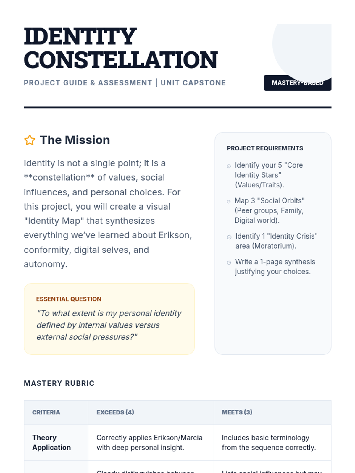 This sequence explores the psychological journey of adolescence, focusing on identity formation through Erikson's theory, social conformity, digital self-perception, and the quest for autonomy. Students will analyze their own development and the social forces that shape who they are.