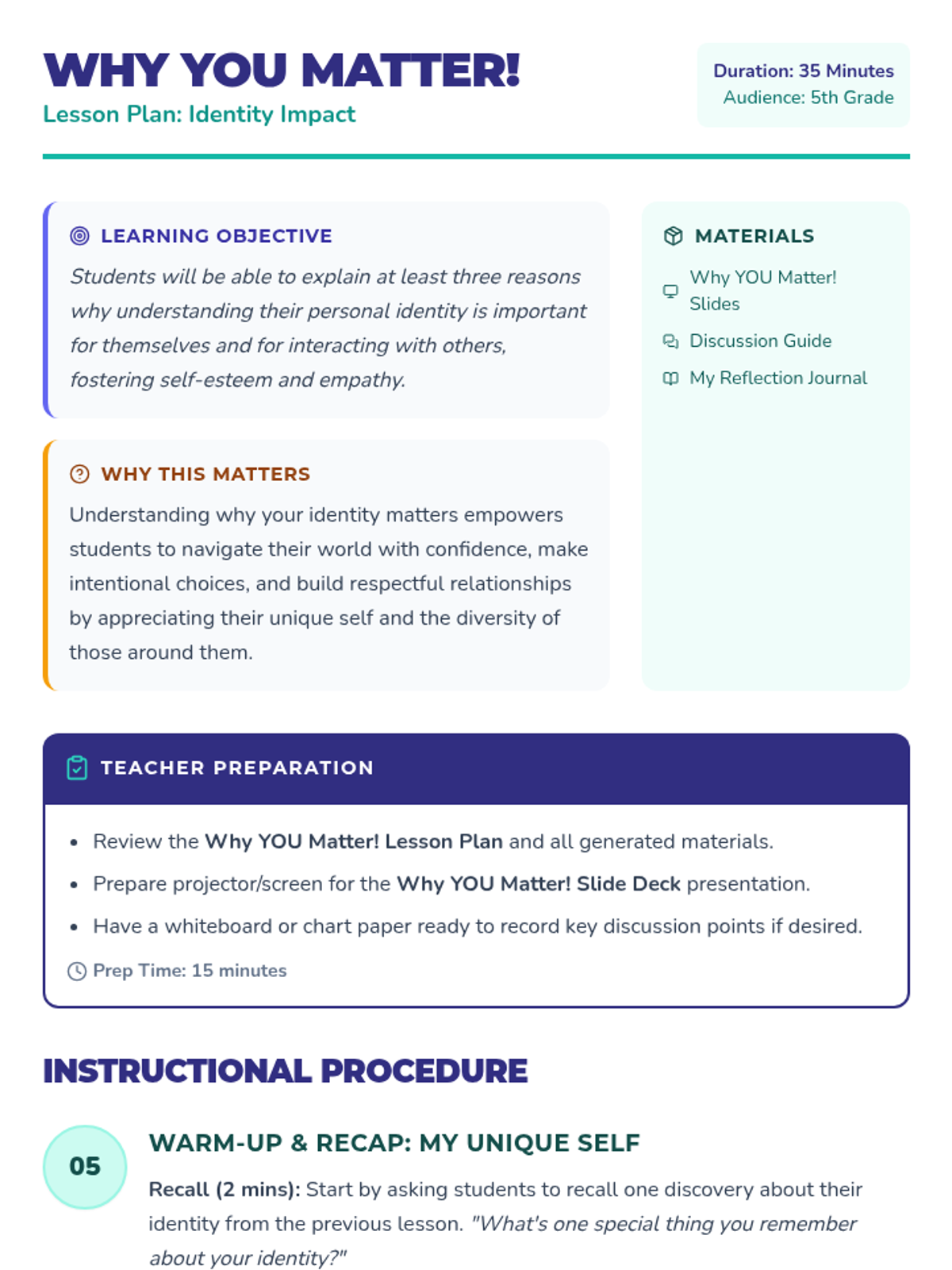 A two-part sequence for 5th-grade students to explore their personal identity, recognize their unique strengths, and understand why self-awareness is vital for confidence and community.