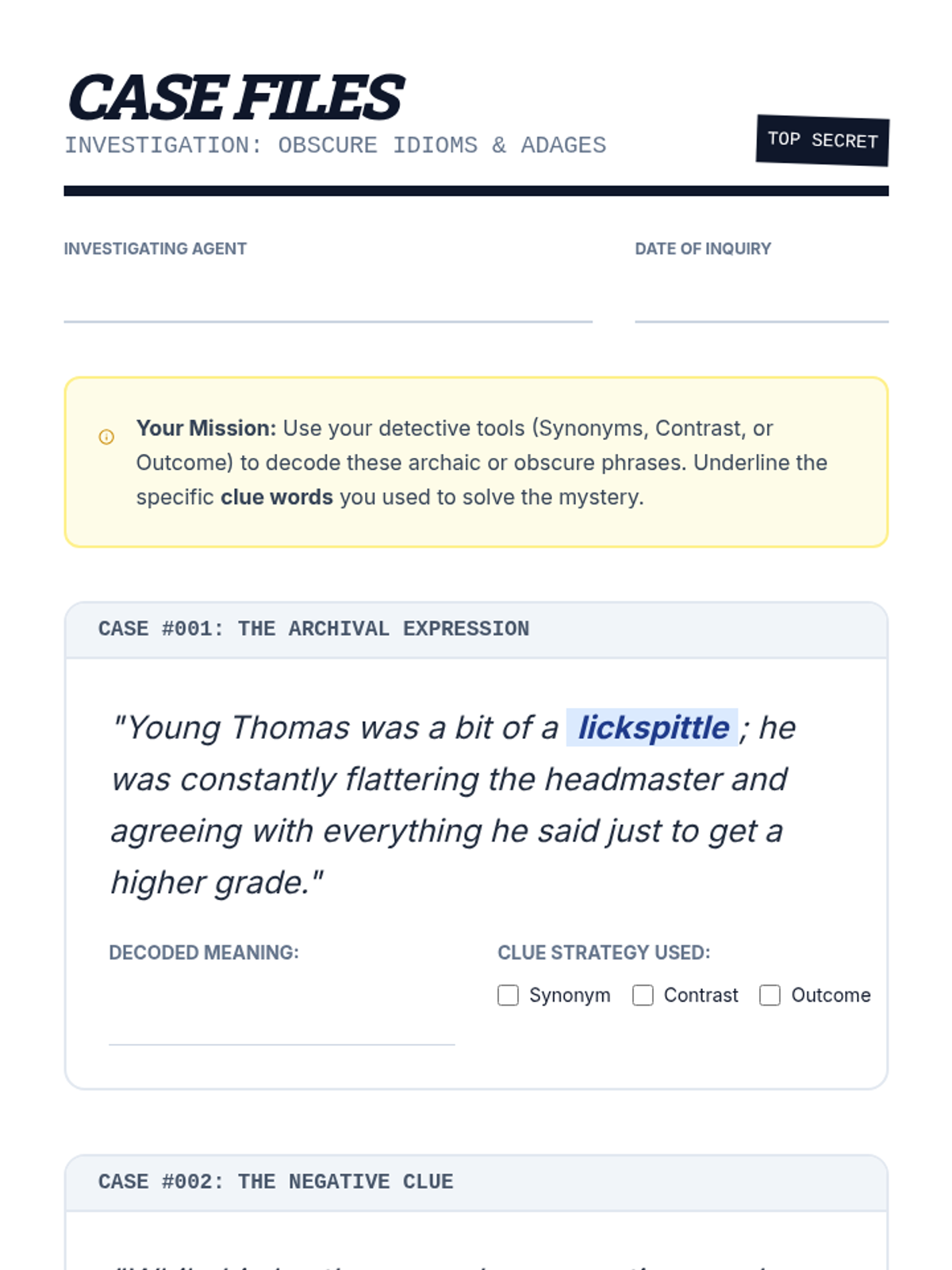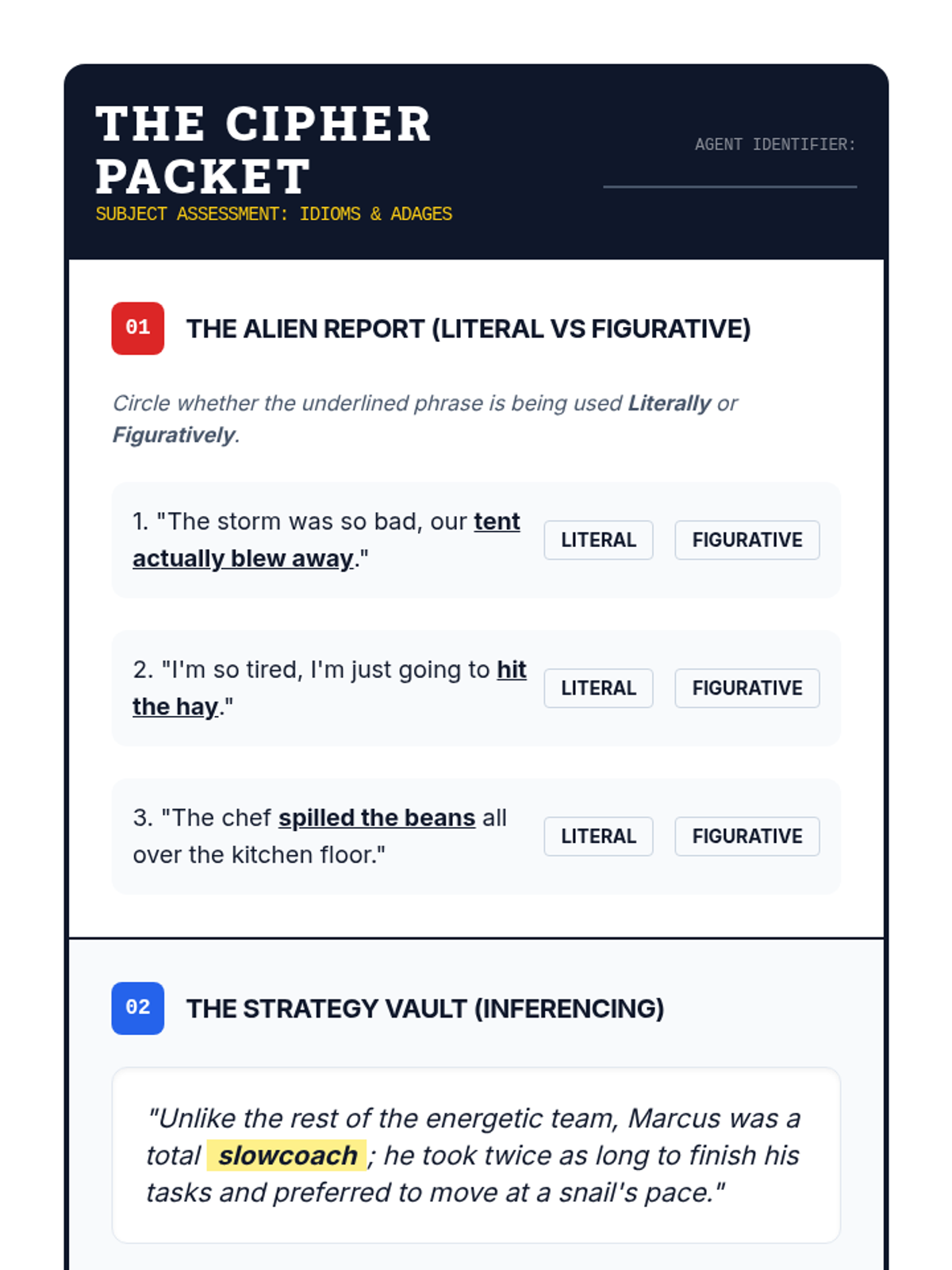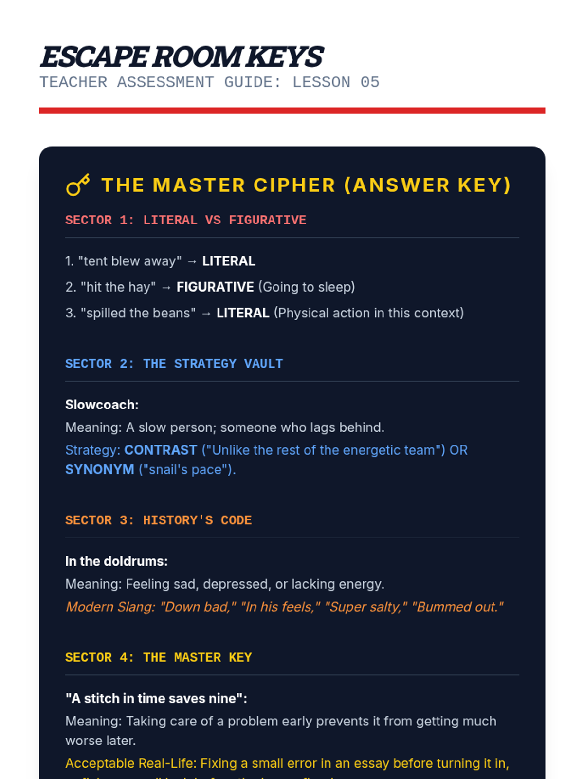 A game-based vocabulary sequence for 8th graders that treats idioms and adages as linguistic codes. Students develop context-clue strategies to decipher unfamiliar figurative language across various genres and historical periods.