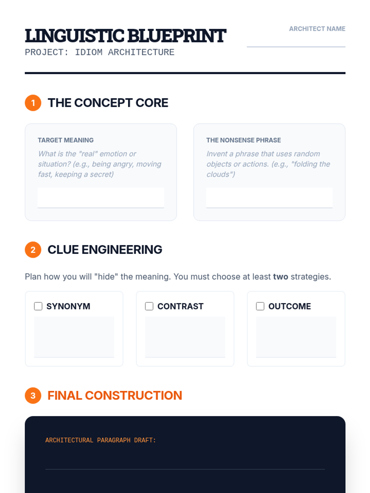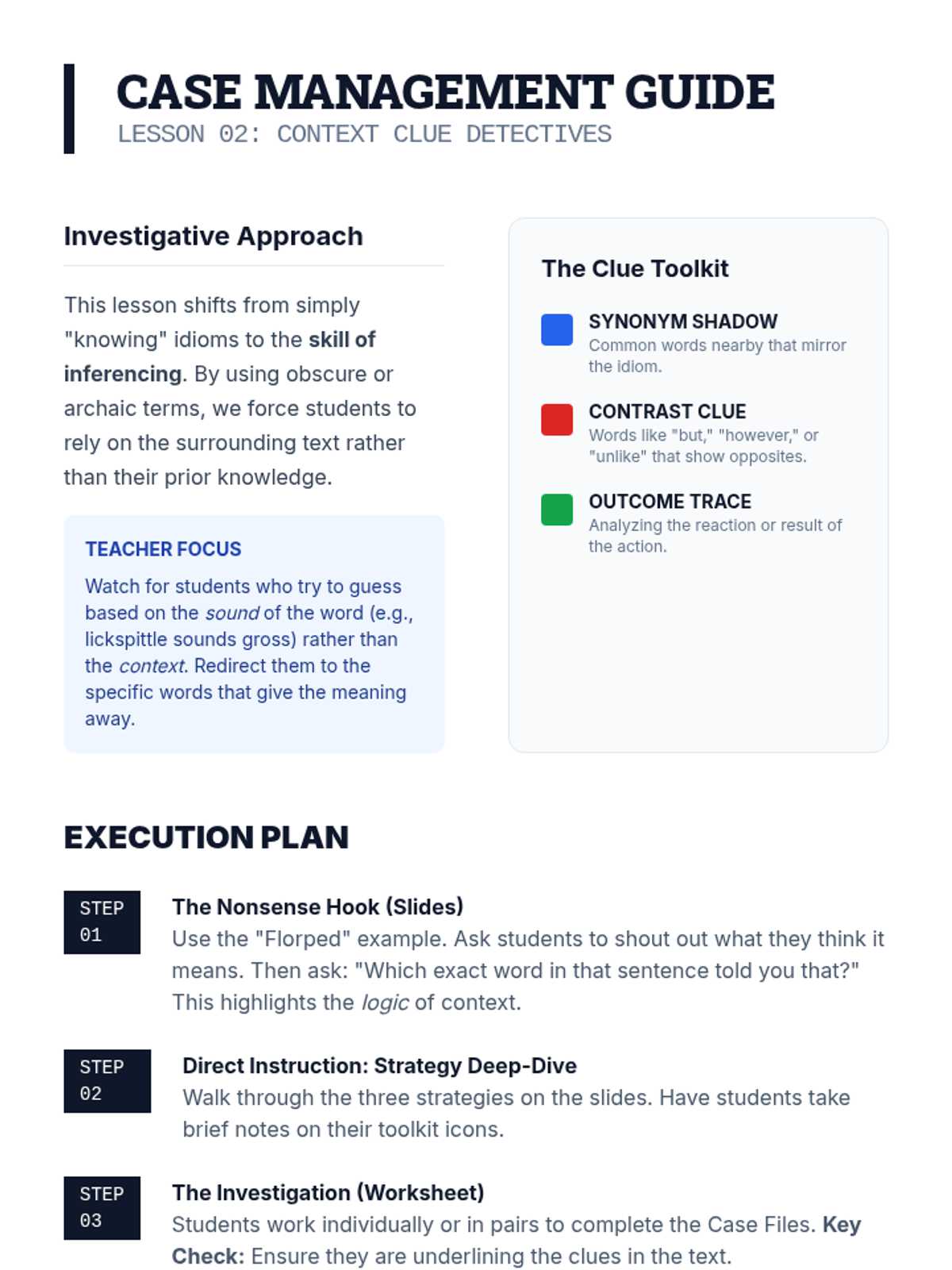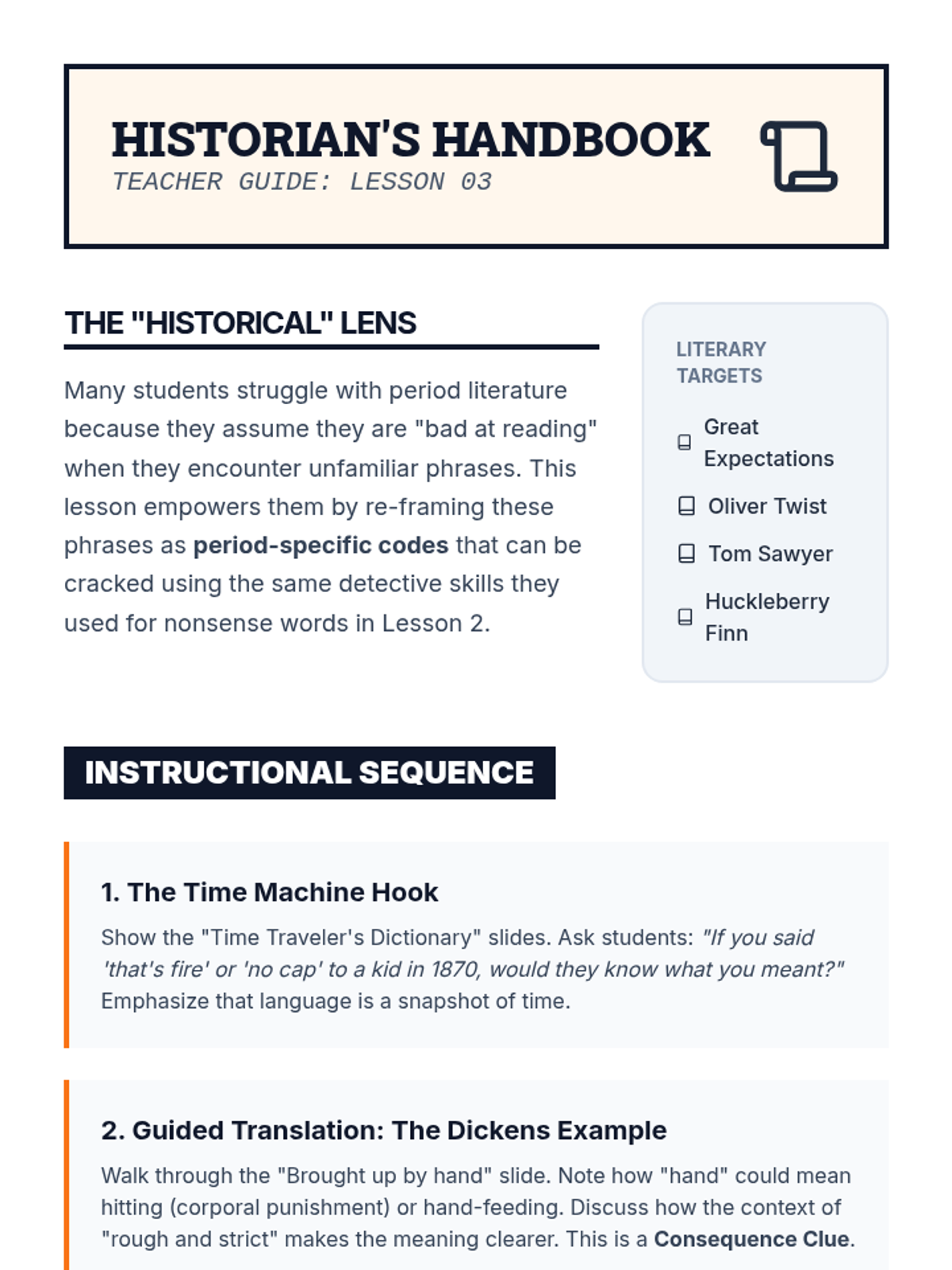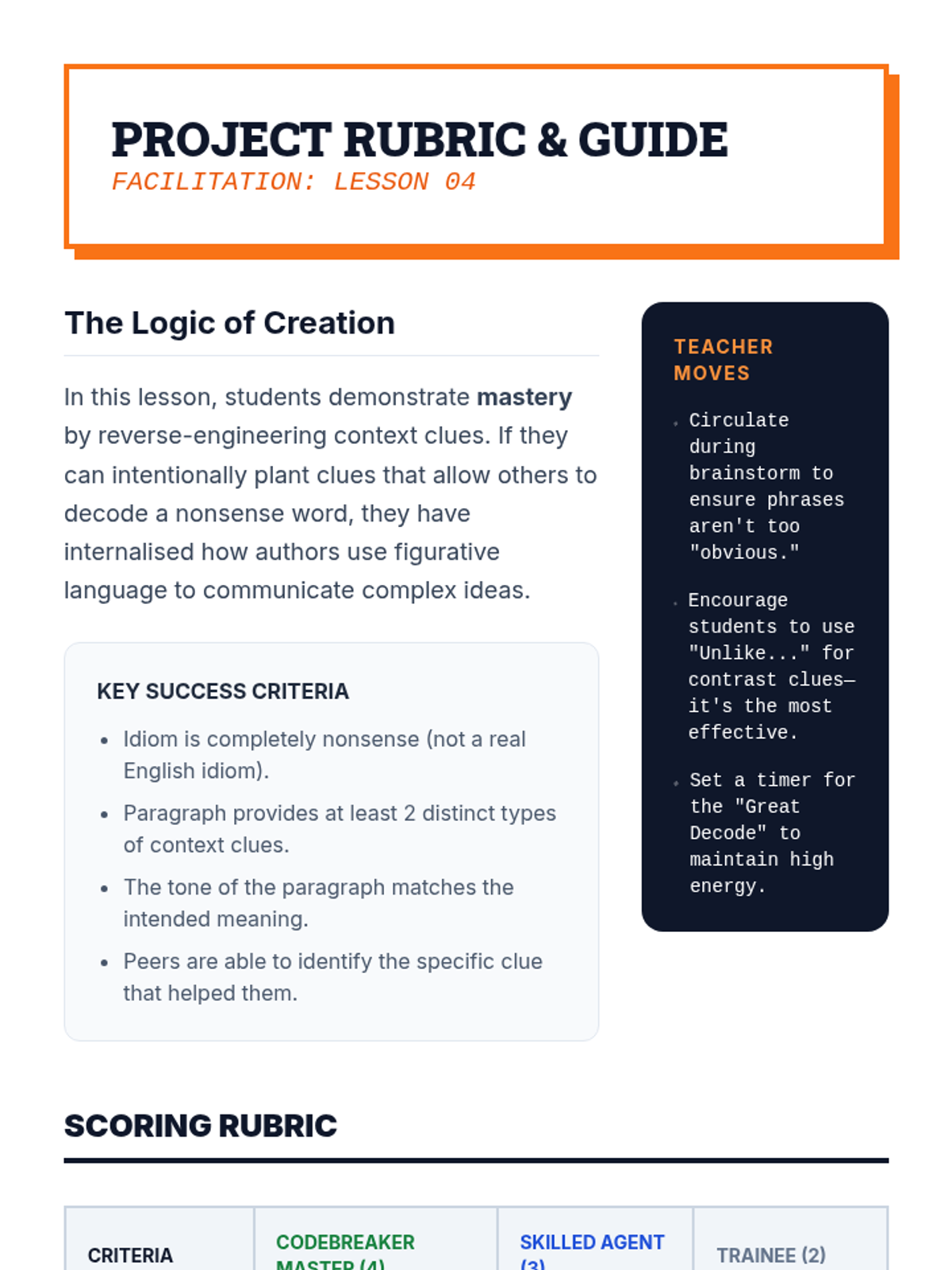 A game-based vocabulary sequence for 8th graders that treats idioms and adages as linguistic codes. Students develop context-clue strategies to decipher unfamiliar figurative language across various genres and historical periods.