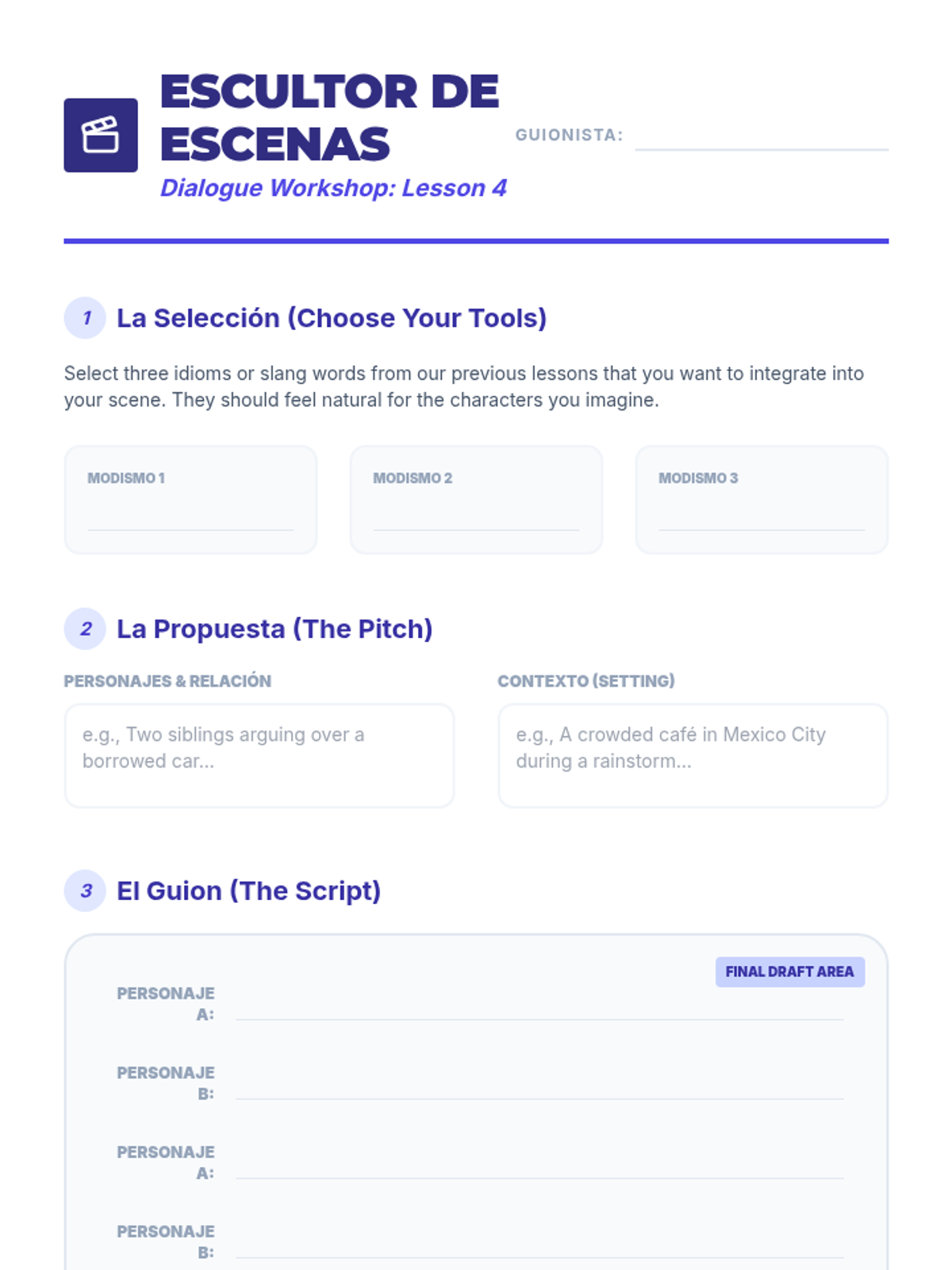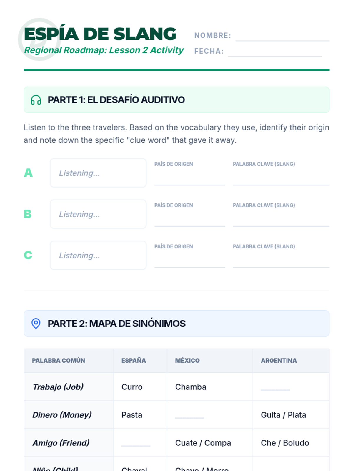 Students explore Spanish idioms and colloquialisms through a 'Traveler's Field Guide' lens, learning to interpret non-literal meanings and regional variations across Spain, Mexico, Argentina, and the Caribbean. The sequence culminates in a creative performance demonstrating linguistic and cultural mastery.