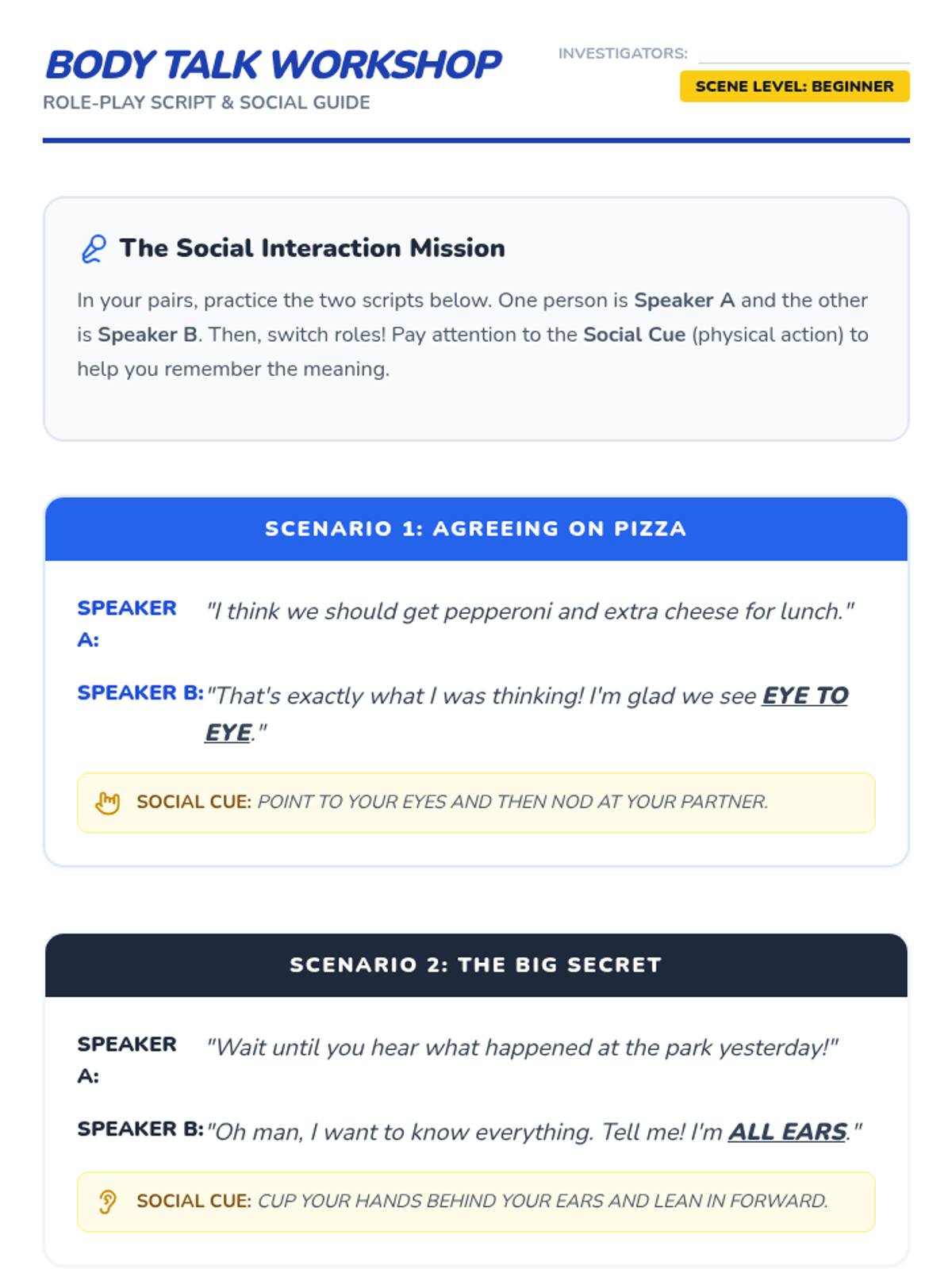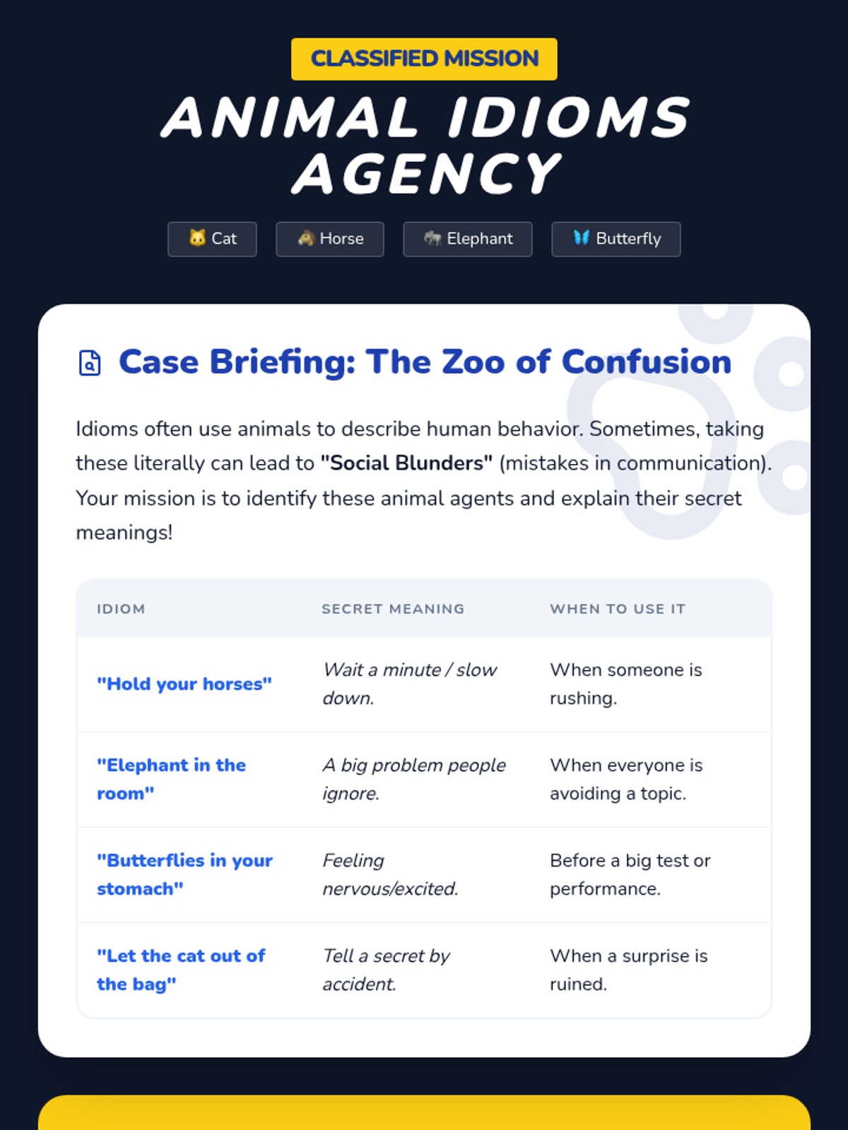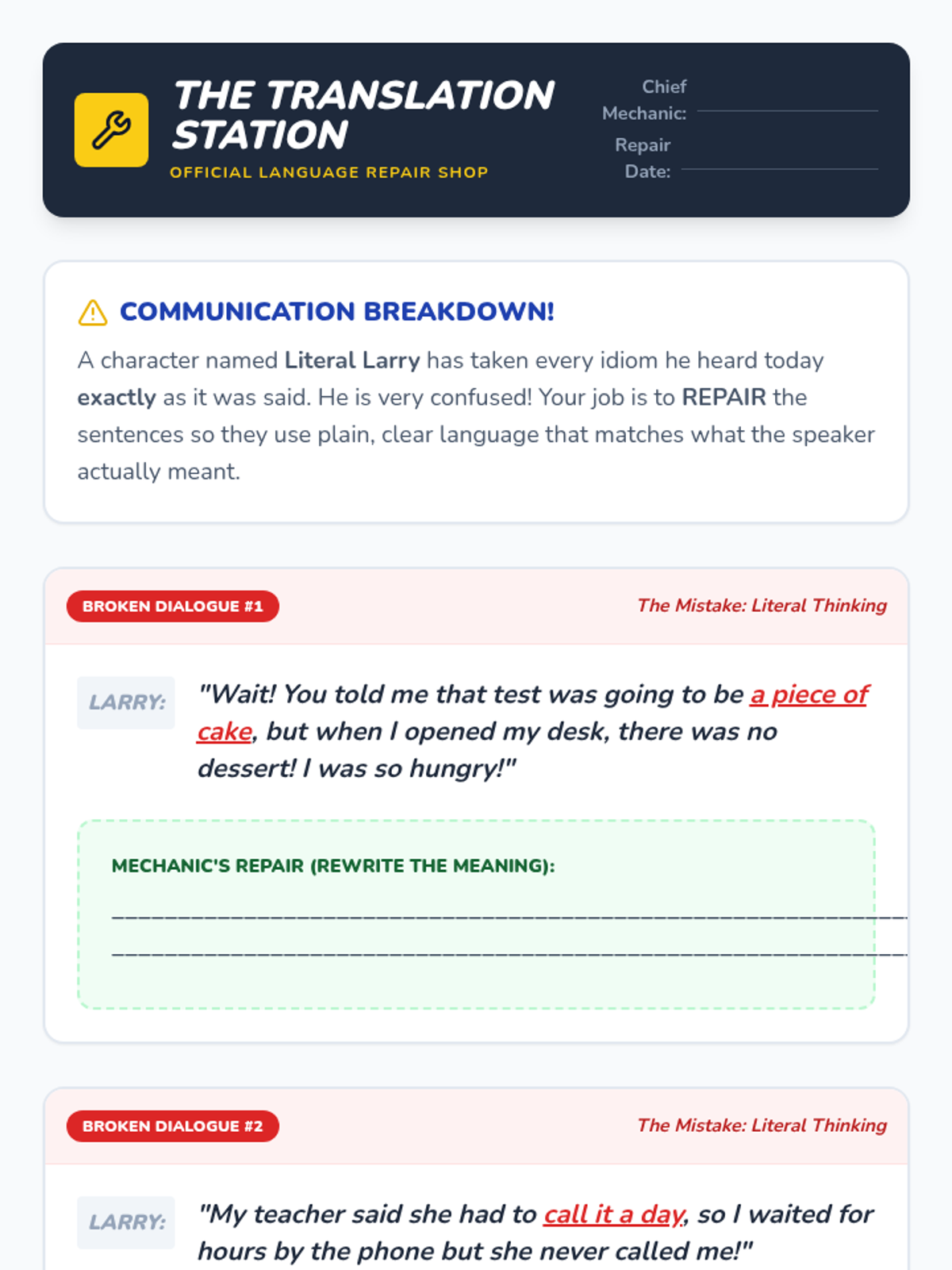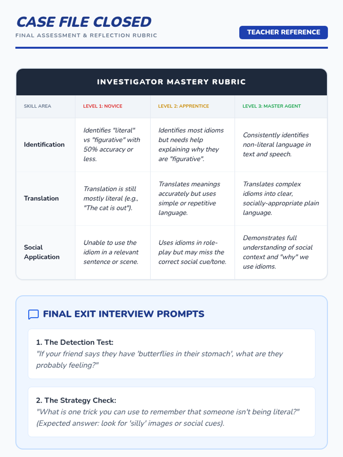 A 5-lesson sequence for 6th-grade students focusing on distinguishing literal from figurative language through visual support, games, and social-emotional learning contexts. Students will progress from visual interpretation to social application of common idioms.