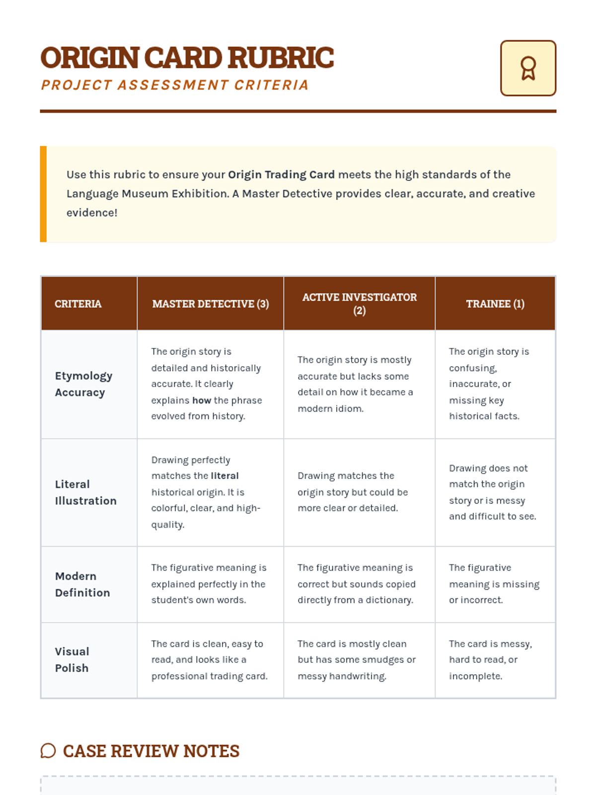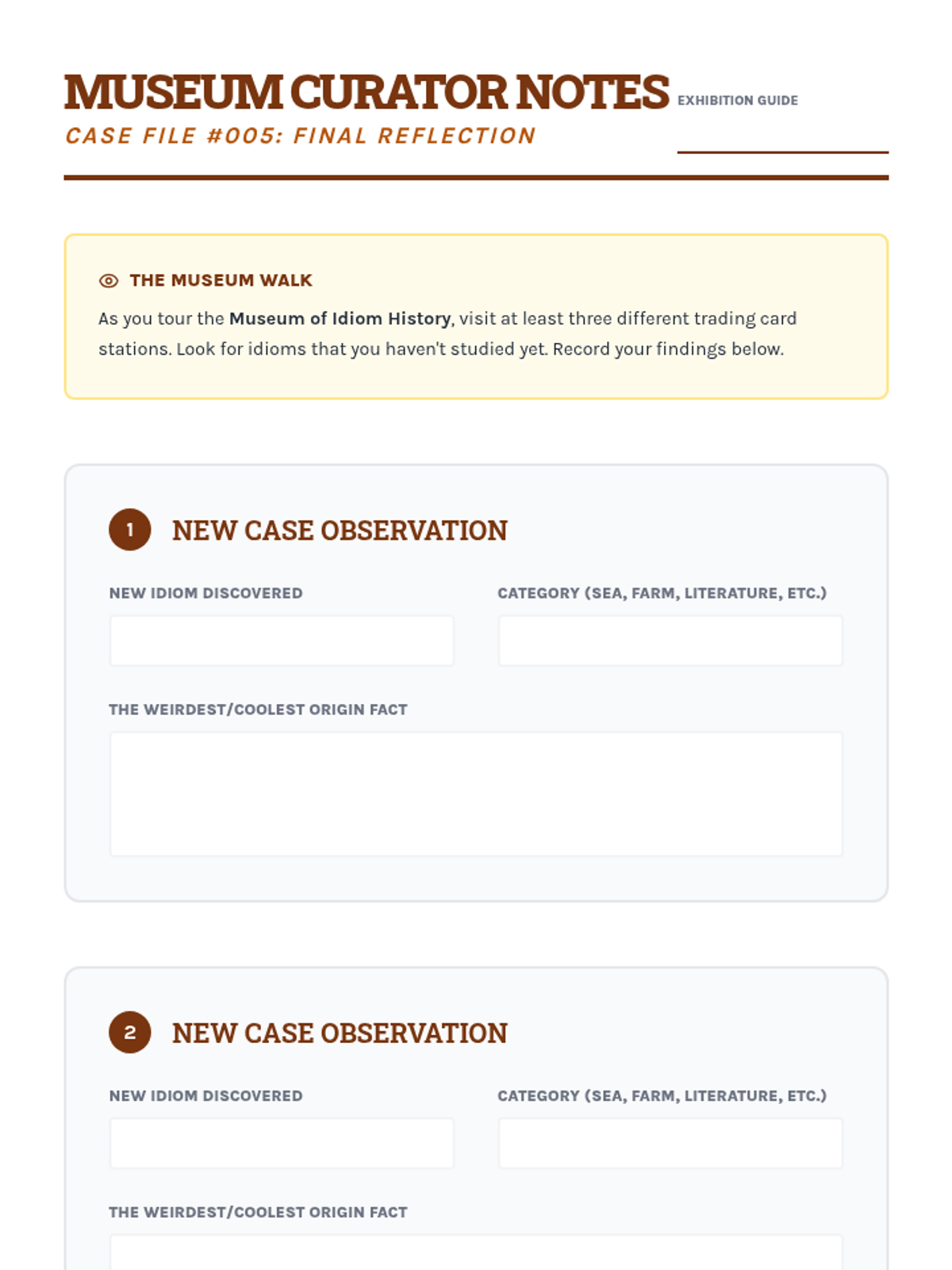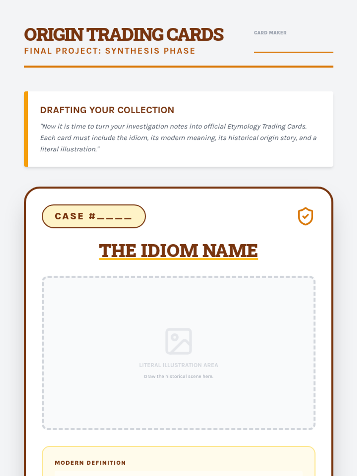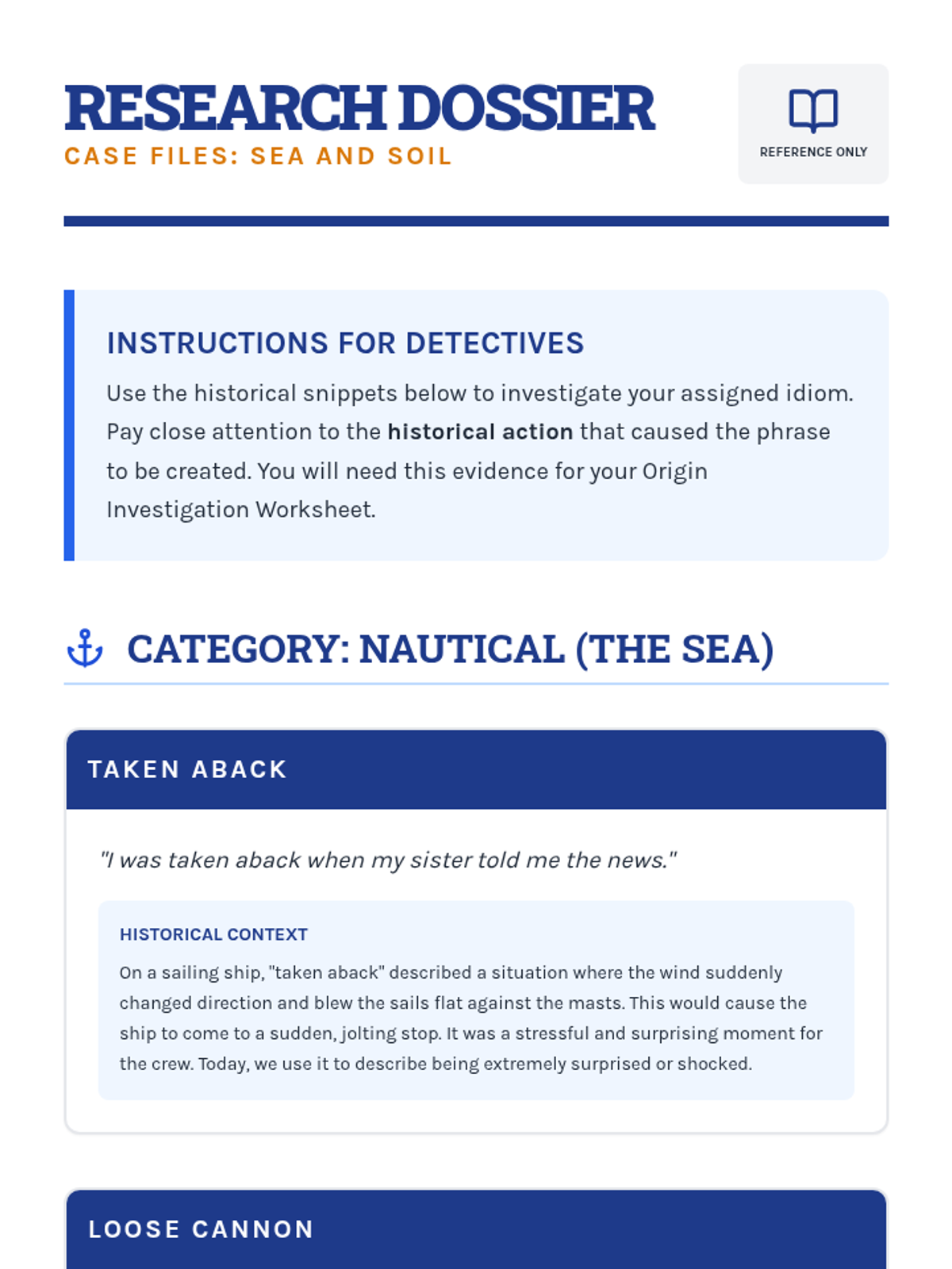 Students investigate the historical origins and etymology of common idioms, acting as 'Word Detectives' to uncover how nautical, agricultural, and literary history shaped modern English.