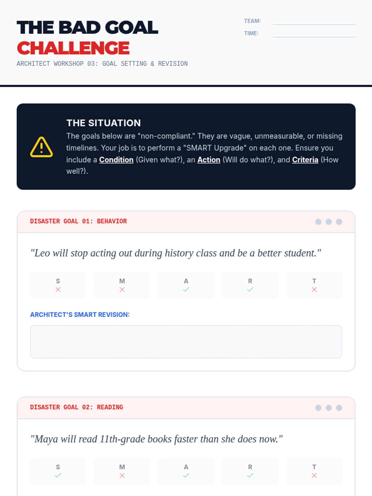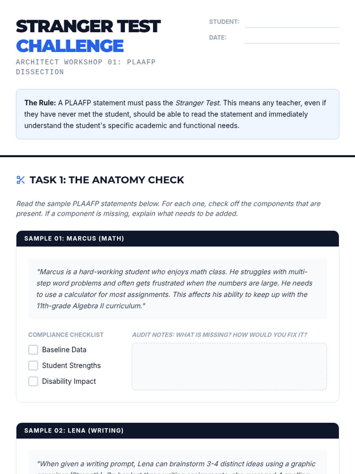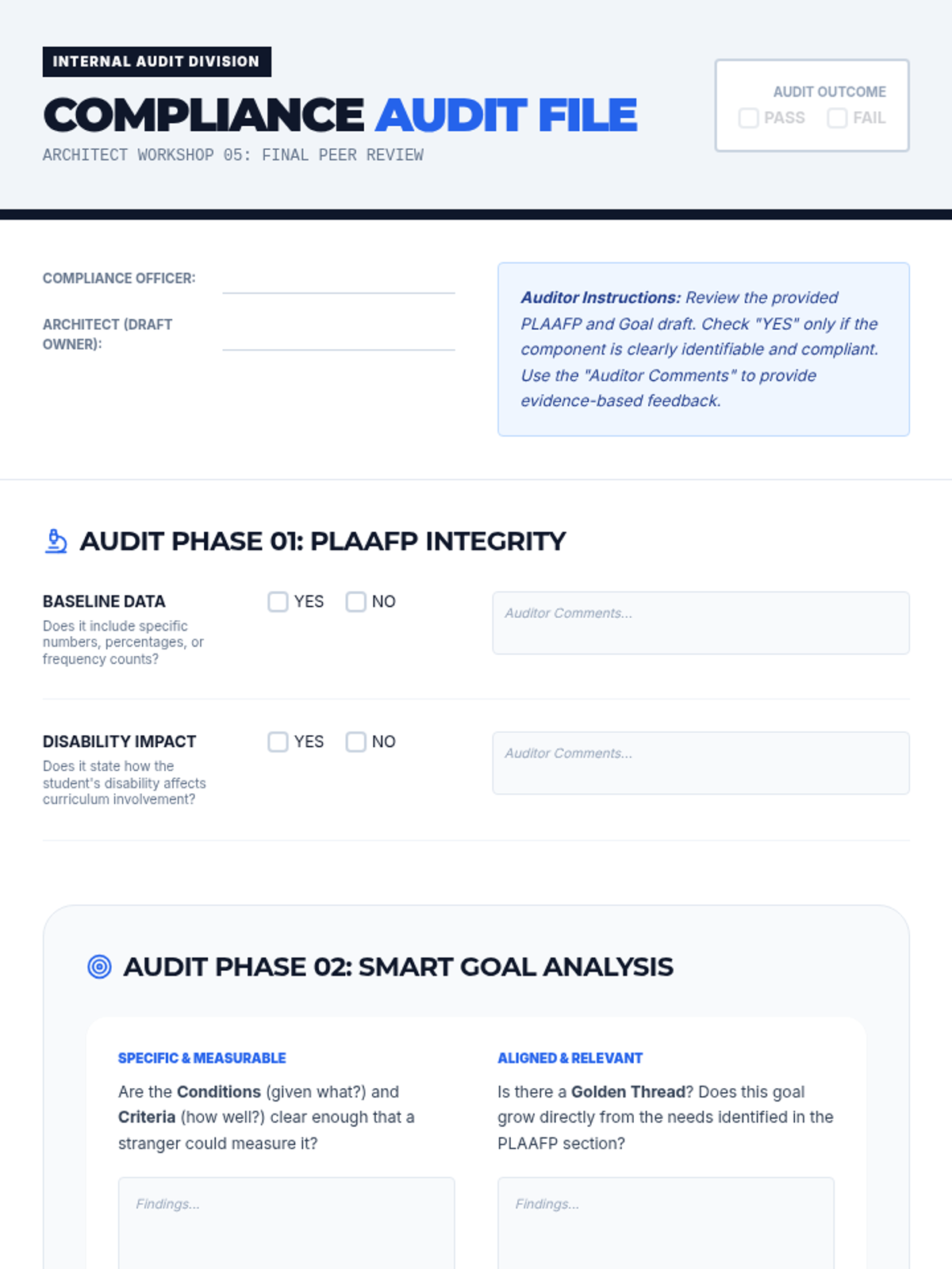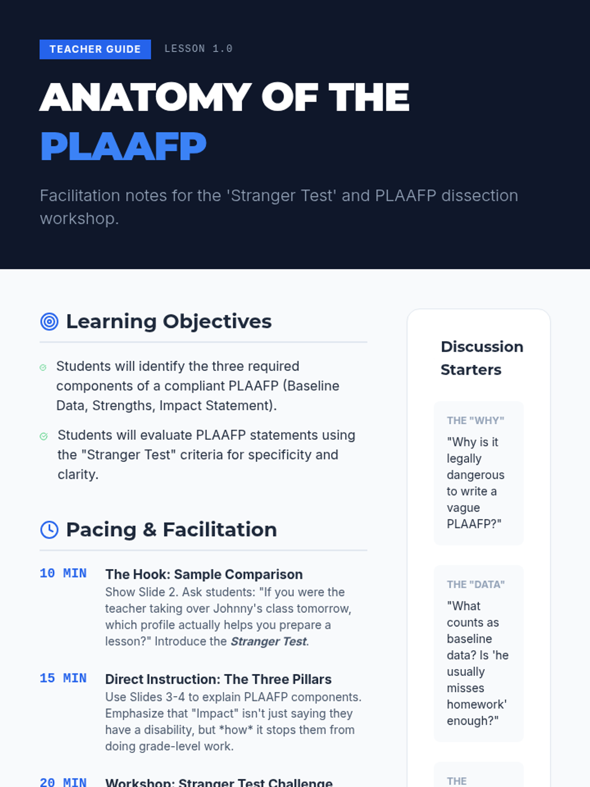 This 5-lesson sequence equips 11th-grade students with the technical writing and analytical skills needed to develop core IEP components. Students progress from dissecting PLAAFP statements to analyzing data, constructing SMART goals, and aligning those goals with state standards, culminating in a peer compliance audit.