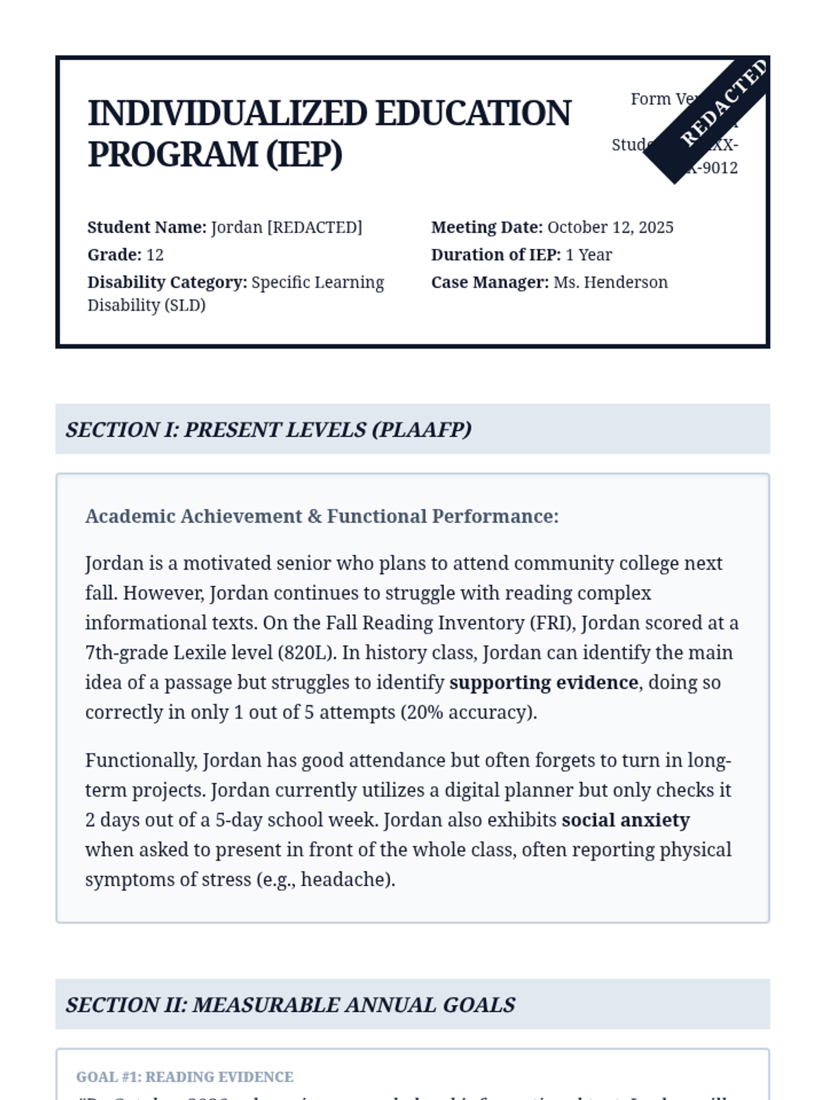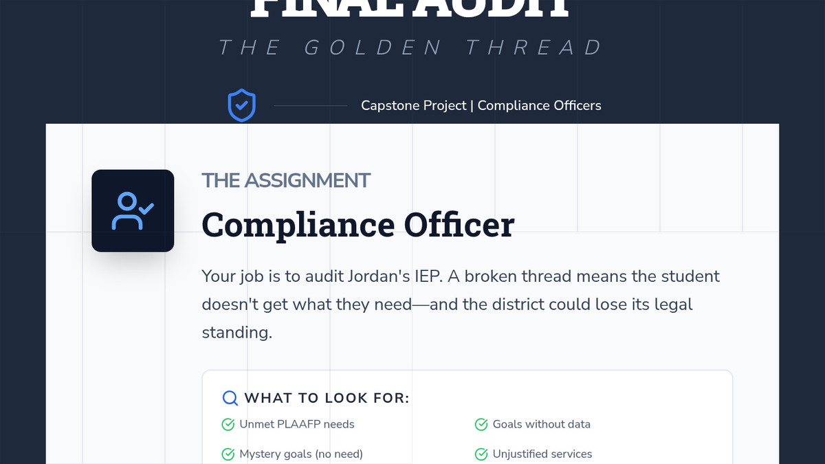 A systematic dissection of the IEP document for 12th-grade students, focusing on the 'Golden Thread' of alignment between present levels, goals, and services. Students learn to audit IEPs for internal consistency and advocate for their own educational rights.