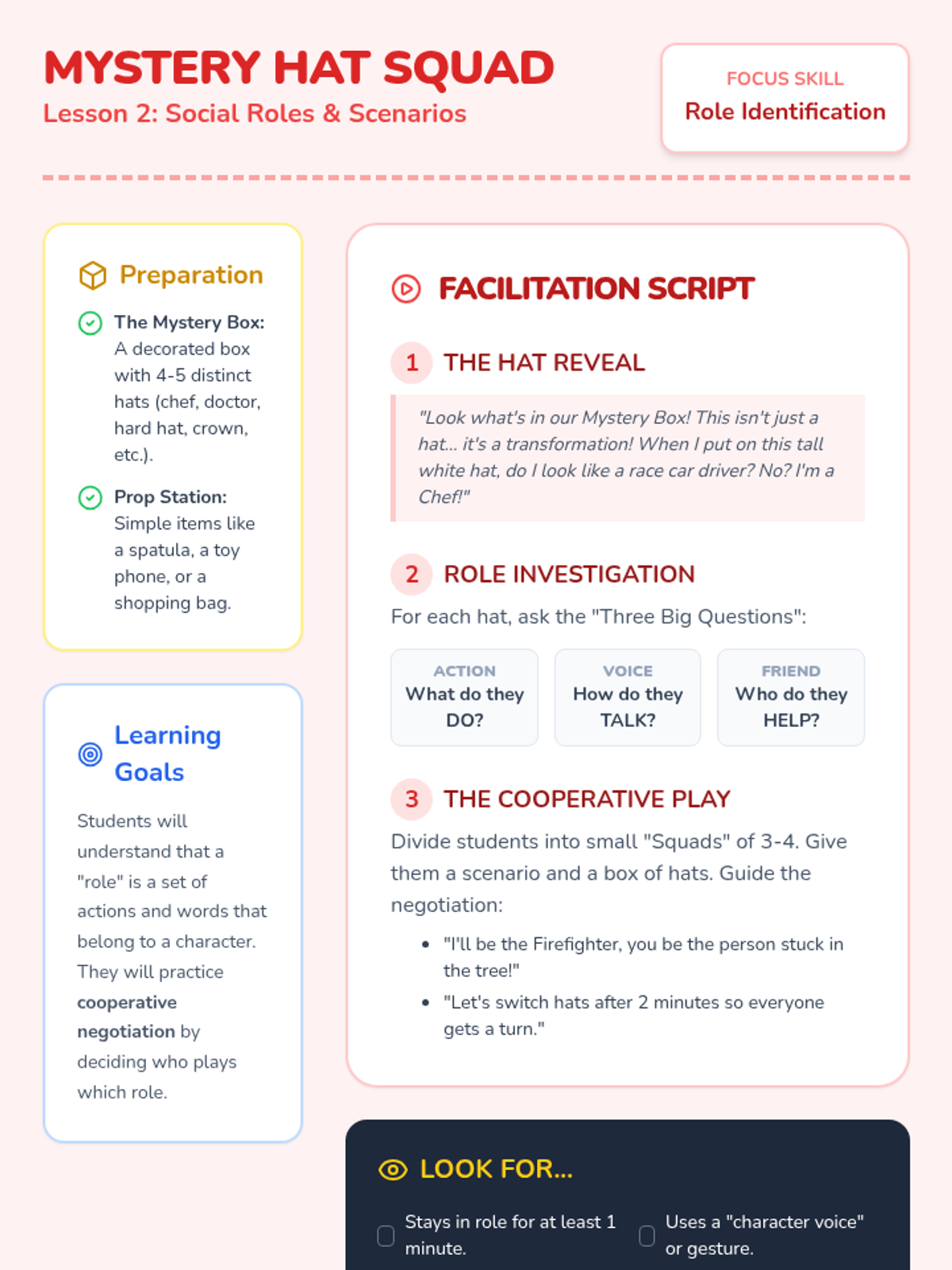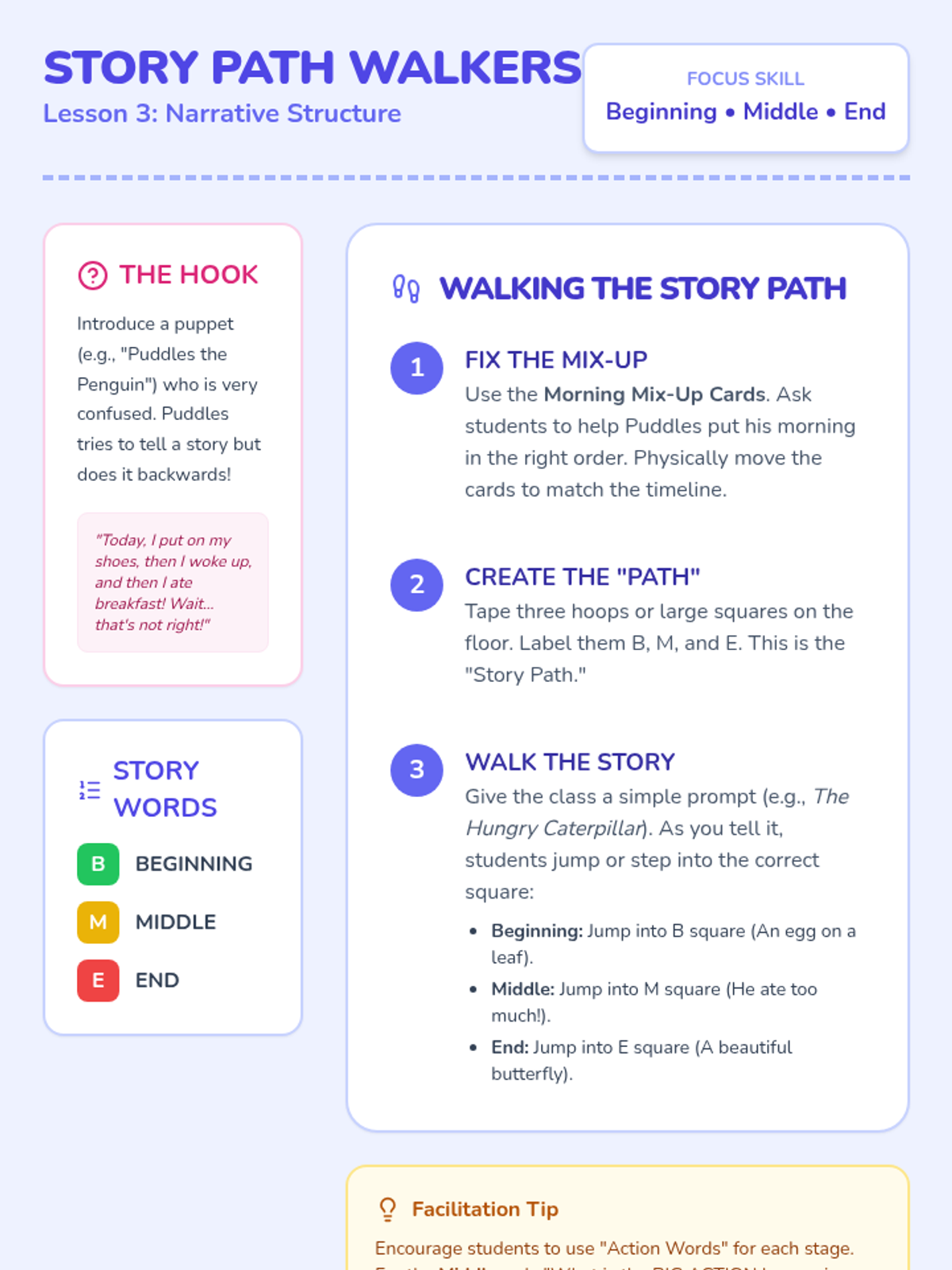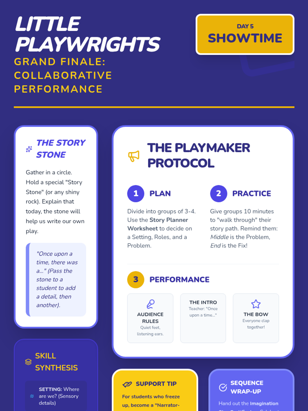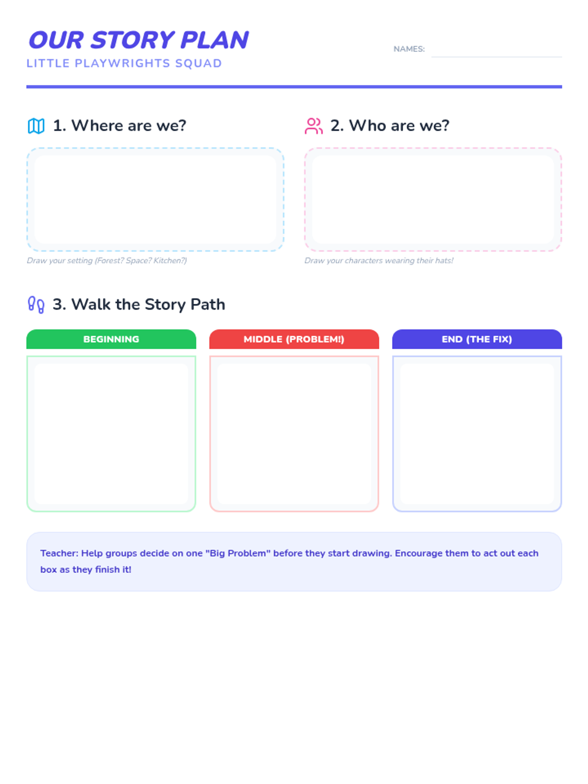 A Pre-K sequence focused on theater, guiding students to build shared imaginary worlds, assign roles, and solve dramatic conflicts together. Students will learn the basics of narrative structure and collaborative play through sensory exploration and role-play scenarios.
