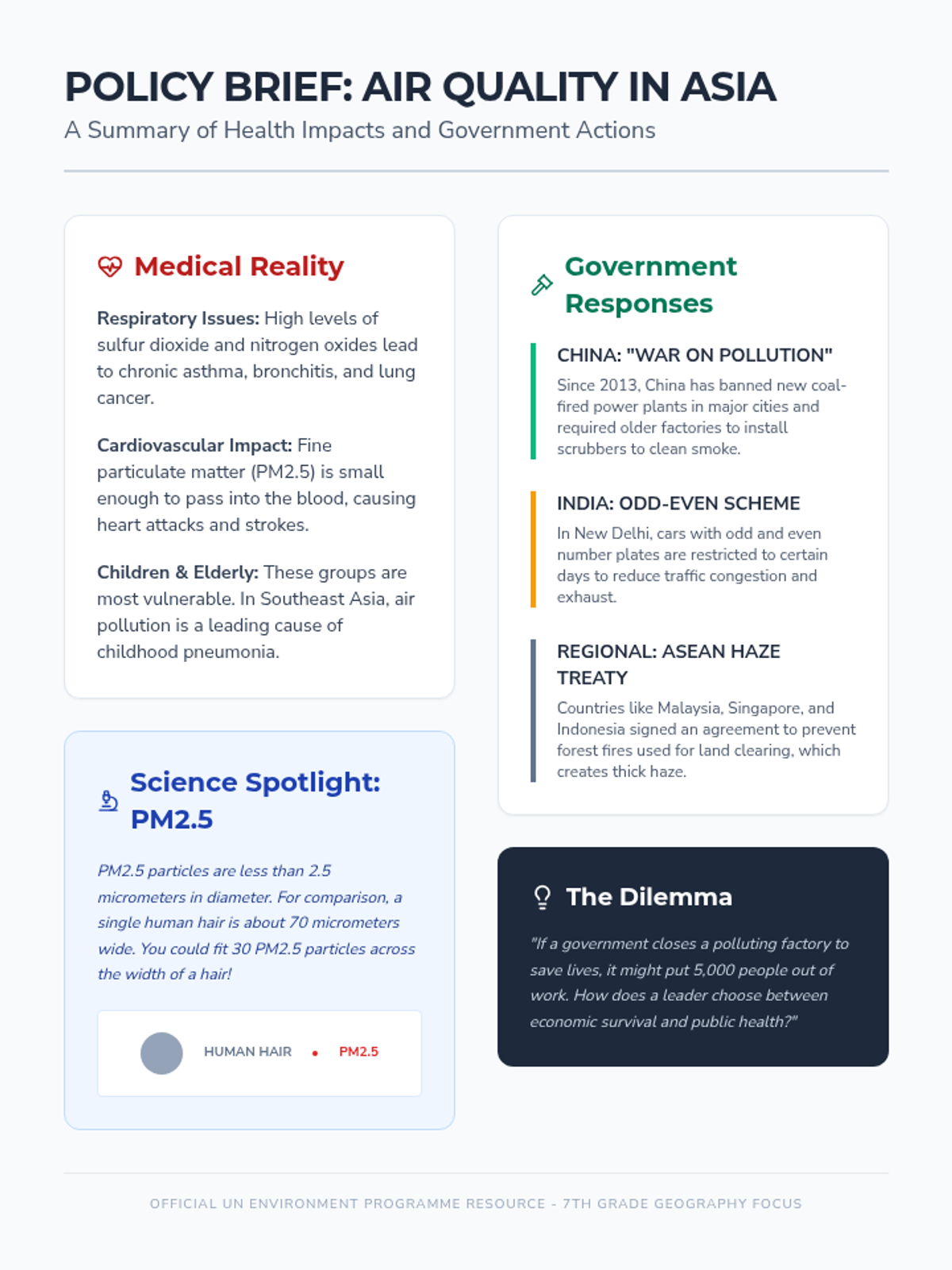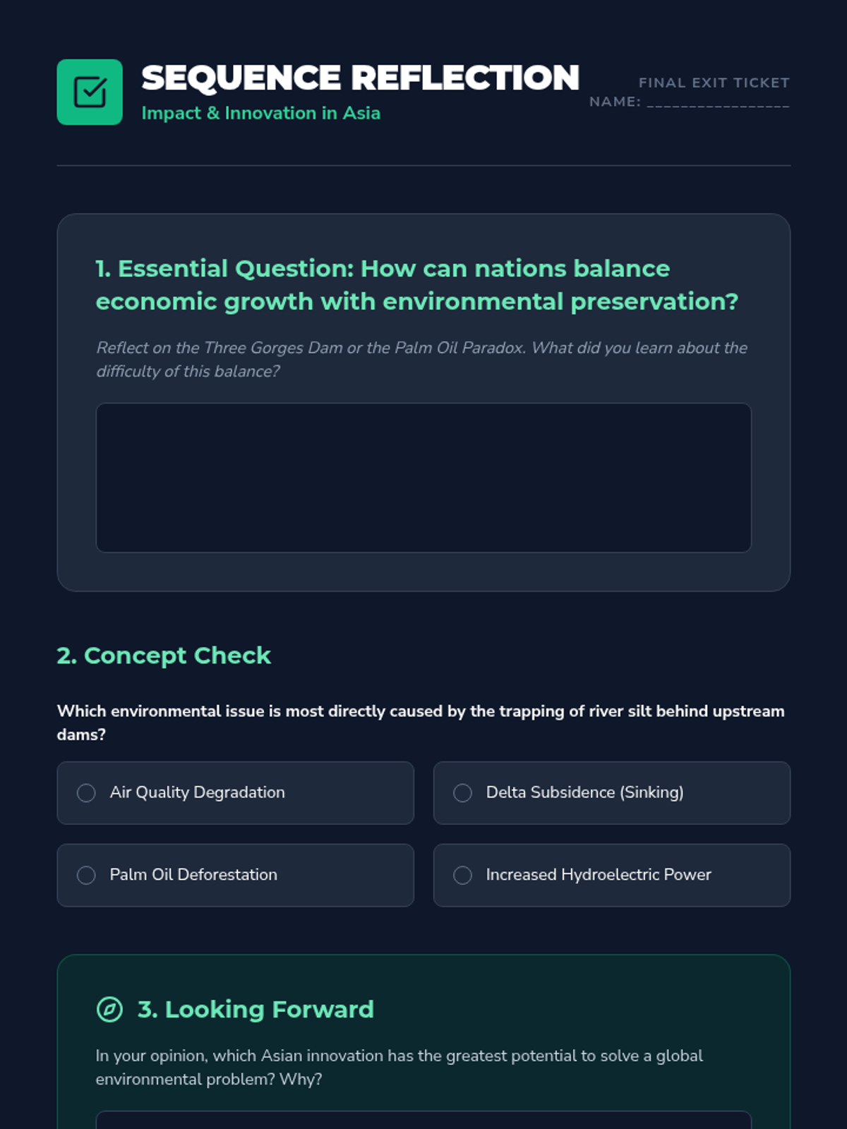 This sequence explores the environmental consequences of rapid development in Asia and the strategies being implemented to mitigate them. Students investigate the Three Gorges Dam, air pollution, disappearing deltas, deforestation, and green innovations through case studies, data analysis, and debate.
