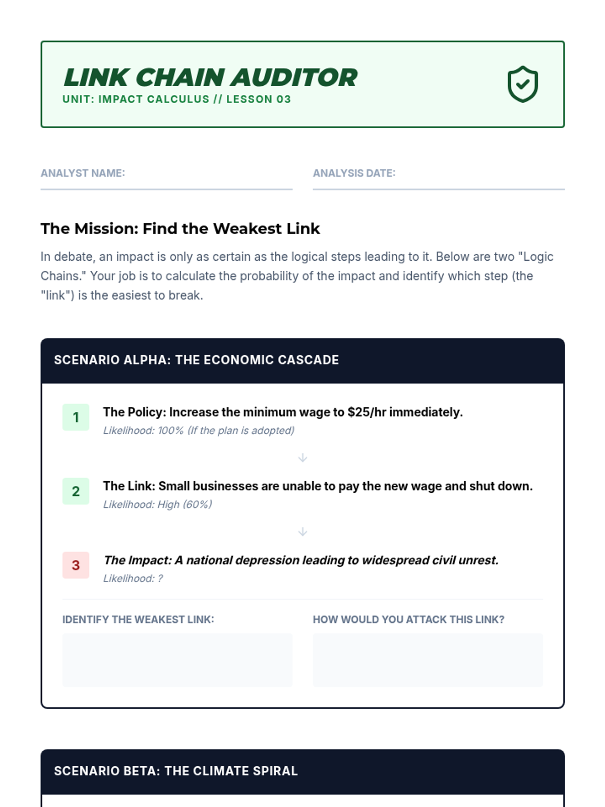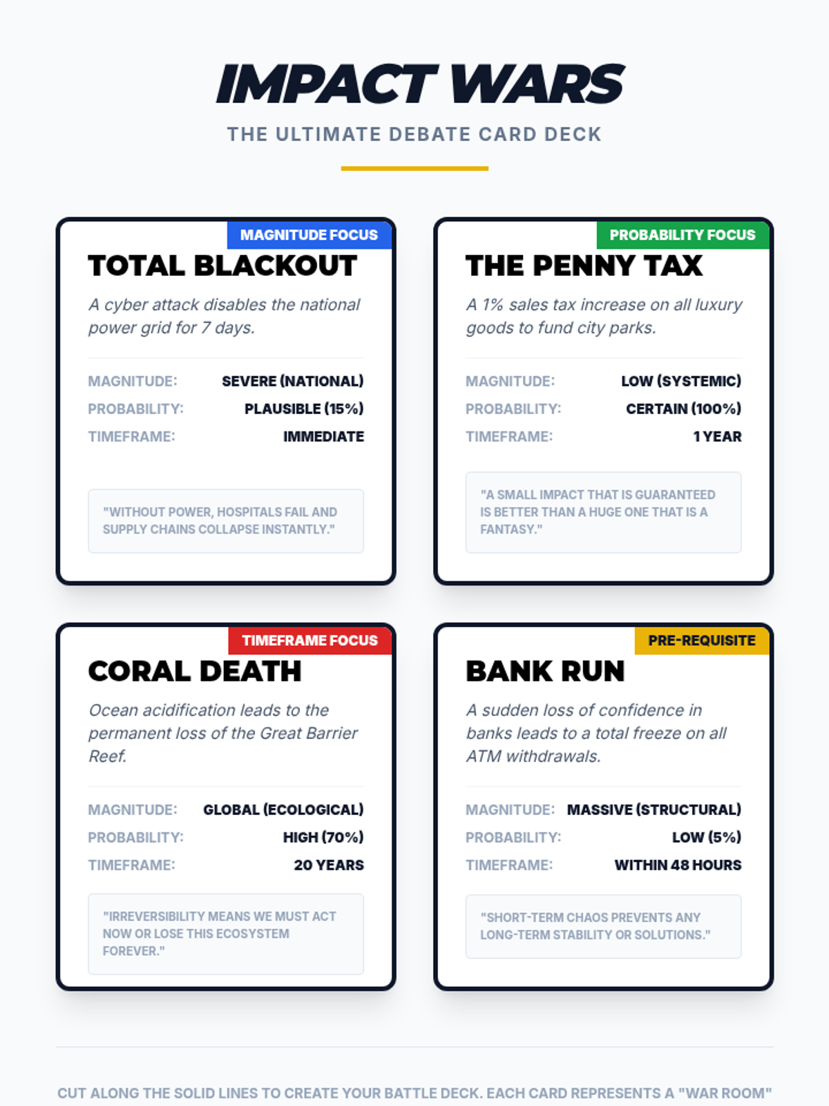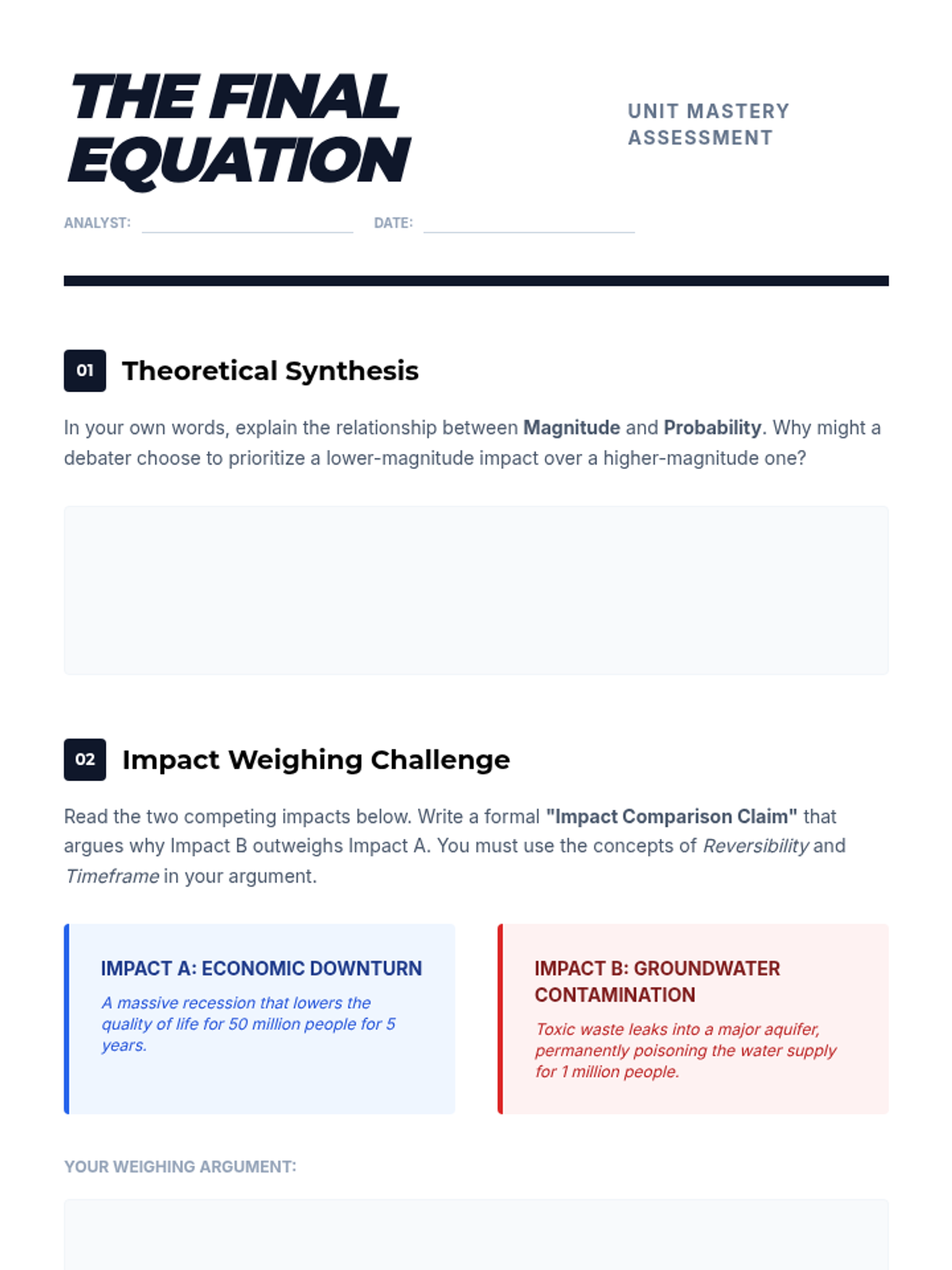 A comprehensive unit for 9th-grade students on impact calculus in debate, focusing on magnitude, probability, and timeframe to evaluate the weight of arguments.
