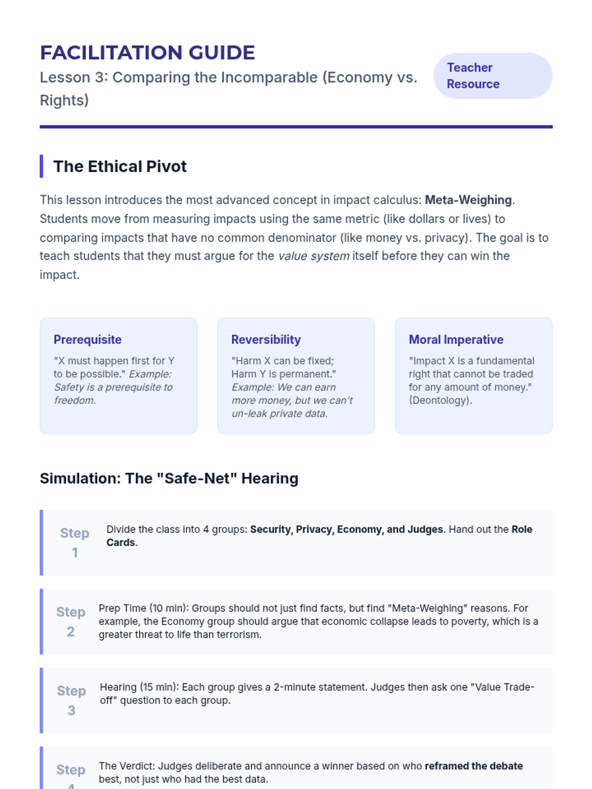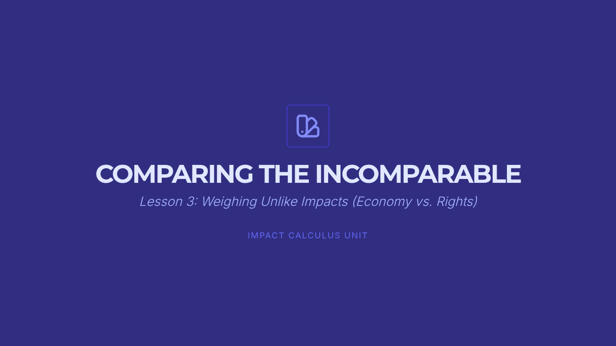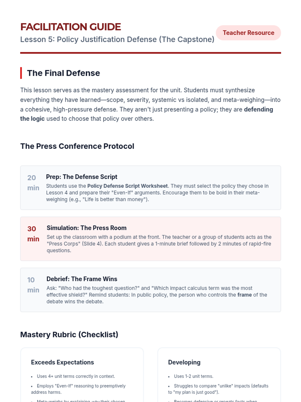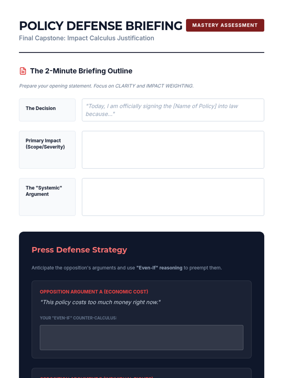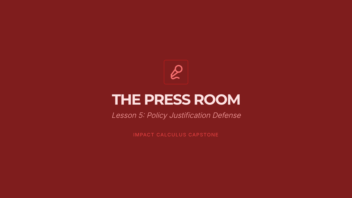 This sequence applies impact calculus to complex real-world policy decisions, moving beyond abstract debate theory to concrete analysis. Students examine case studies to understand how leaders weigh competing interests and culminate in a policy justification simulation.