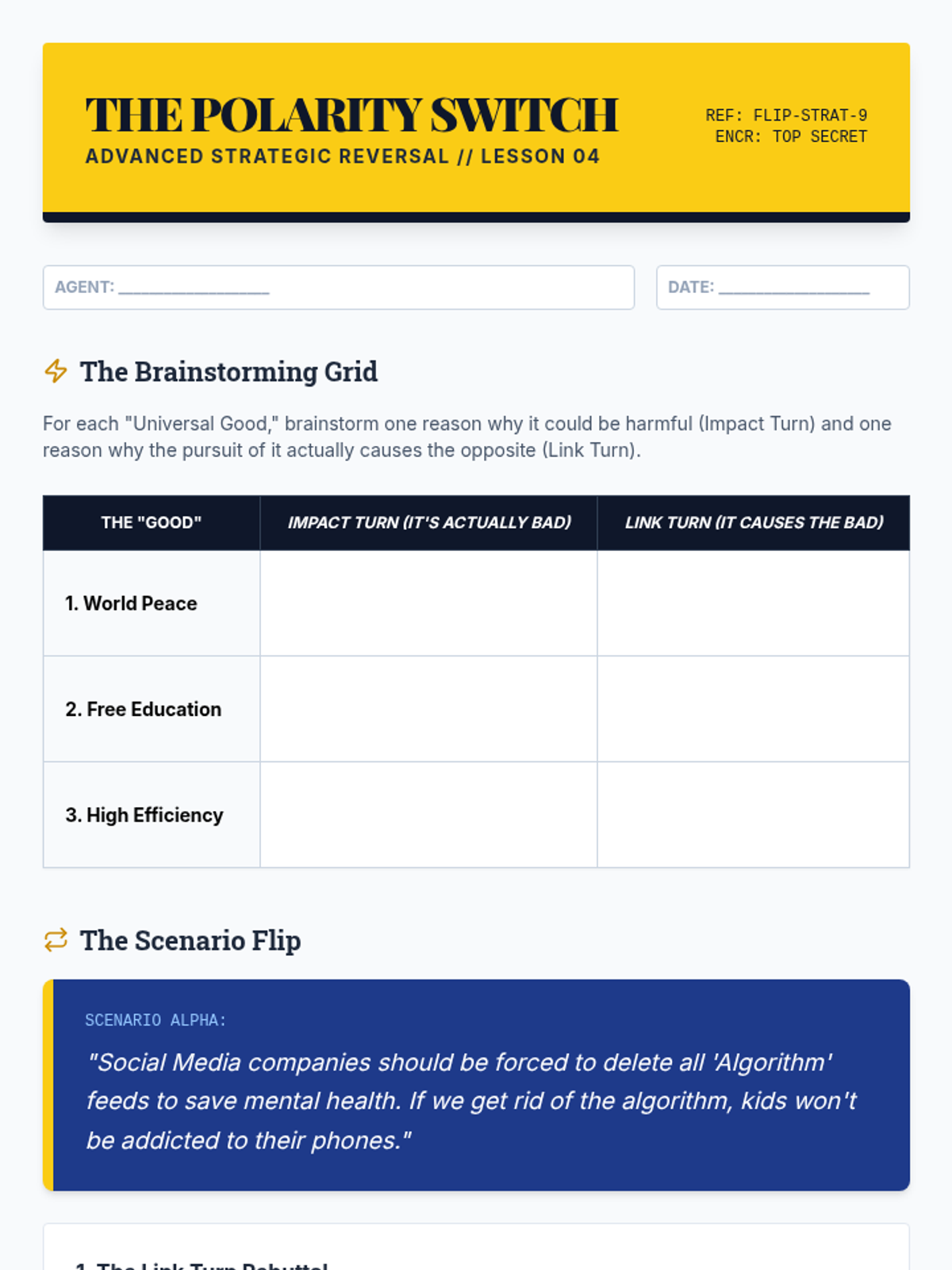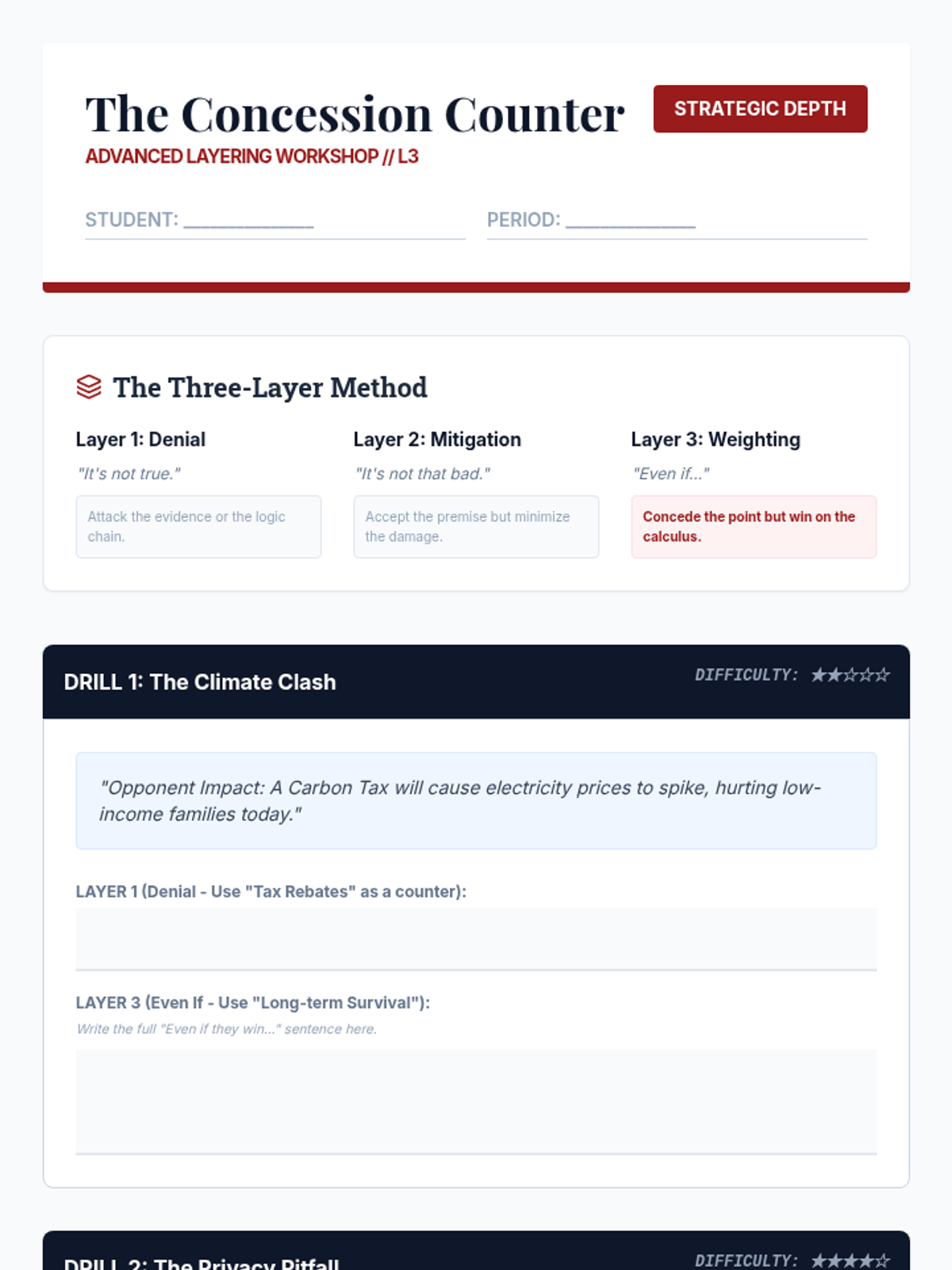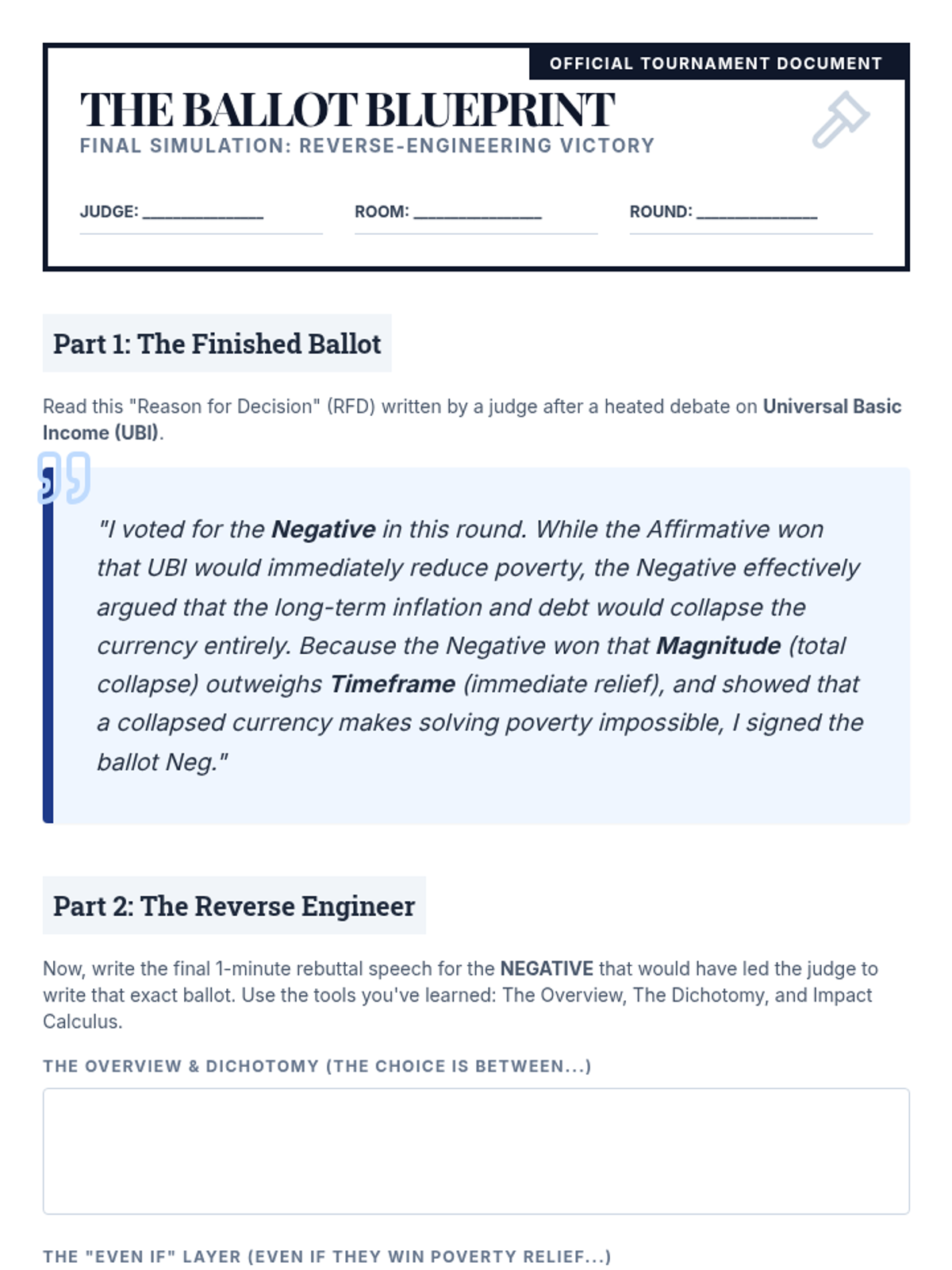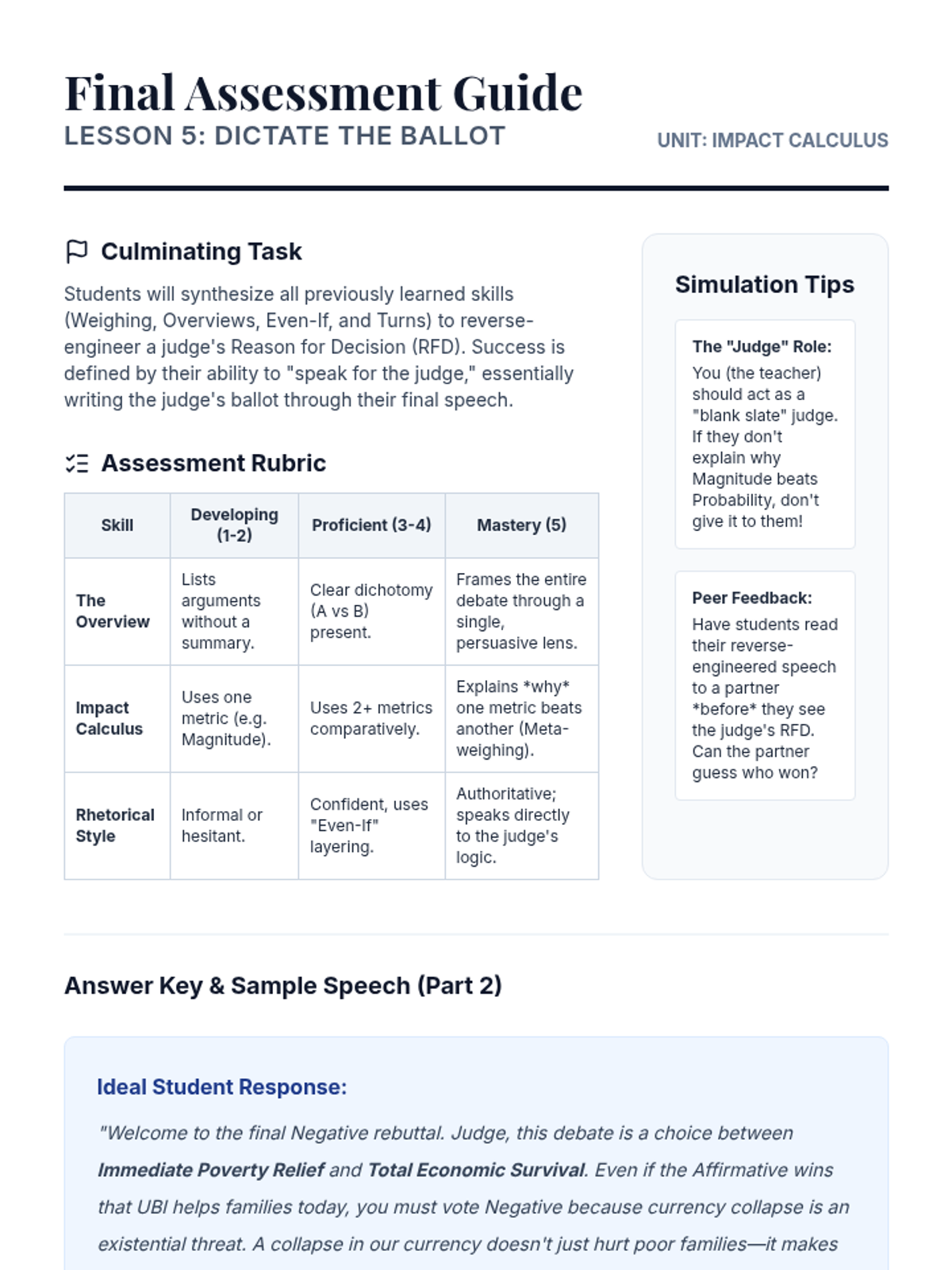 A comprehensive sequence for 9th-grade debate students focusing on impact calculus, comparative rebuttals, and closing arguments. Students move from analyzing weighing mechanisms to mastering advanced techniques like 'Even If' arguments and impact turns, culminating in the ability to write their own 'Reason for Decision' ballots.