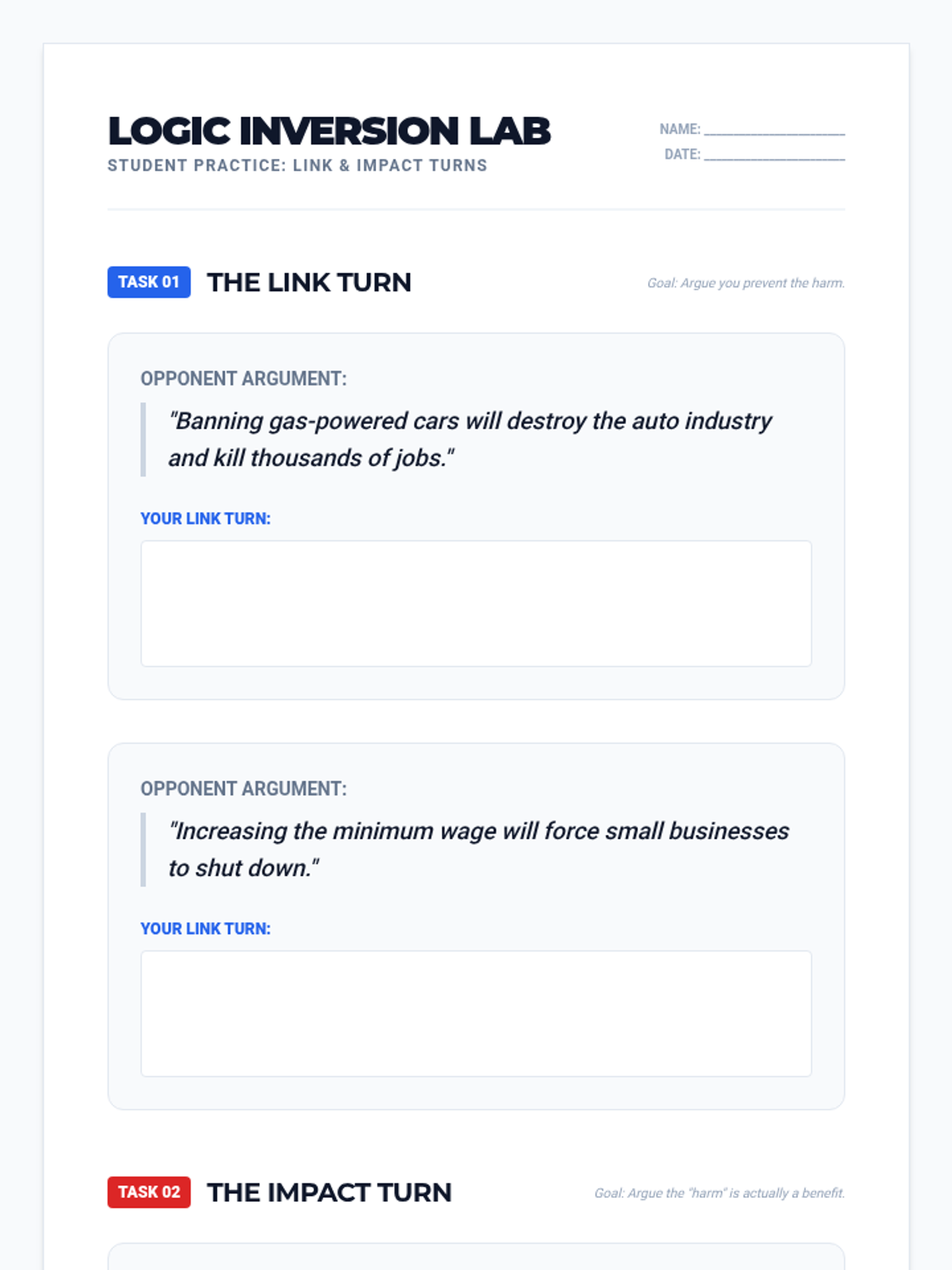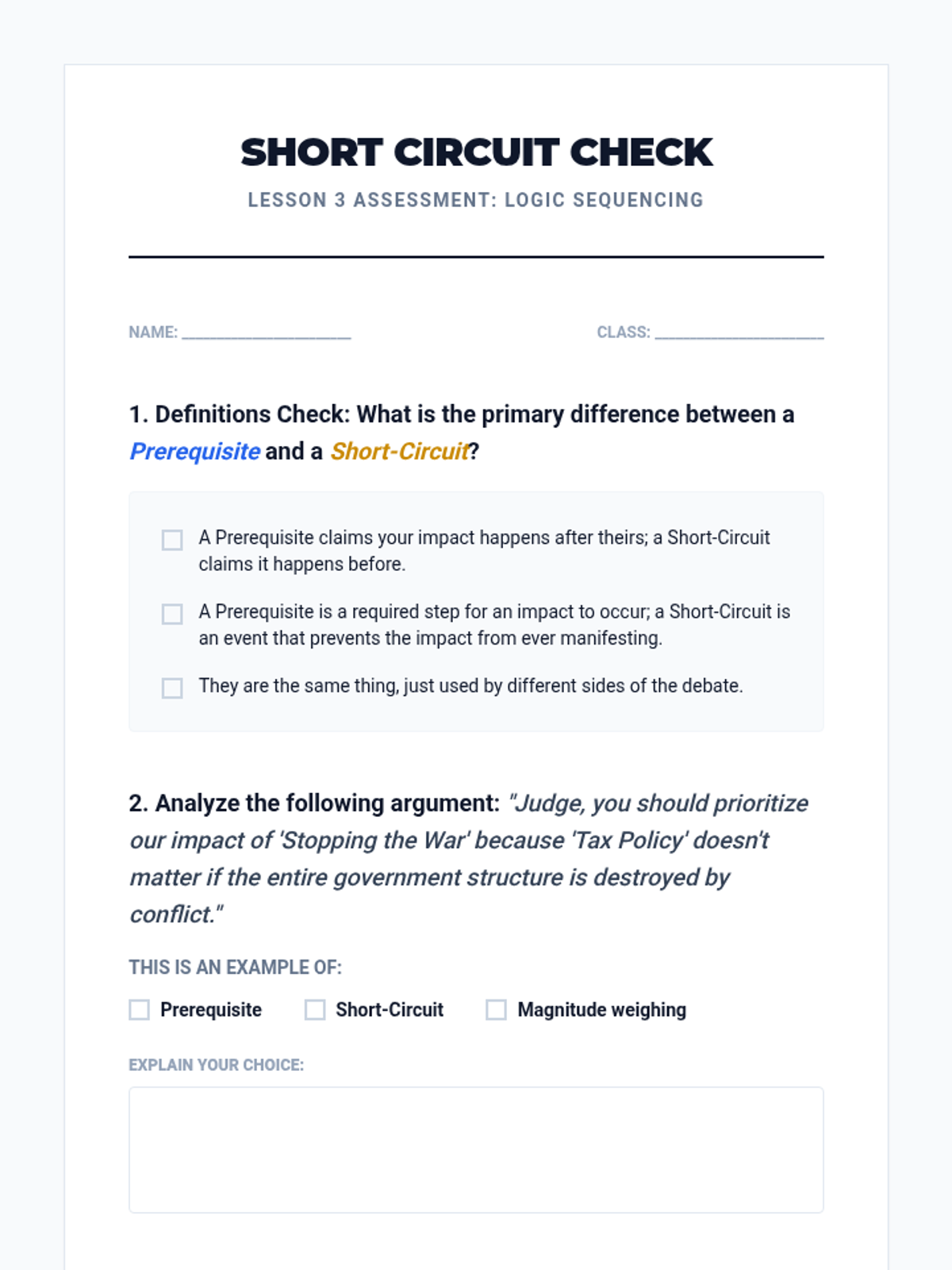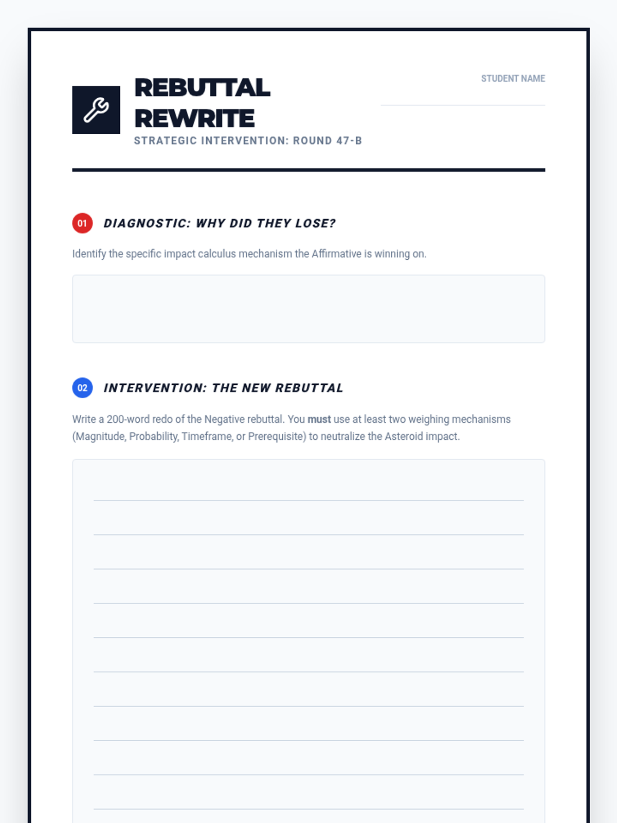 A high-stakes, game-based sequence designed to master impact calculus in competitive debate. Students progress from basic weighing to complex logical turns and meta-weighing strategies to win the rebuttal round.