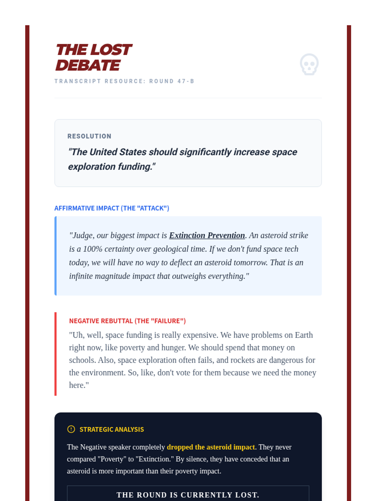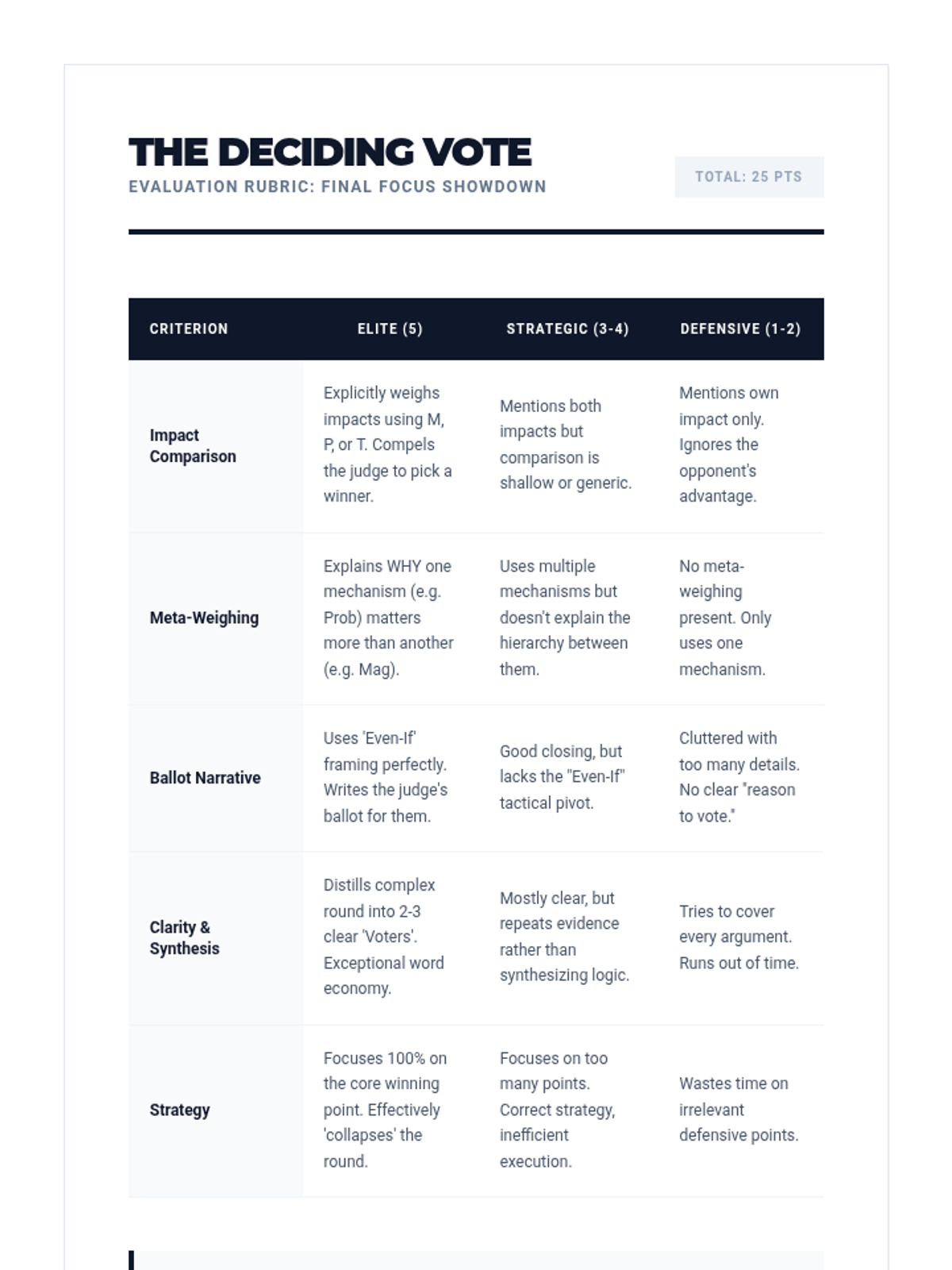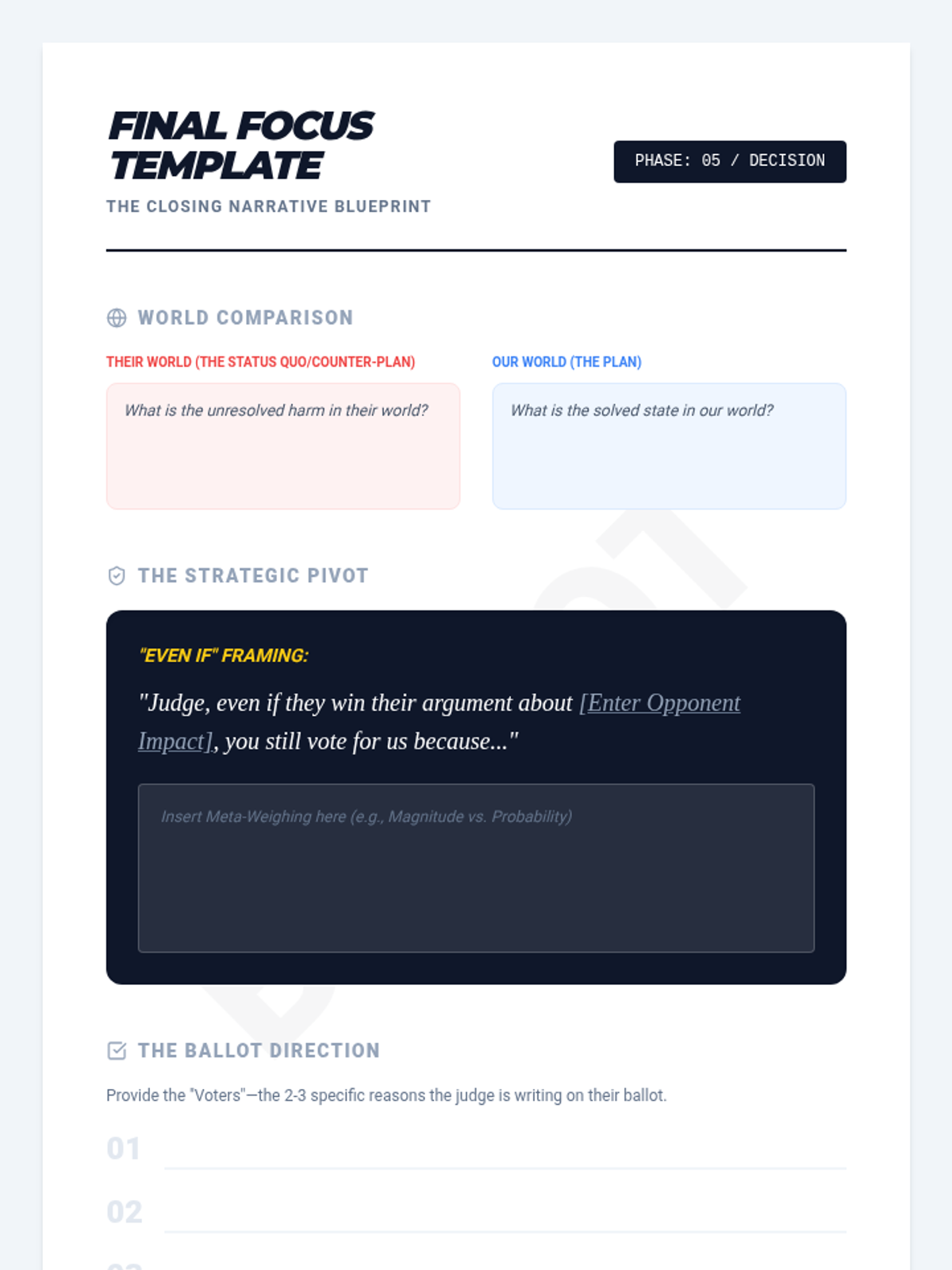 A high-stakes, game-based sequence designed to master impact calculus in competitive debate. Students progress from basic weighing to complex logical turns and meta-weighing strategies to win the rebuttal round.