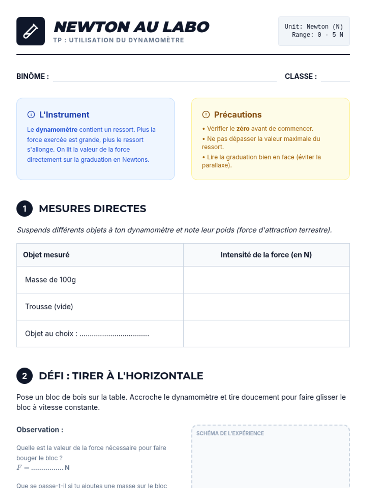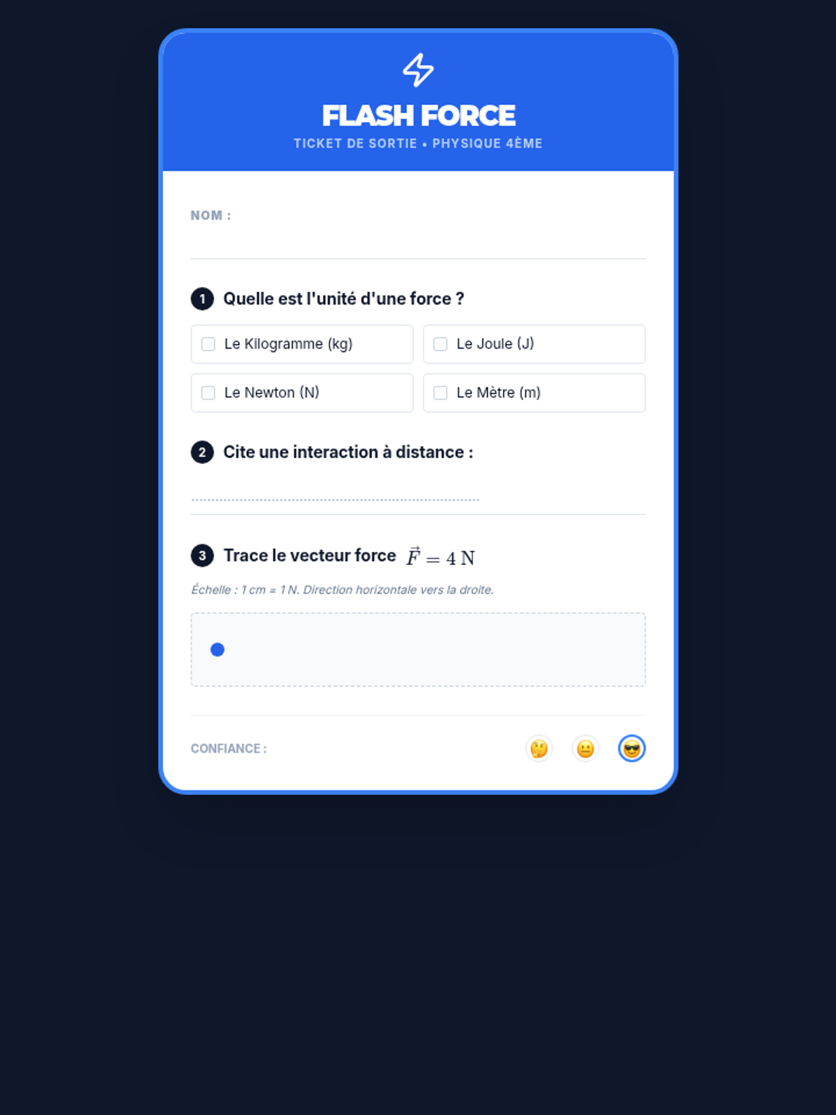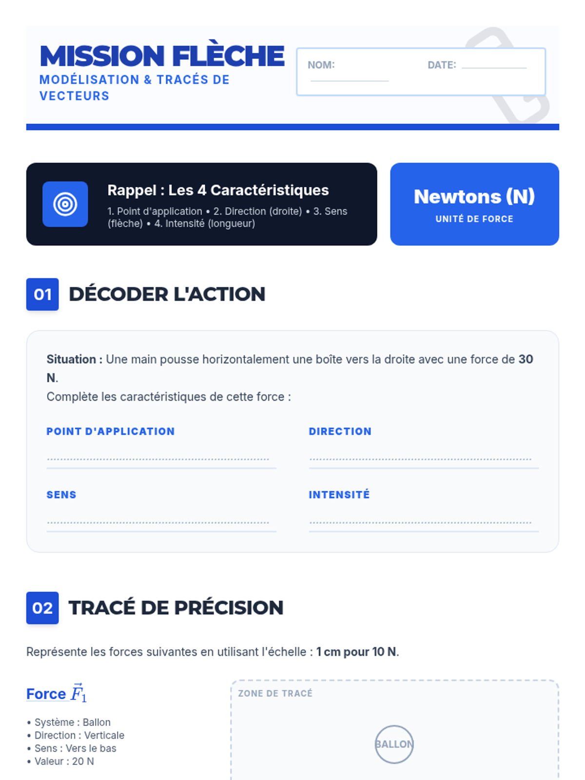 Une séquence complète sur les forces et les interactions pour le niveau 4ème, centrée sur la modélisation par des vecteurs. Les élèves explorent les types d'interactions, apprennent à représenter les forces par des segments fléchés et utilisent le dynamomètre.