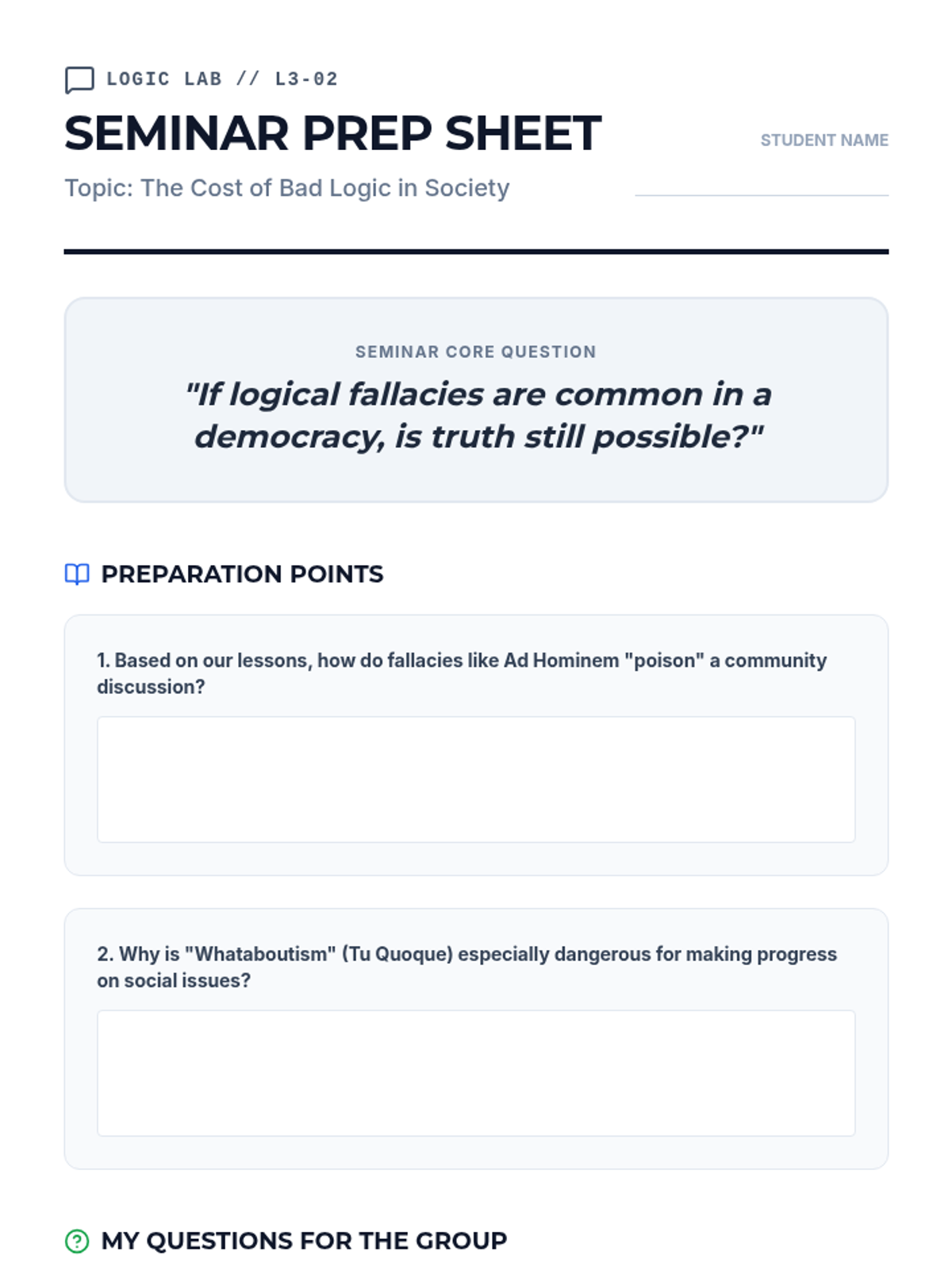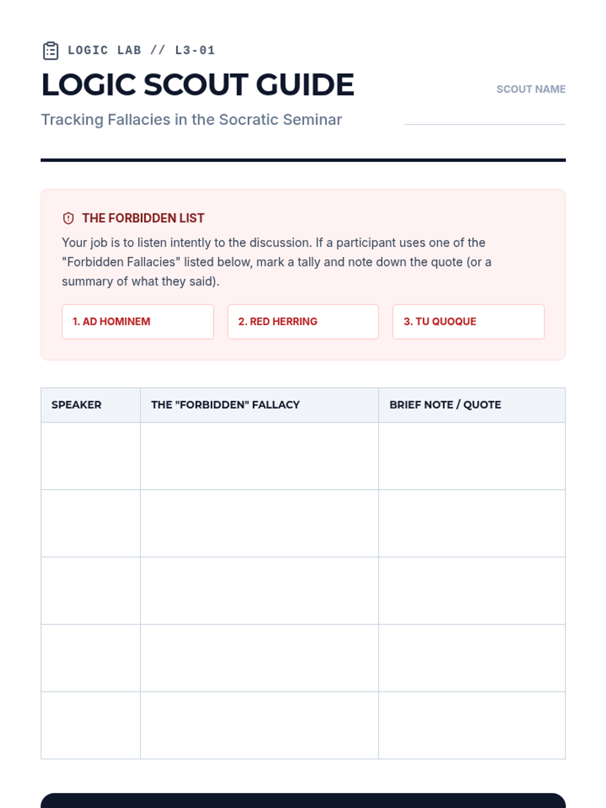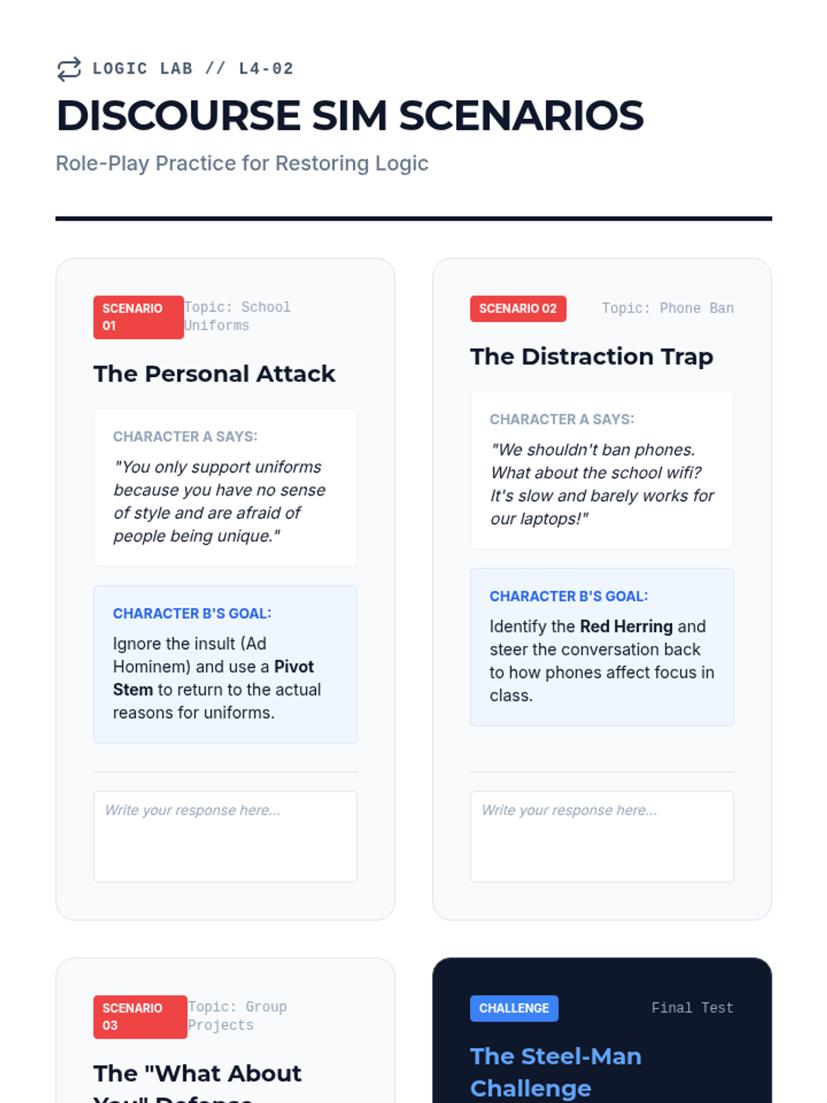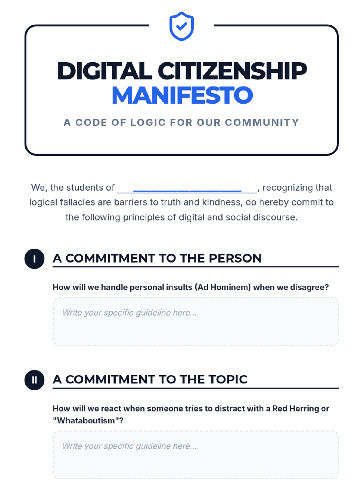 A middle school ELA unit focusing on the social impact of logical fallacies. Students analyze digital discourse, learn to identify 'whataboutism', practice Socratic discussion, and develop strategies for 'steel-manning' arguments to foster healthier community conversations.