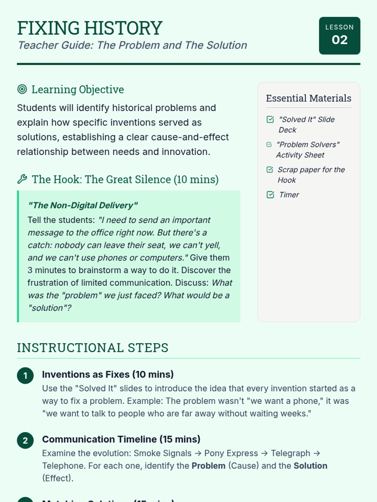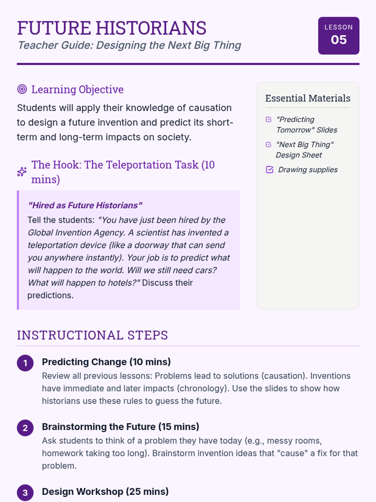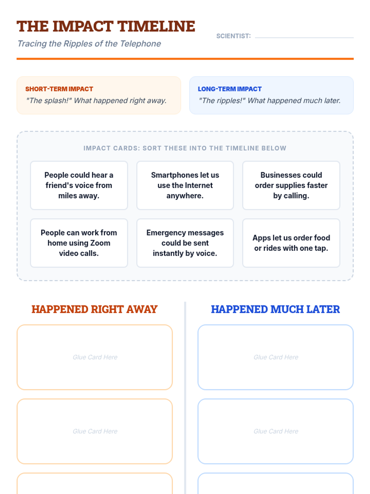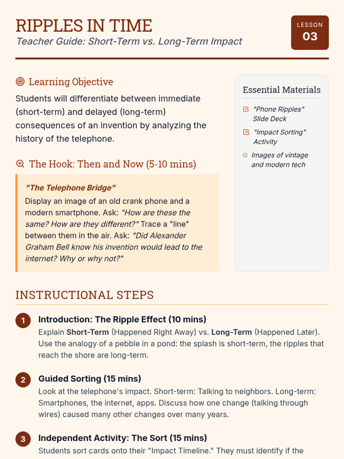 A 2nd-grade project-based sequence exploring how inventions like the lightbulb, telephone, and car have reshaped daily life over time through the lens of chronology and causation.