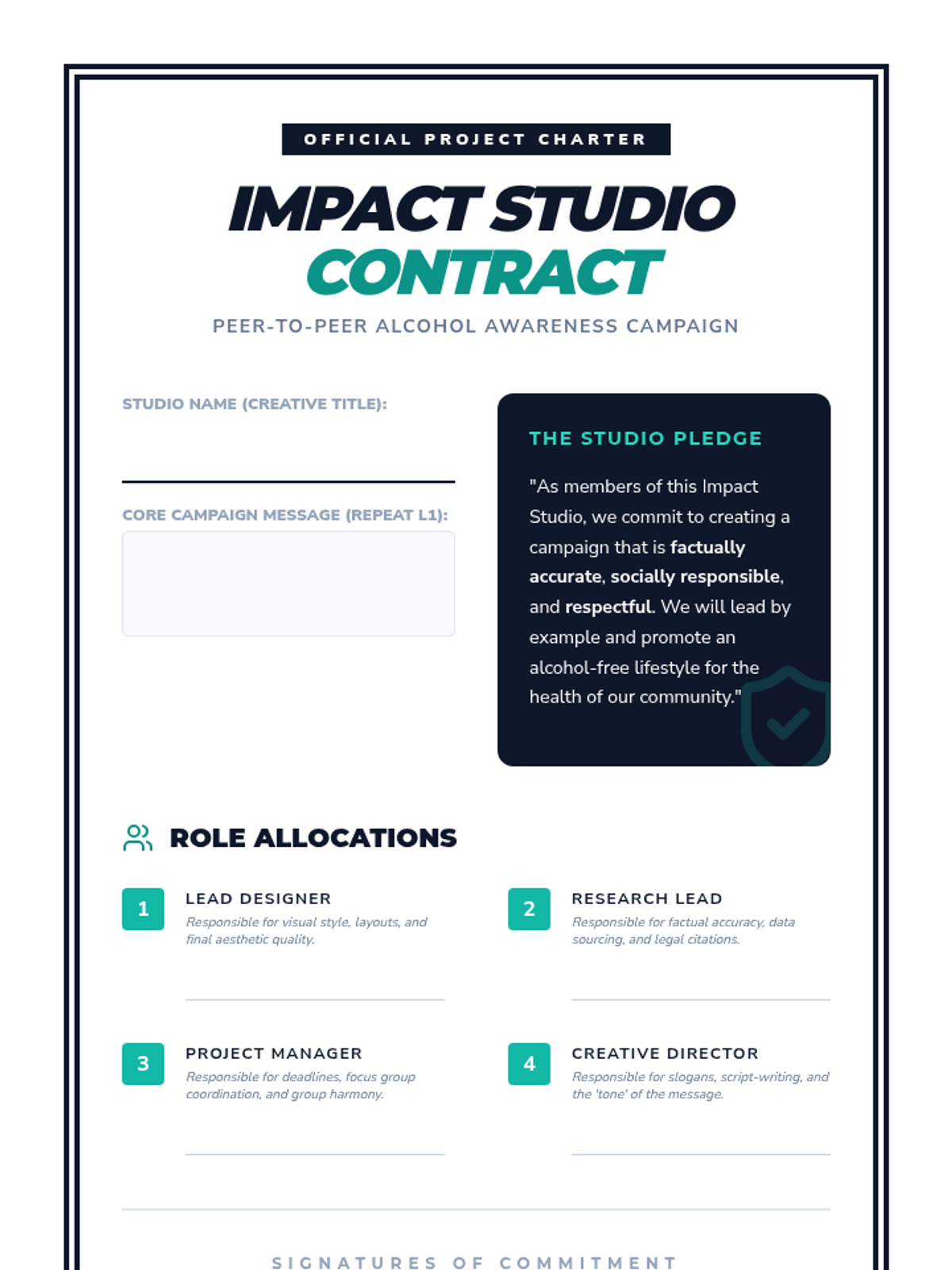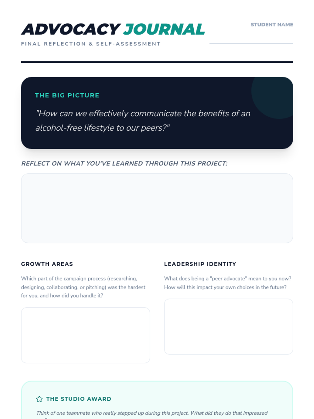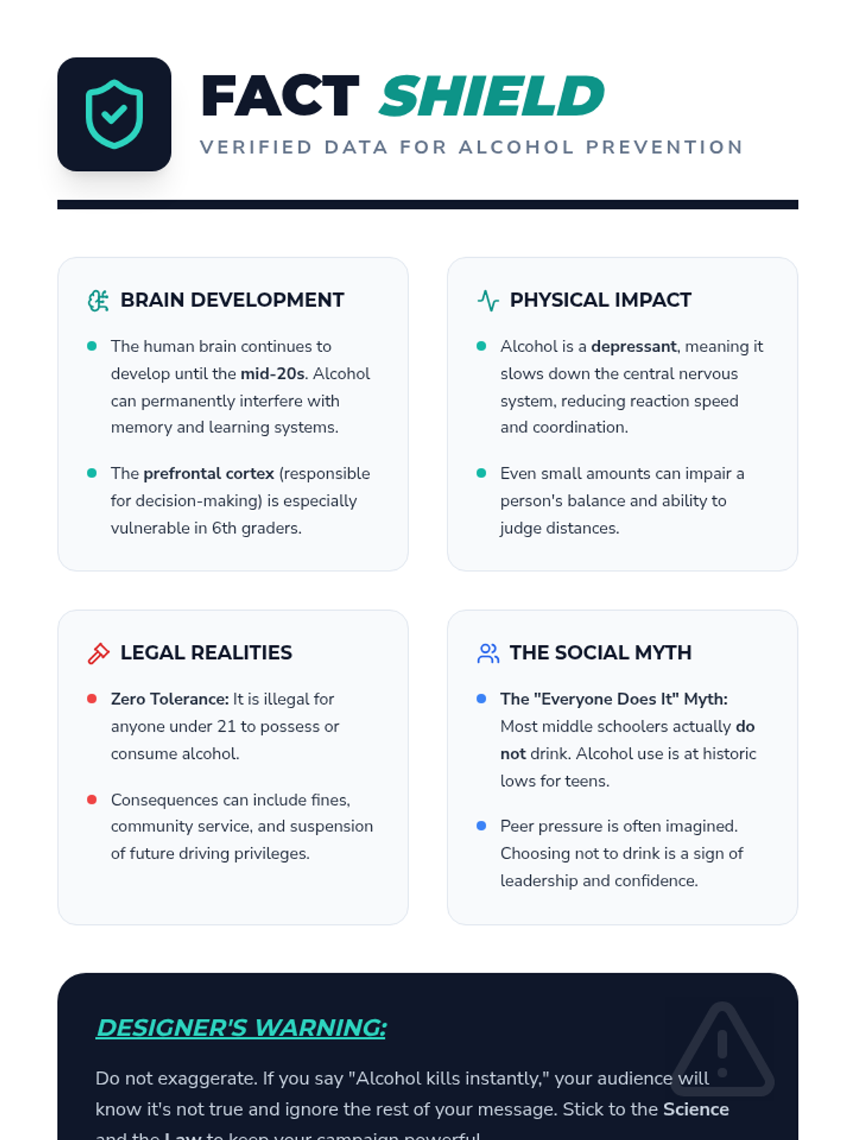 This project-based sequence empowers 6th-grade students to become alcohol prevention advocates. Over five lessons, students analyze health facts, select communication mediums, and design community-facing awareness campaigns to promote an alcohol-free lifestyle to their peers.